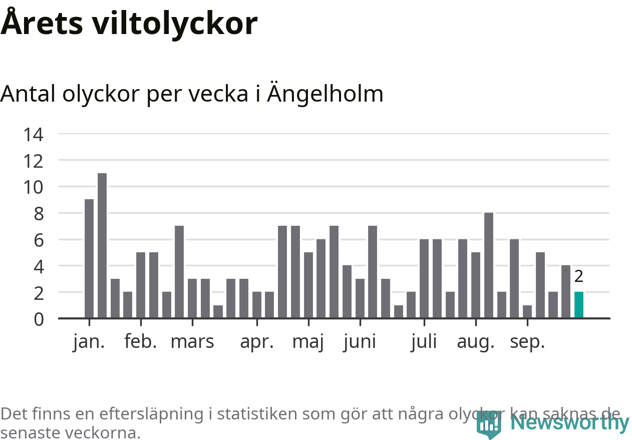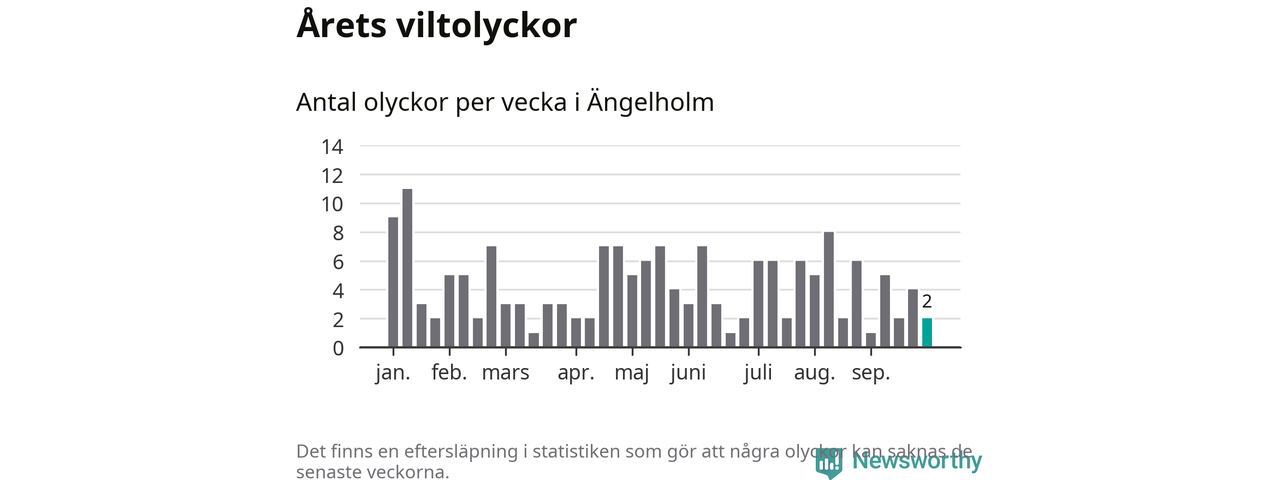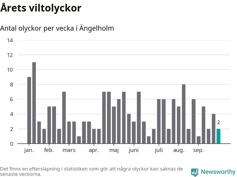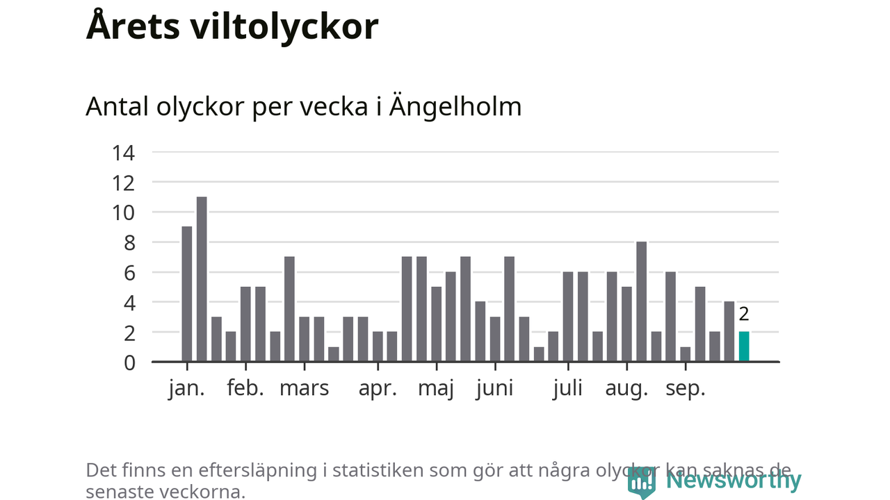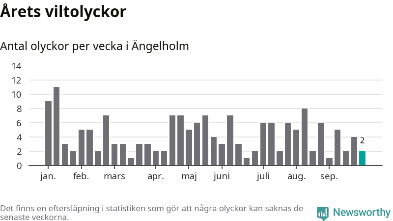Hittills har två viltolyckor rapporterats in i Ängelholms kommun från vecka 40. Se listan här.
