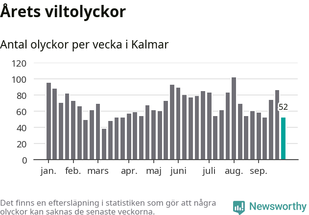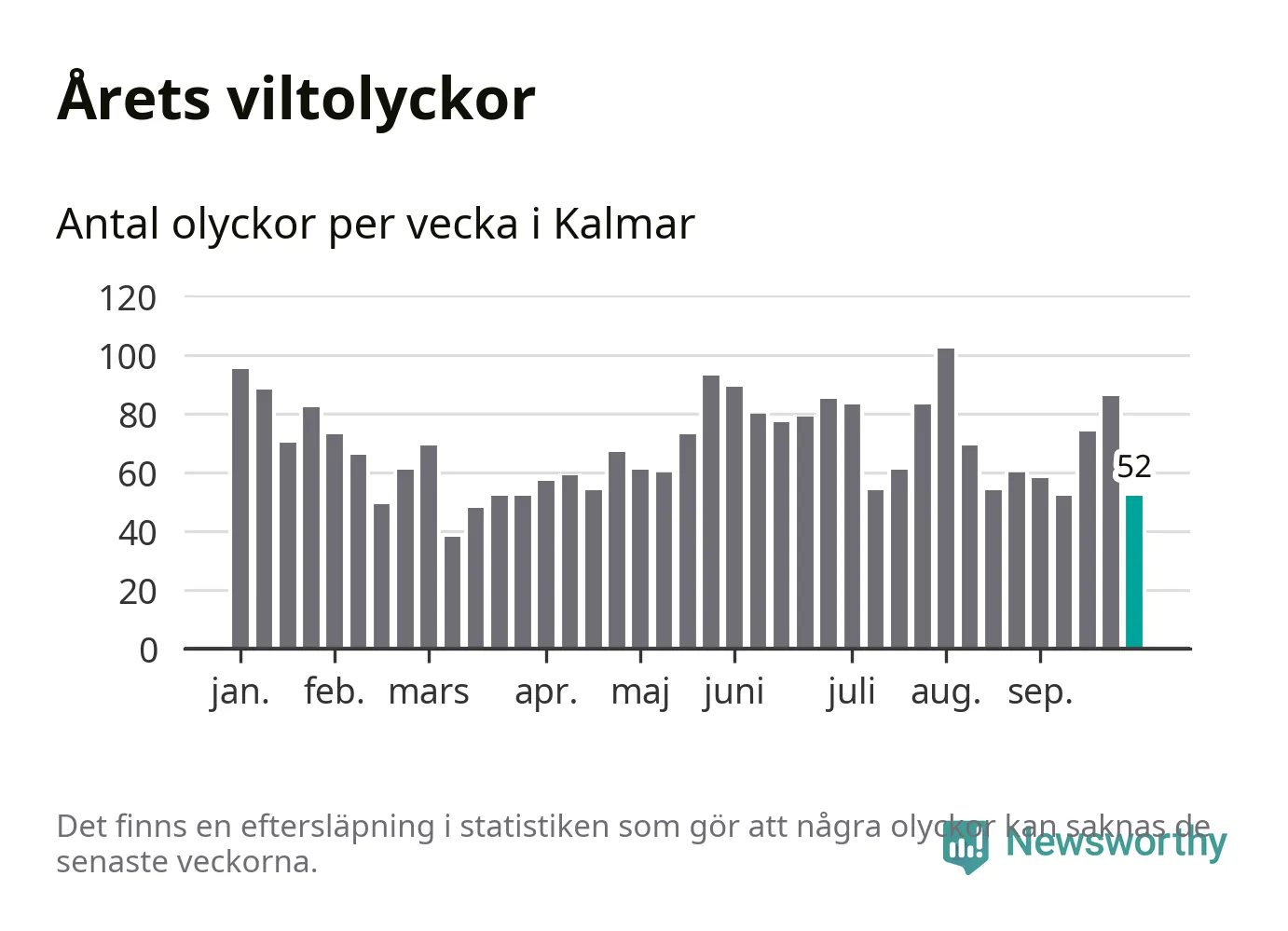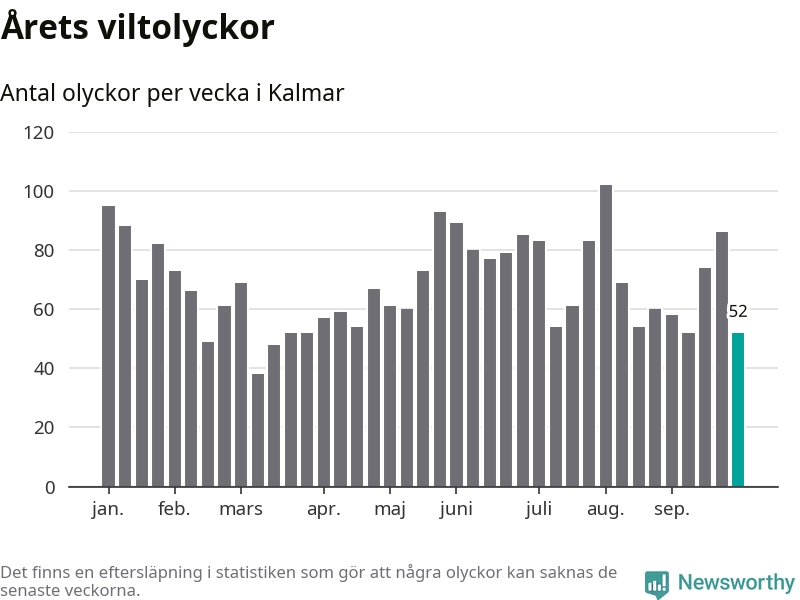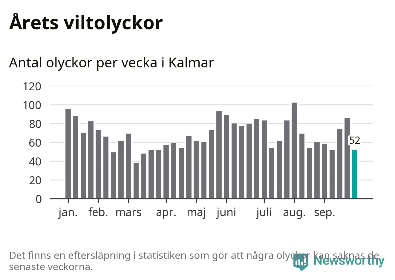 Hittills har 52 viltolyckor rapporterats in i Kalmar län från vecka 40. Se listan här.