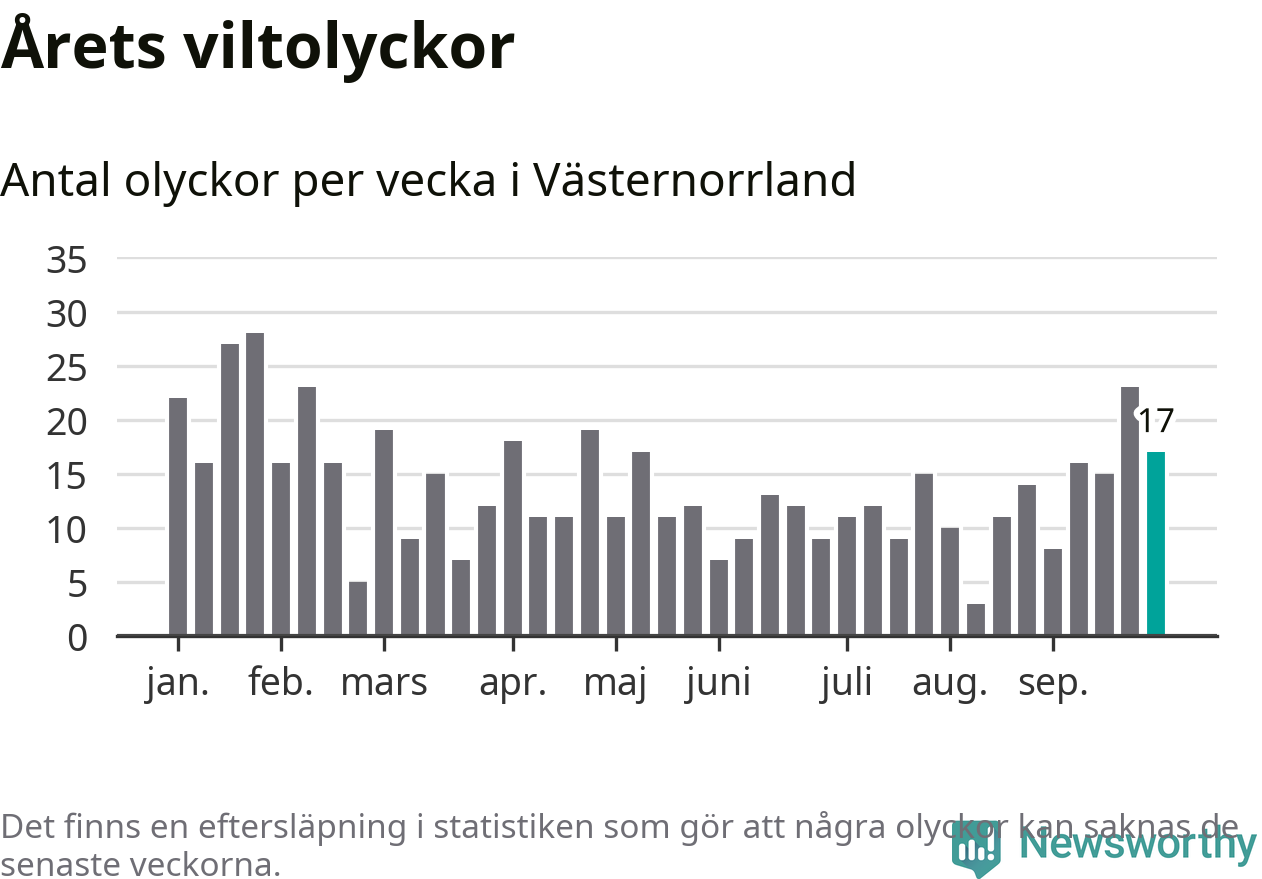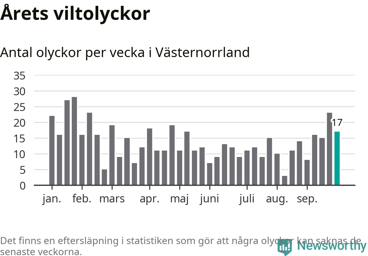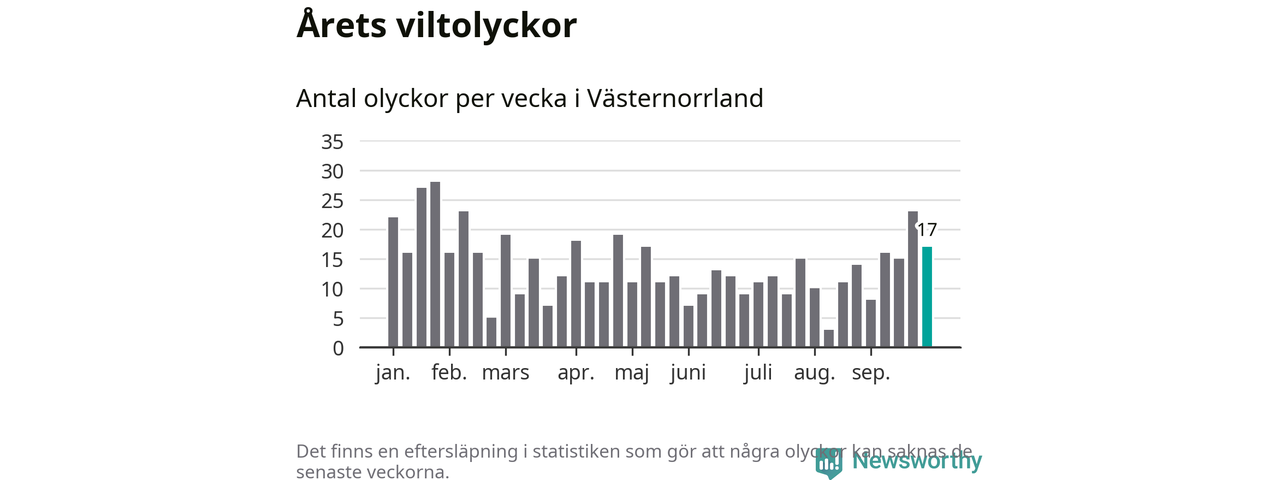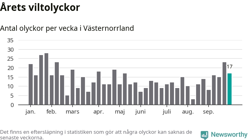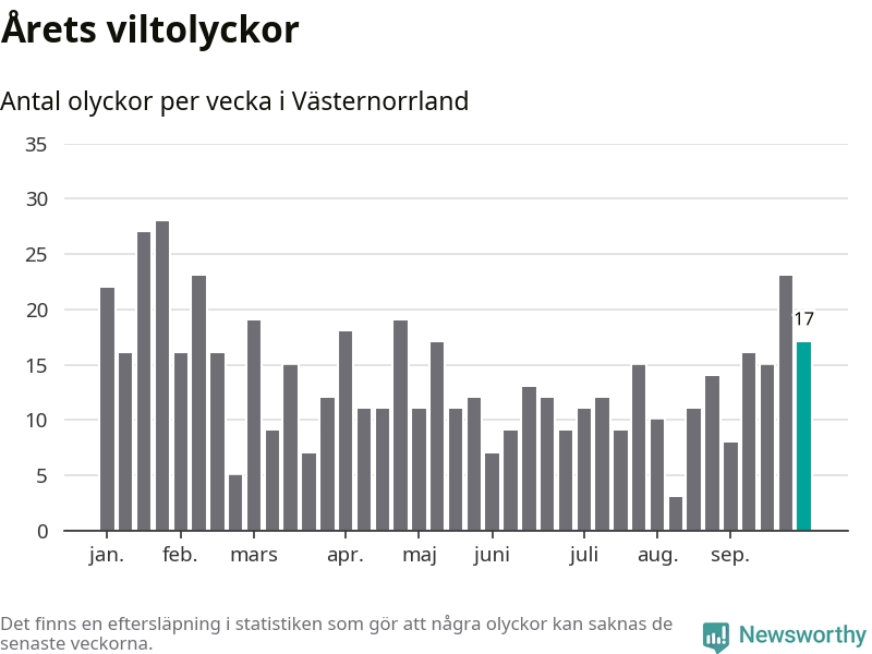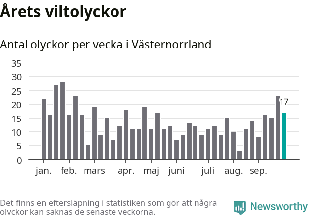 Hittills har 17 viltolyckor rapporterats in i Västernorrlands län från vecka 40. Se listan här.