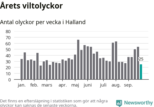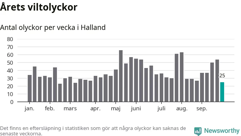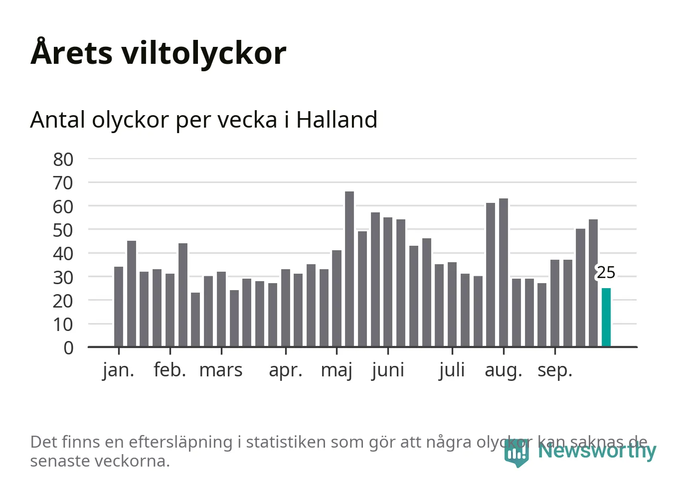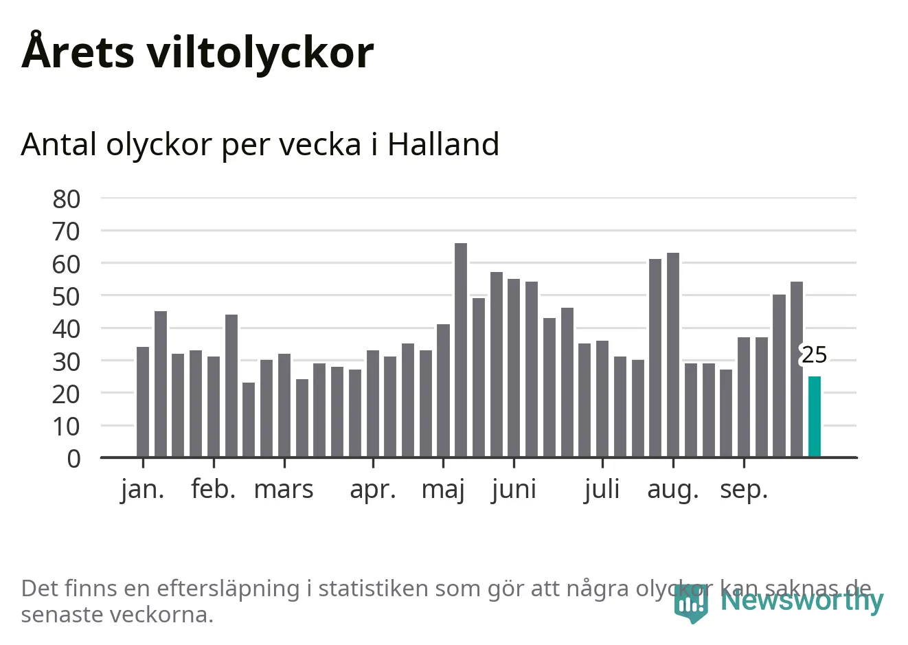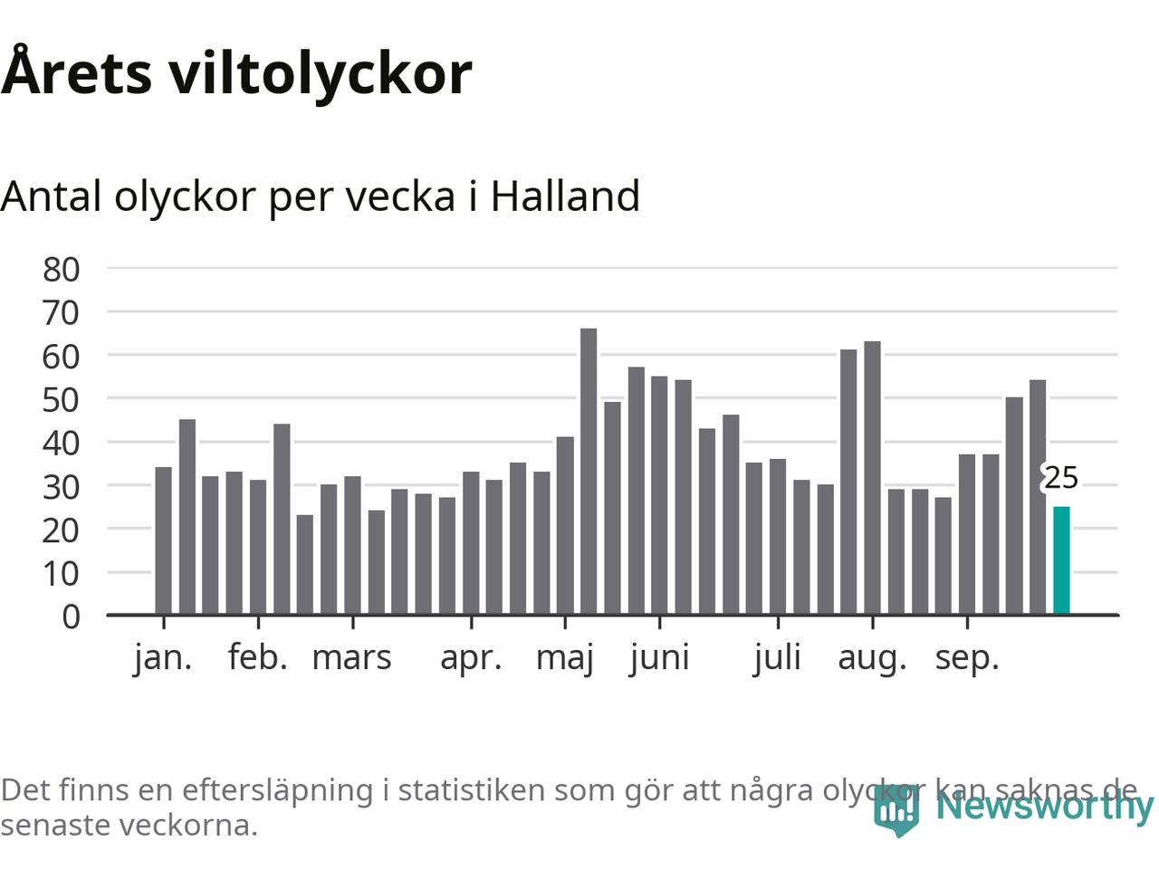 Hittills har 25 viltolyckor rapporterats in i Hallands län från vecka 40. Se listan här.