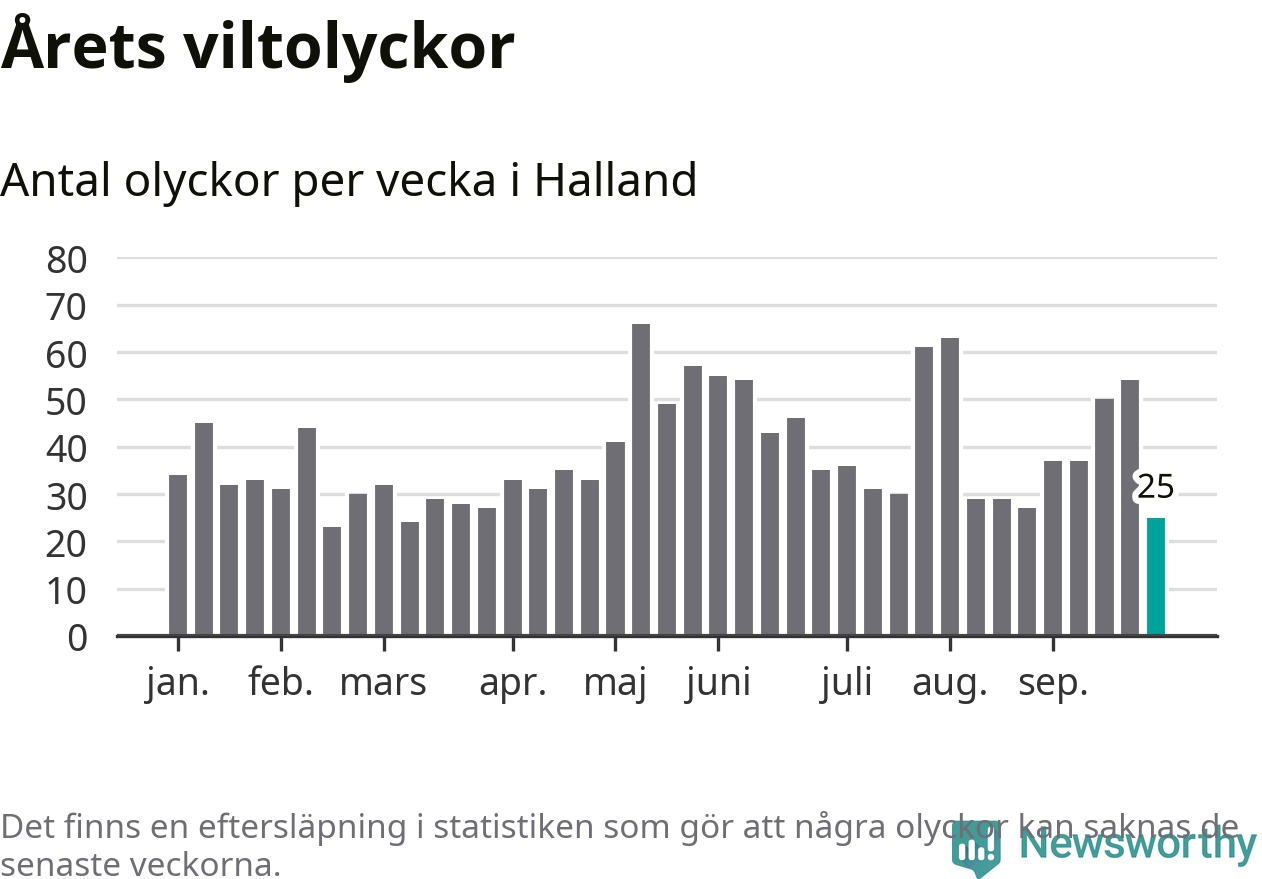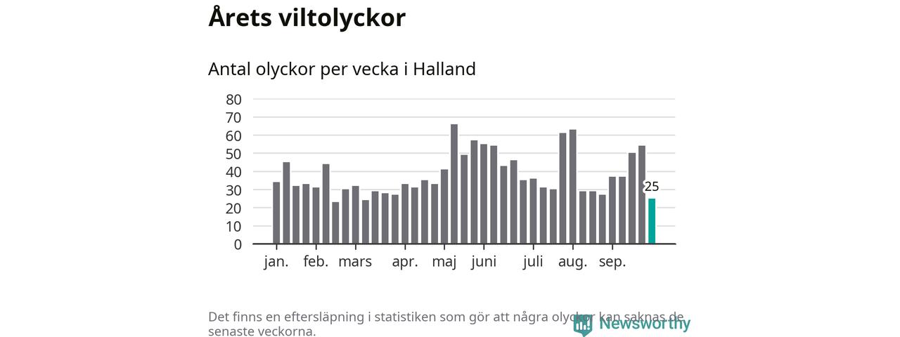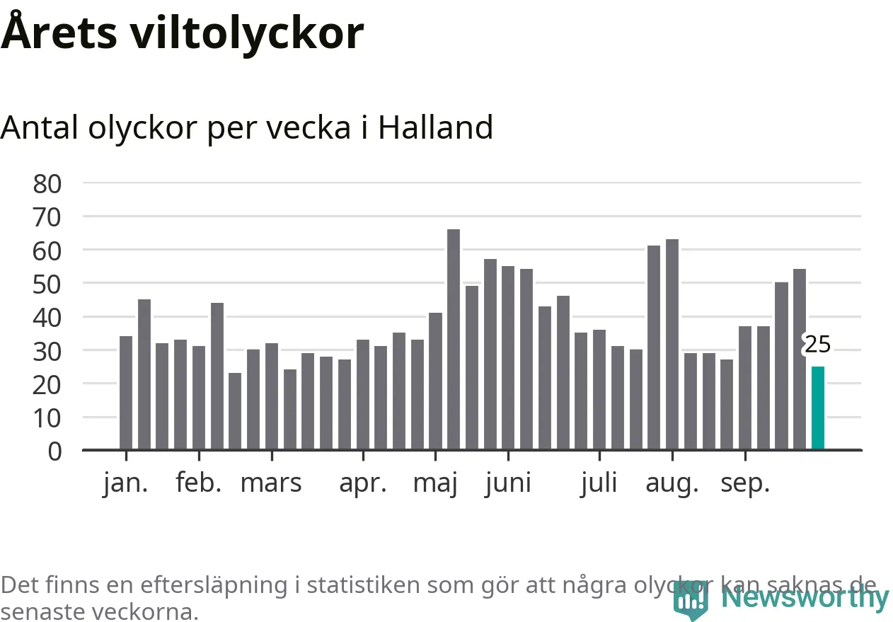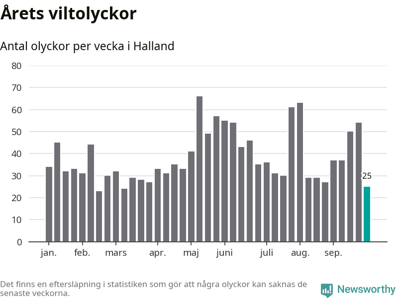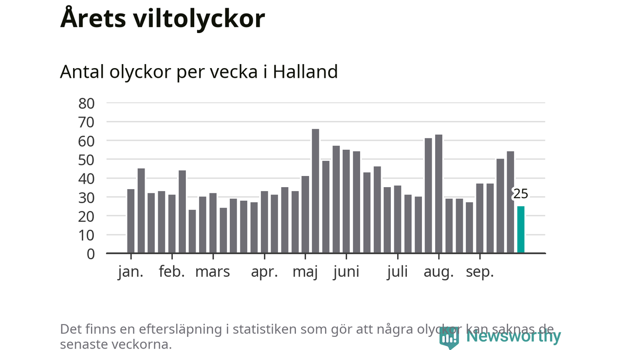 Hittills har 25 viltolyckor rapporterats in i Hallands län från vecka 40. Se listan här.