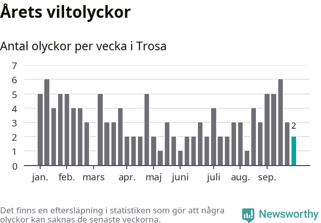 Hittills har två viltolyckor rapporterats in i Trosa kommun från vecka 40. Se listan här.