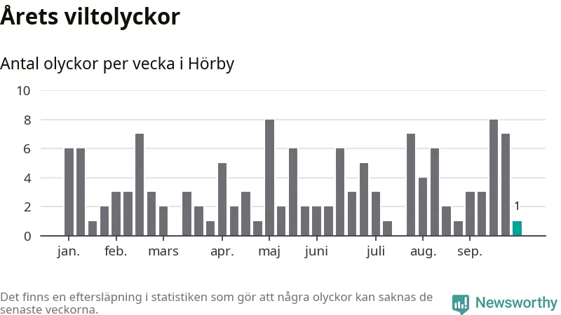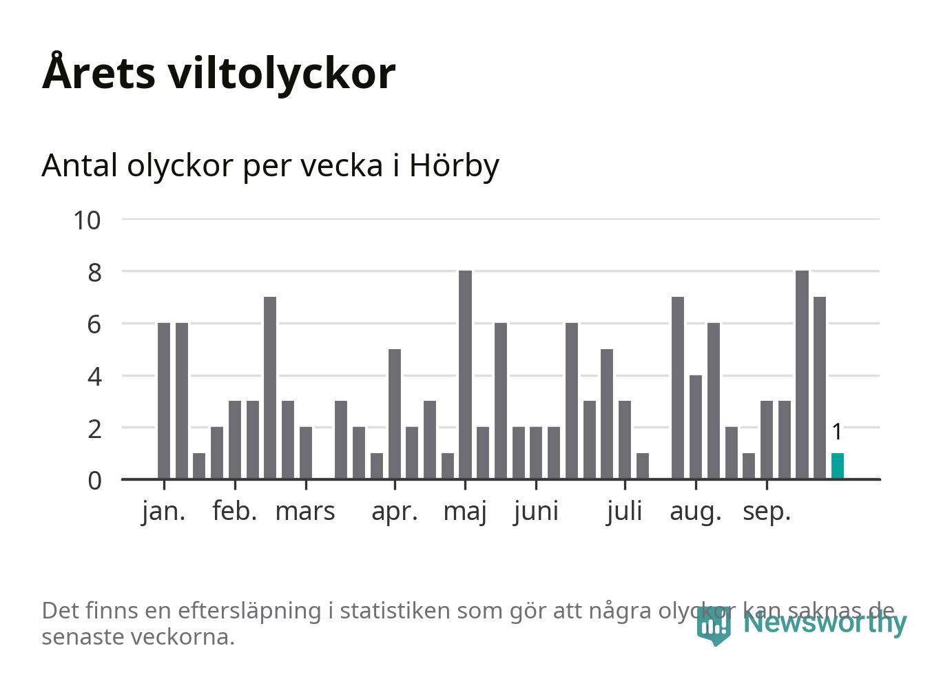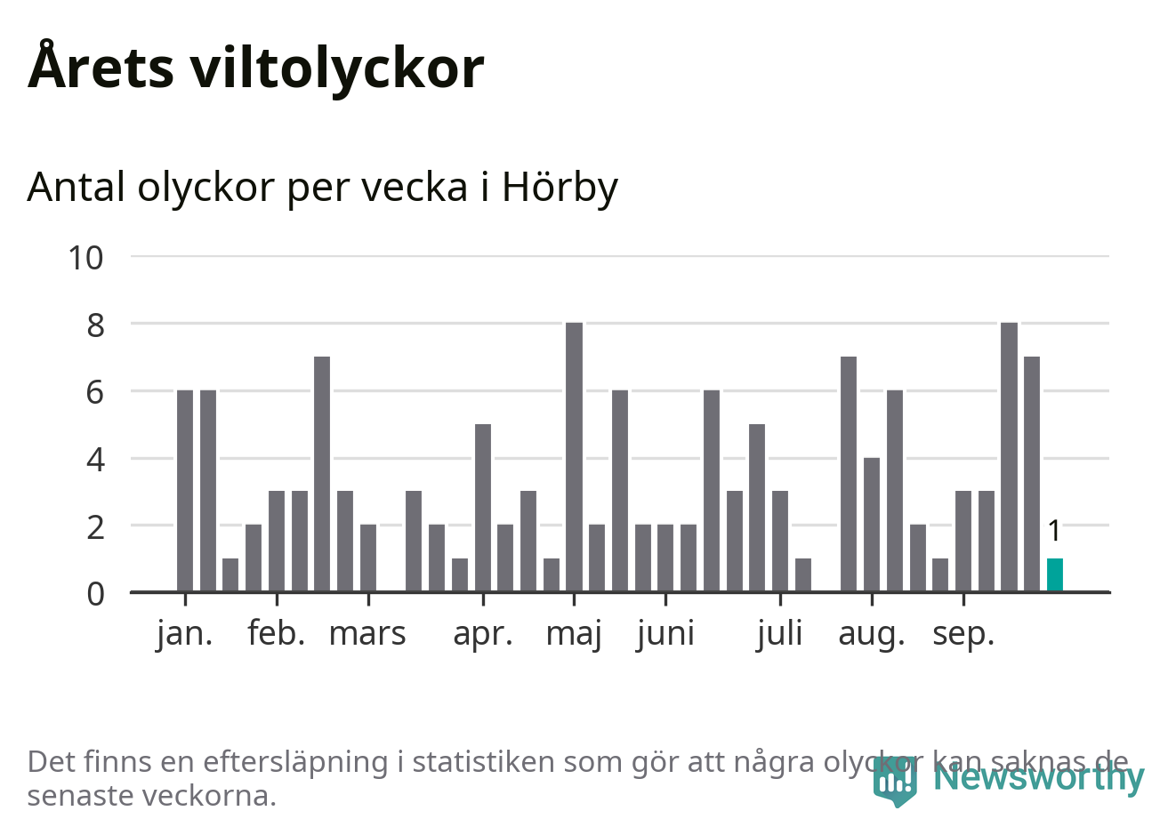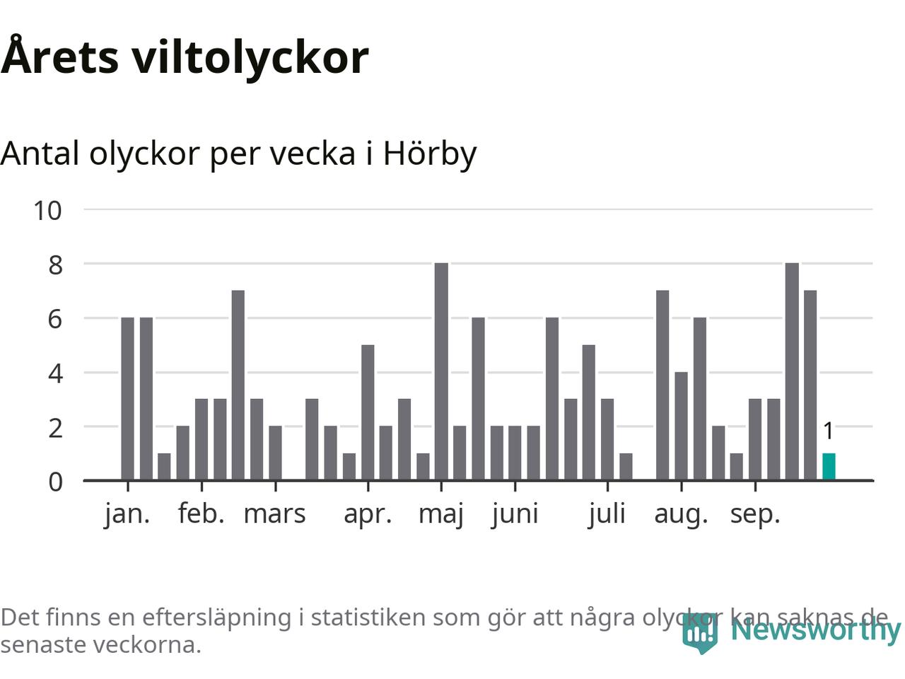 Från förra veckan (vecka 40) har hittills en viltolycka rapporterats in i Hörby kommun.