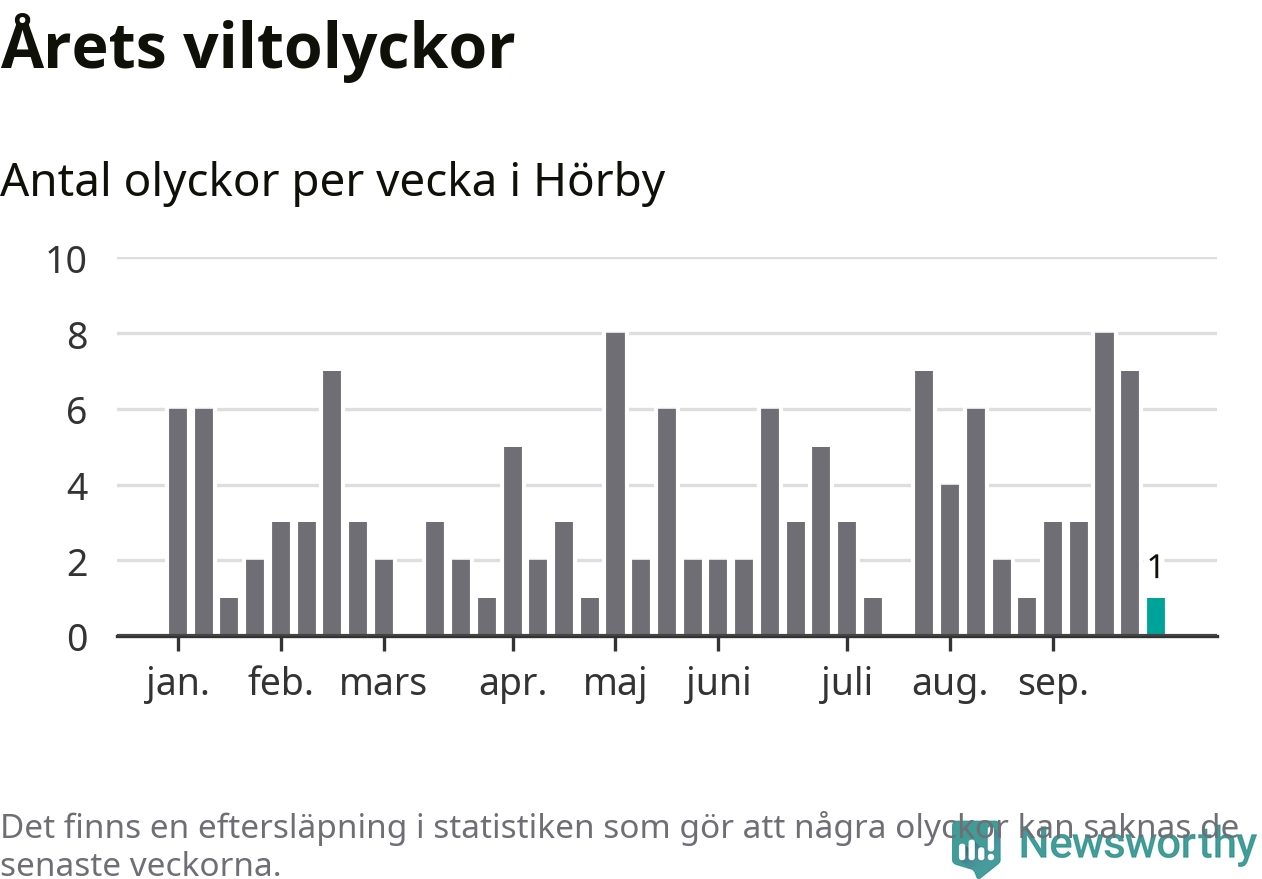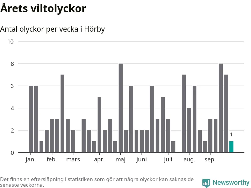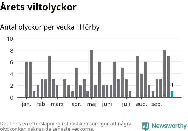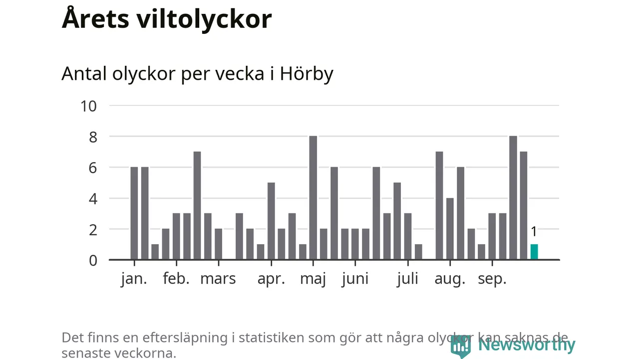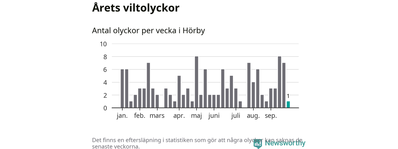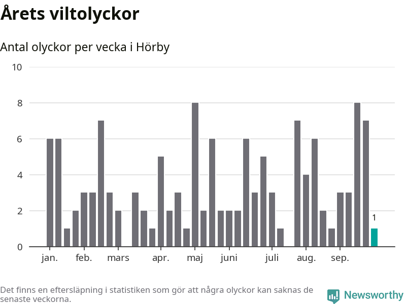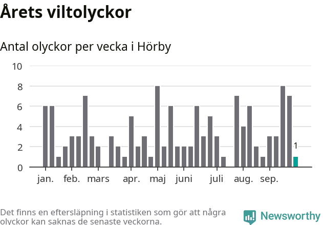 Från förra veckan (vecka 40) har hittills en viltolycka rapporterats in i Hörby kommun.