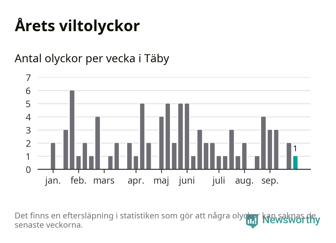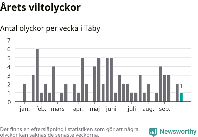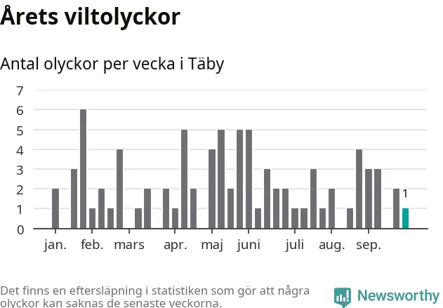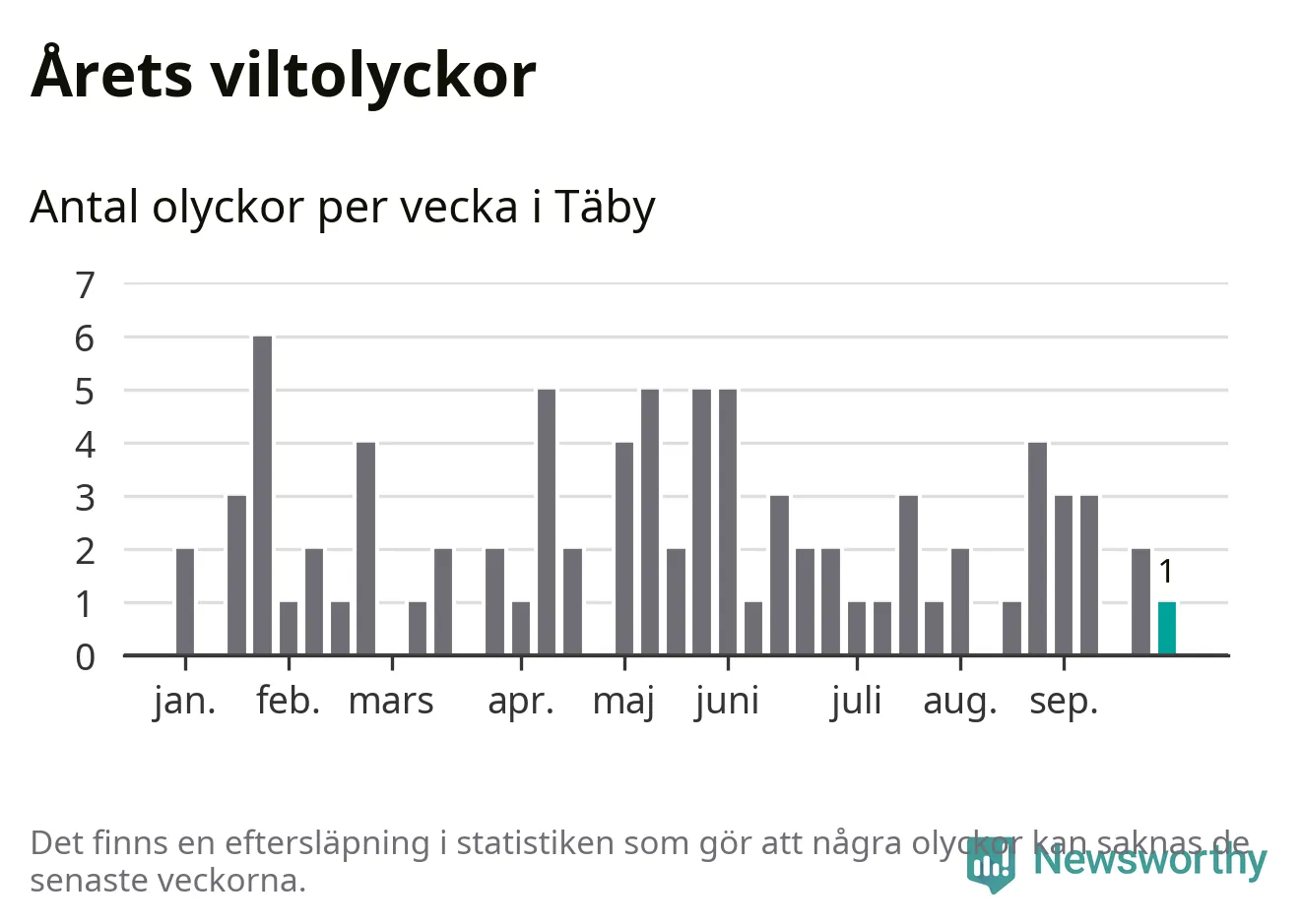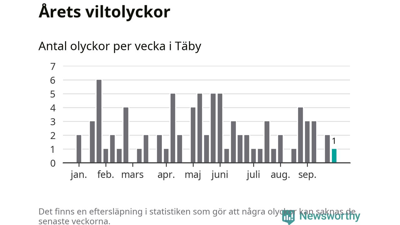 Från förra veckan (vecka 40) har hittills en viltolycka rapporterats in i Täby kommun.