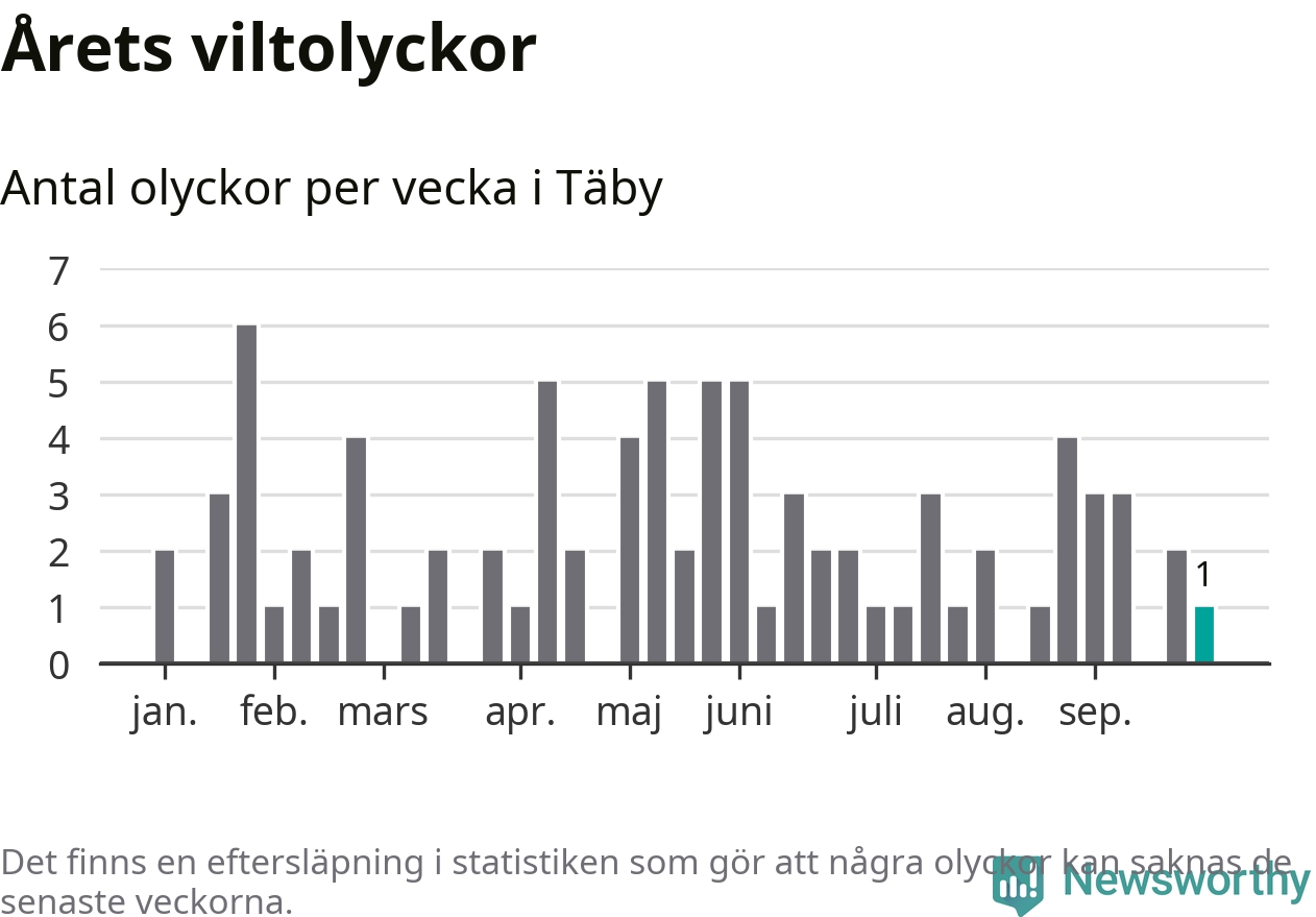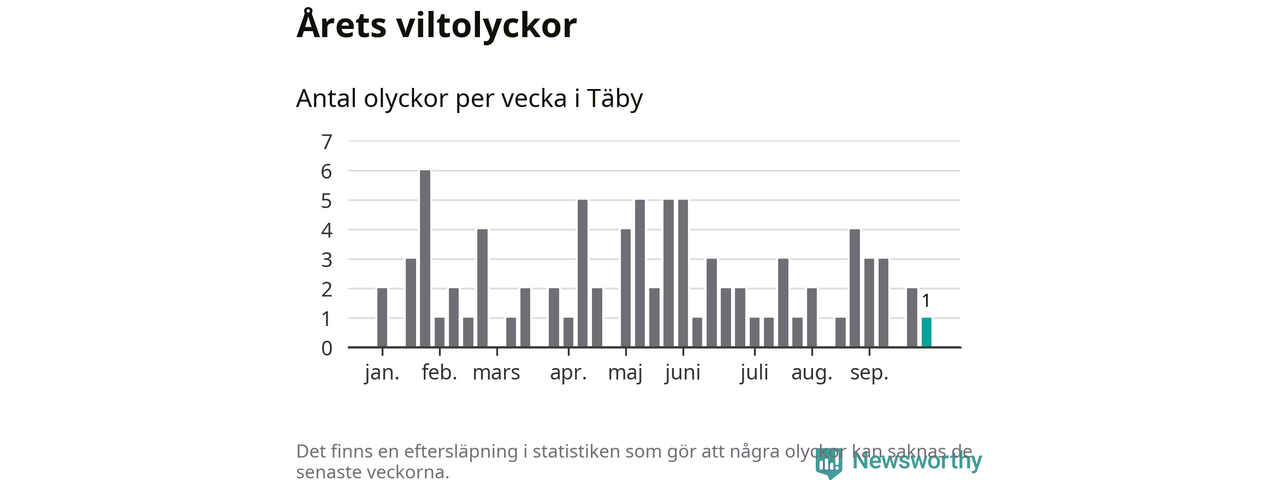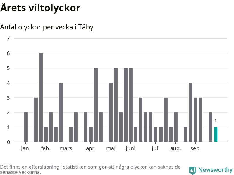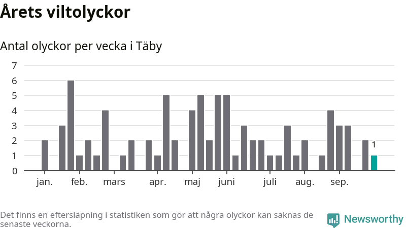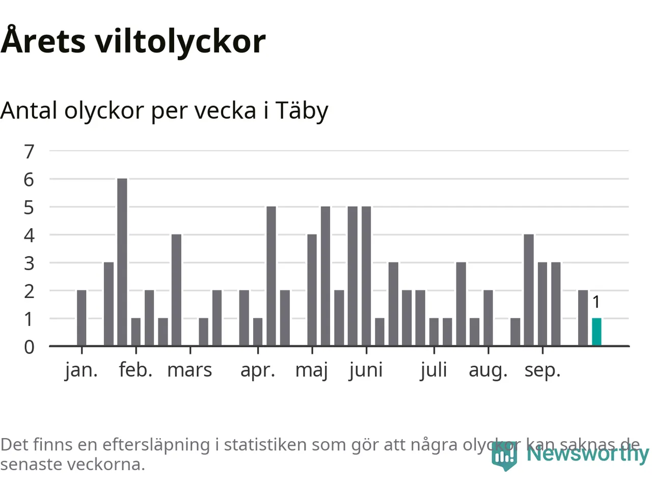 Från förra veckan (vecka 40) har hittills en viltolycka rapporterats in i Täby kommun.