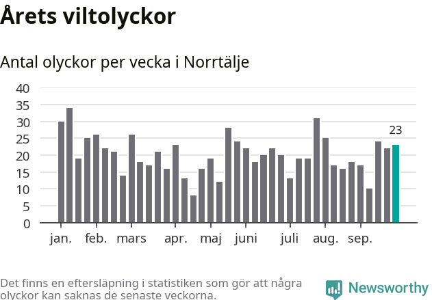 Hittills har 23 viltolyckor rapporterats in i Norrtälje kommun från vecka 40. Se listan här.