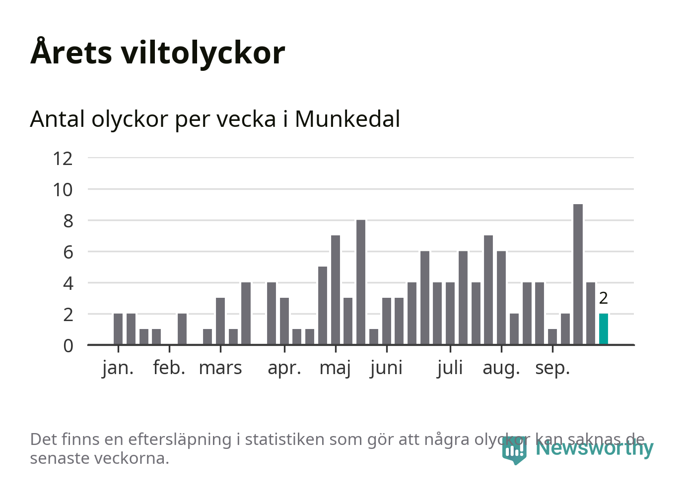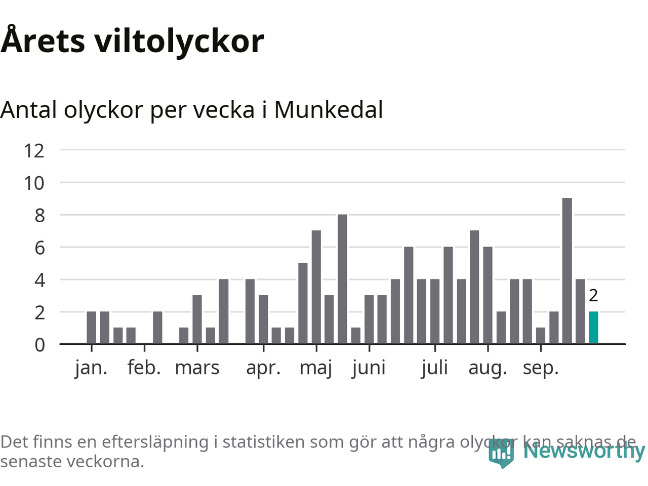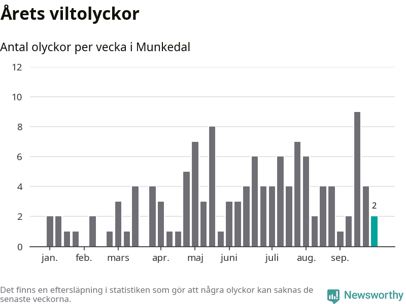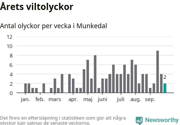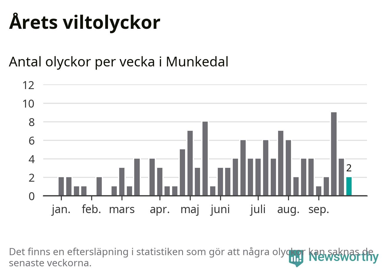 Hittills har två viltolyckor rapporterats in i Munkedals kommun från vecka 40. Se listan här.
