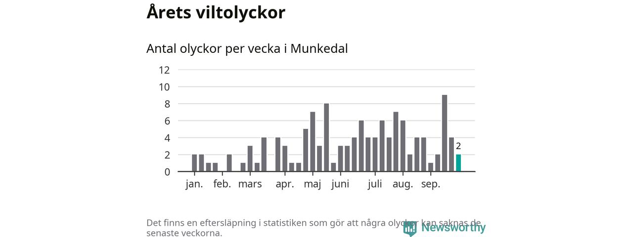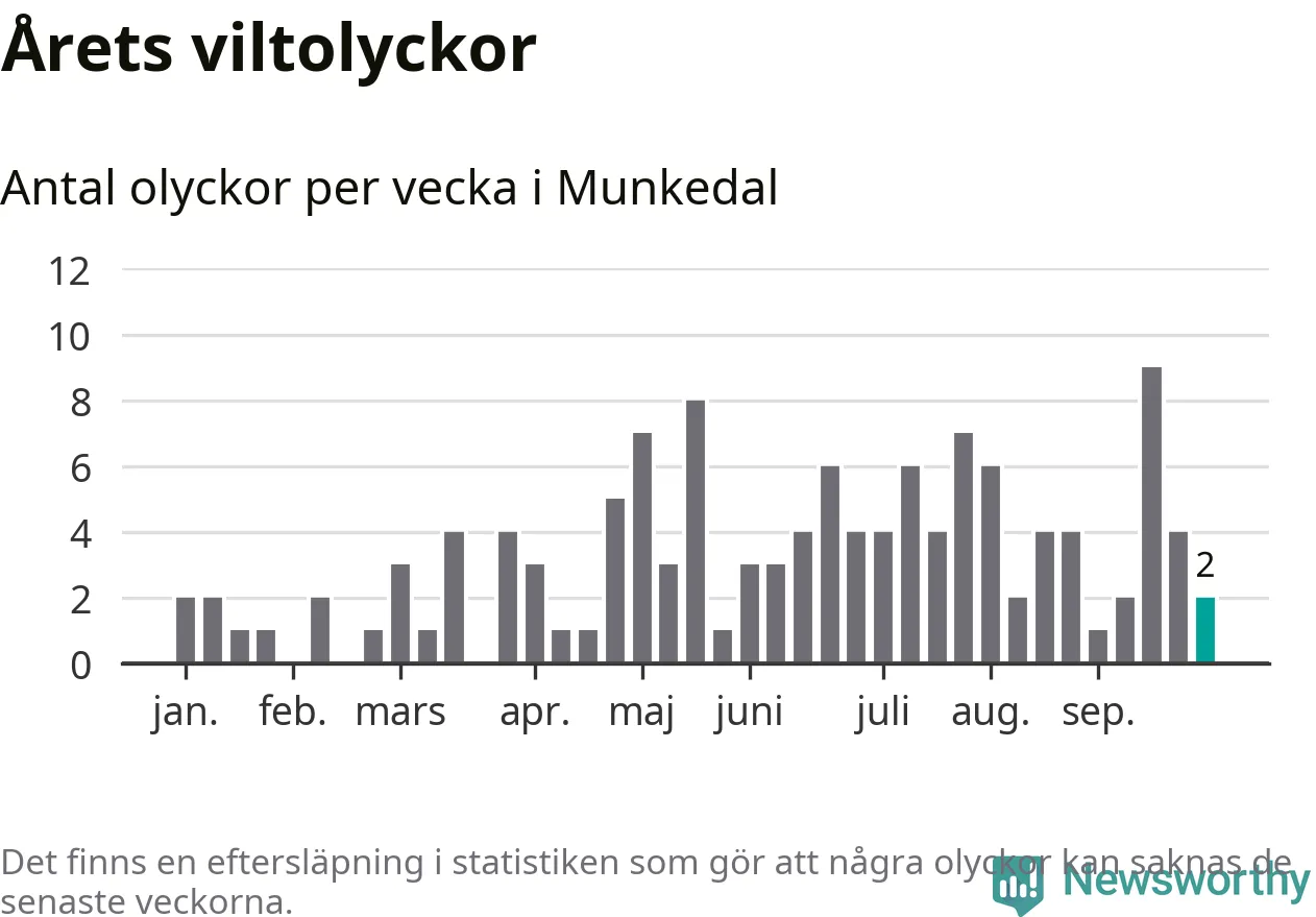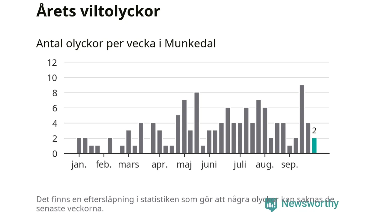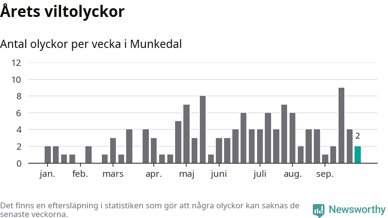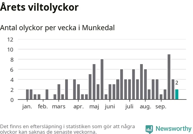 Hittills har två viltolyckor rapporterats in i Munkedals kommun från vecka 40. Se listan här.