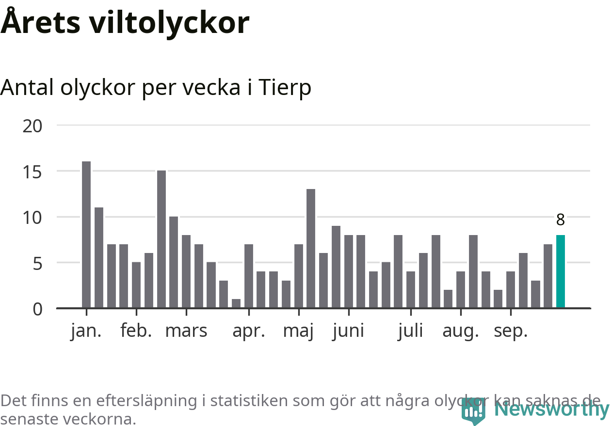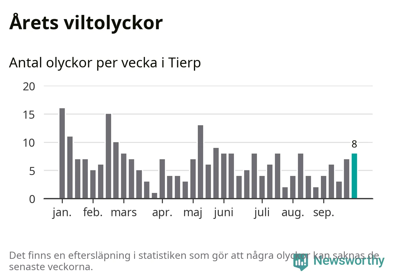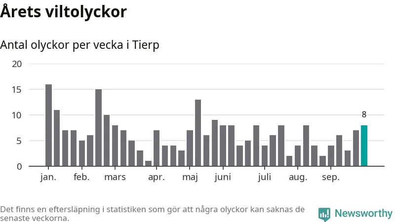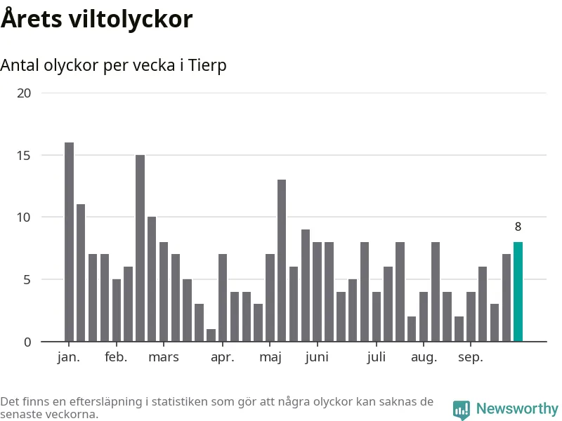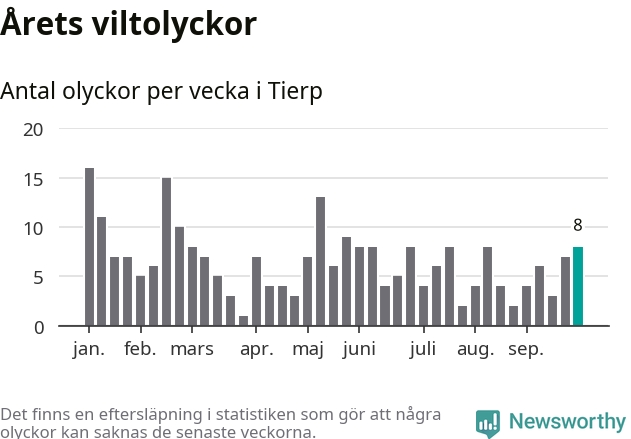 Hittills har åtta viltolyckor rapporterats in i Tierps kommun från vecka 40. Se listan här.