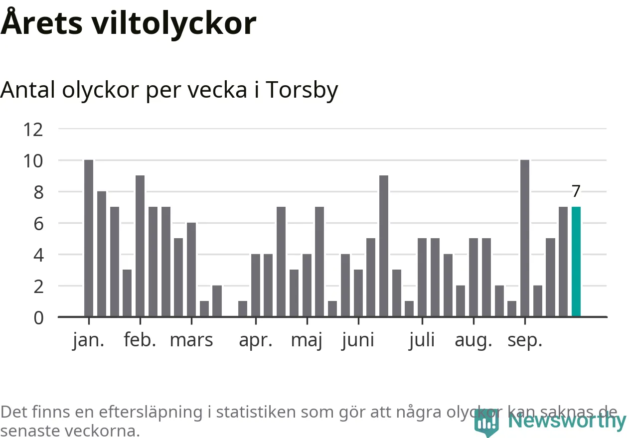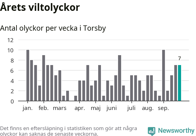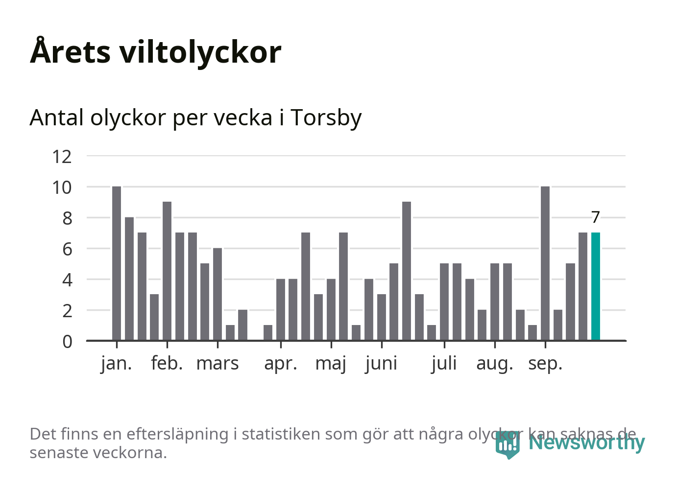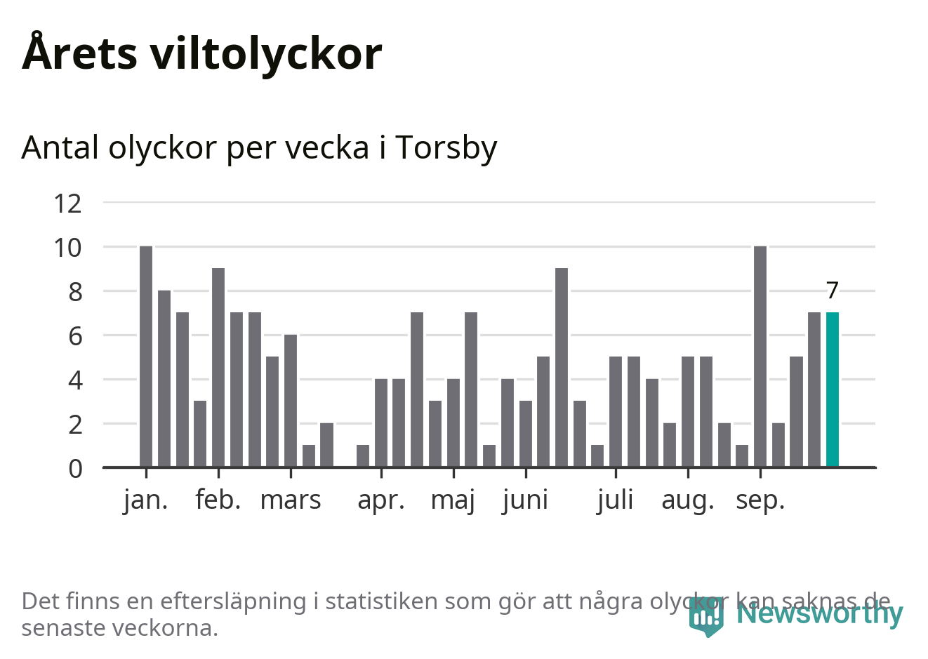 Totalt det här året har det inträffat 182 viltolyckor i kommunen. Det är mindre än genomsnittet för motsvarande period (omkring 219) de senaste tio åren.