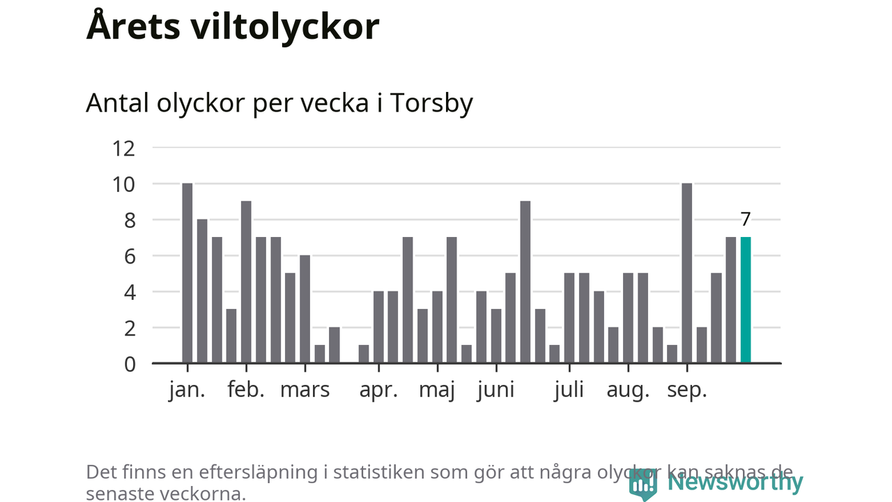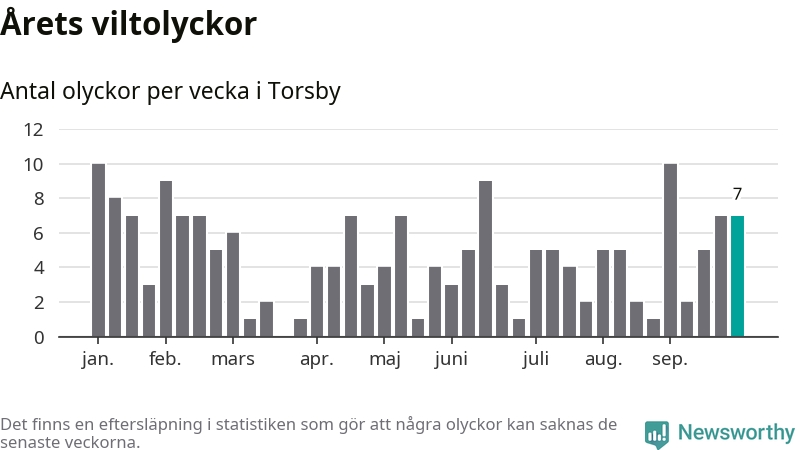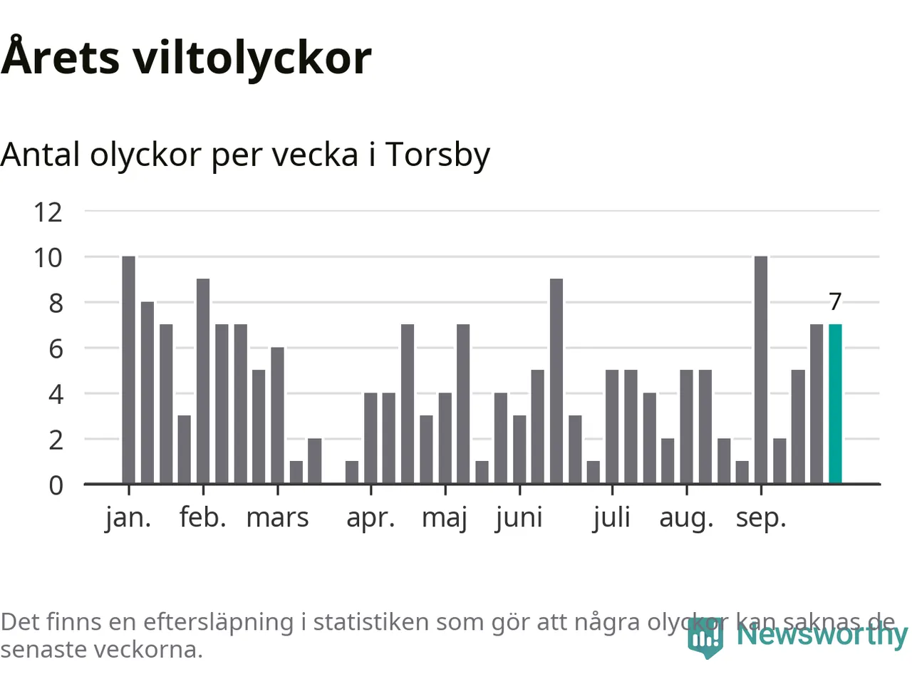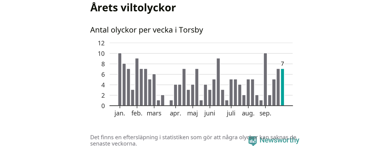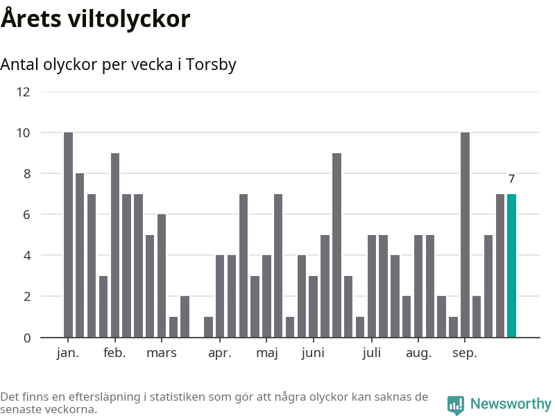 Totalt det här året har det inträffat 182 viltolyckor i kommunen. Det är mindre än genomsnittet för motsvarande period (omkring 219) de senaste tio åren.
