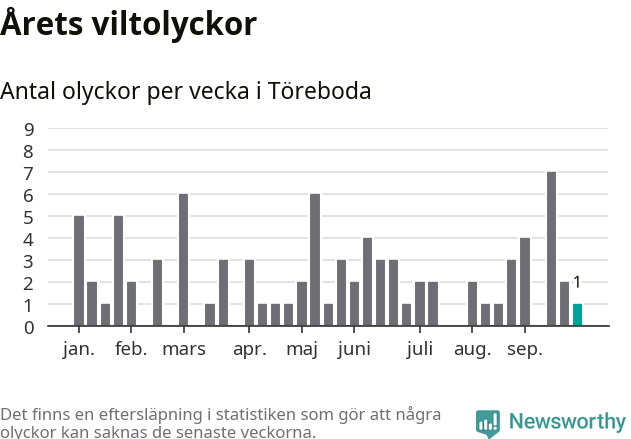 Från förra veckan (vecka 40) har hittills en viltolycka rapporterats in i Töreboda kommun.