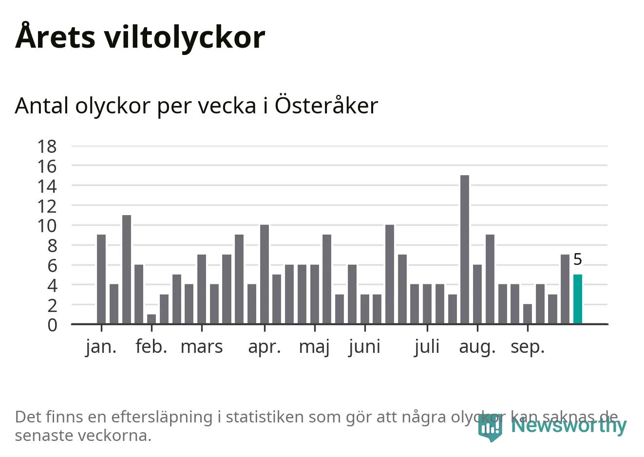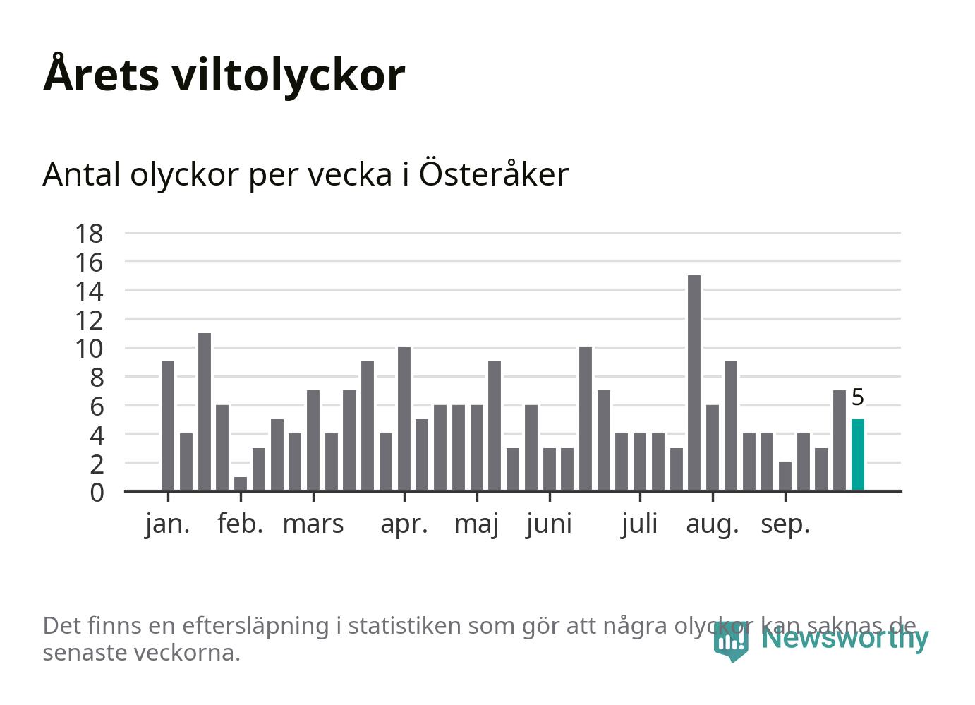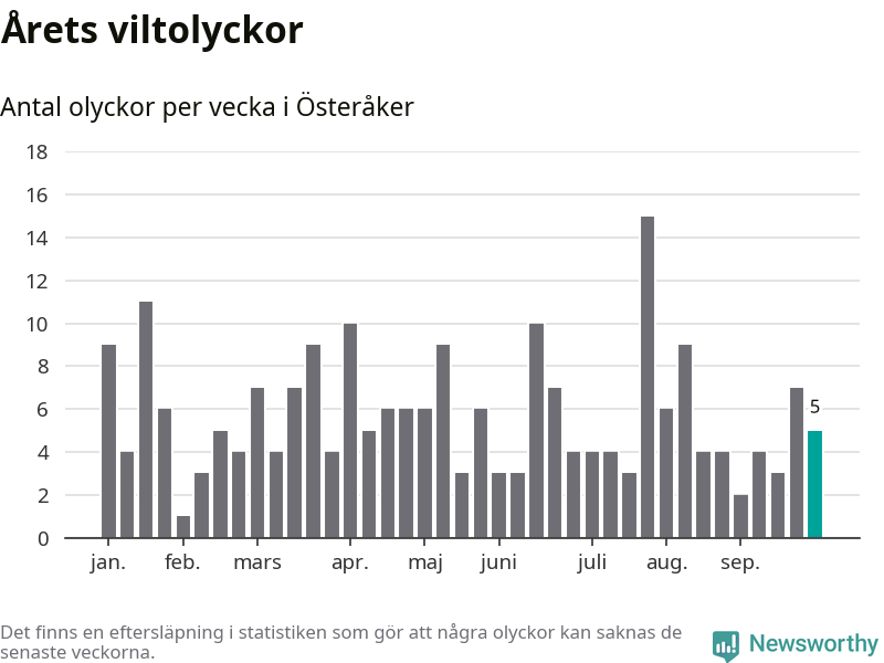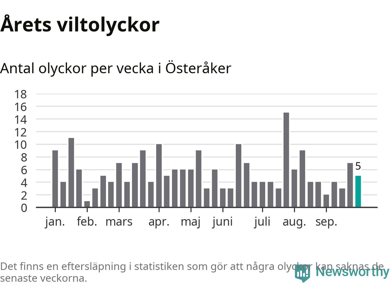 Hittills har fem viltolyckor rapporterats in i Österåkers kommun från vecka 40. Se listan här.