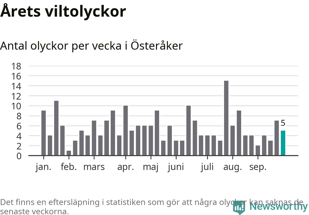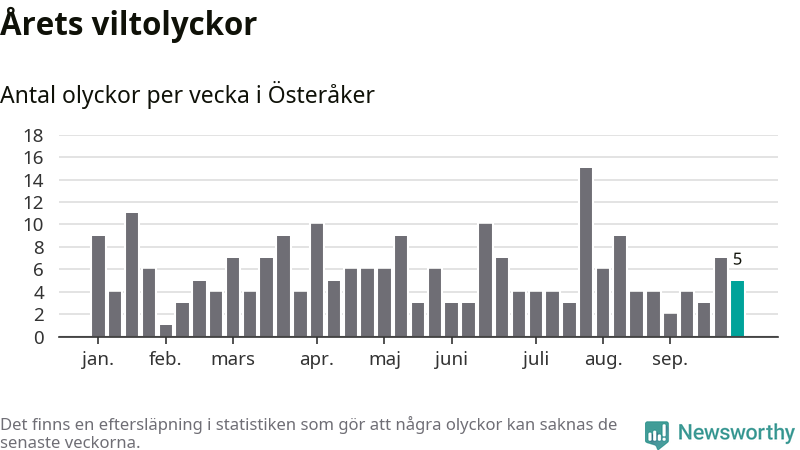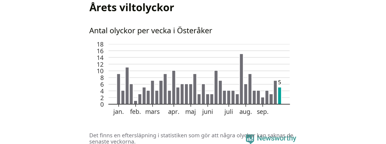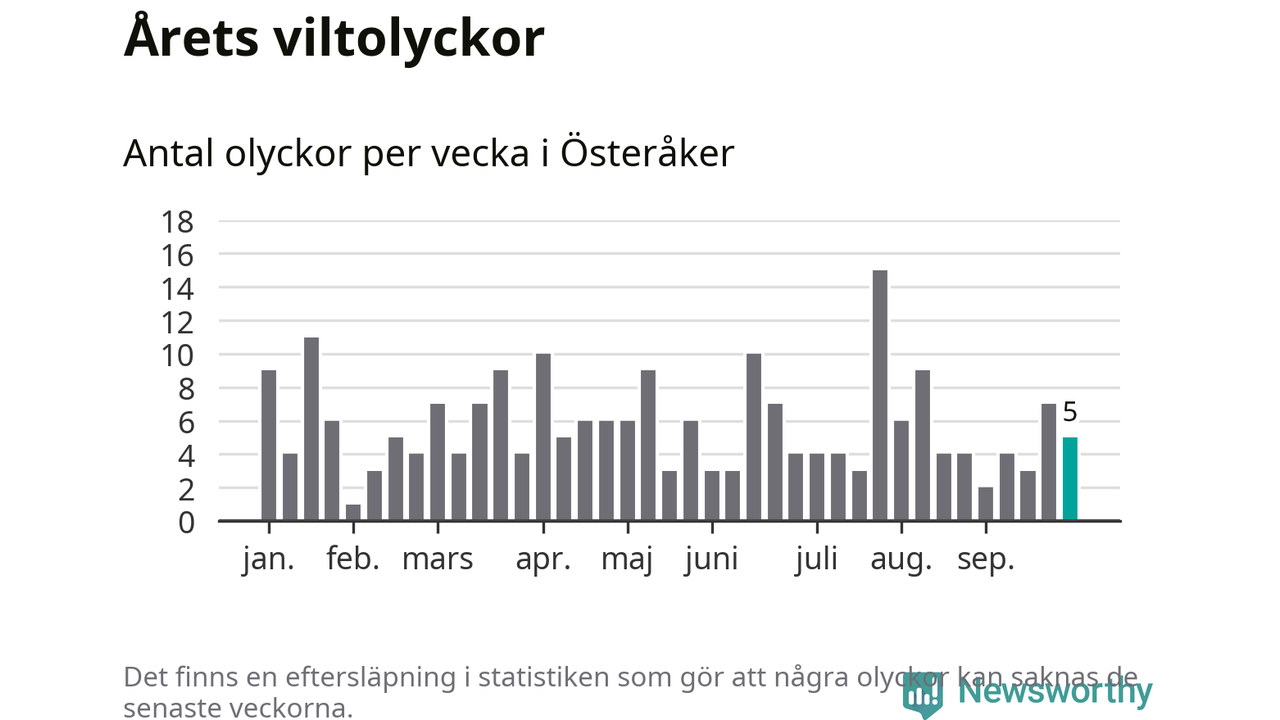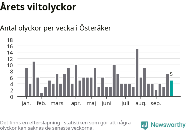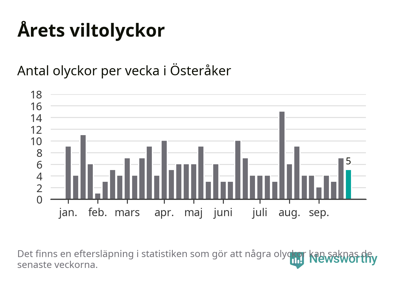 Hittills har fem viltolyckor rapporterats in i Österåkers kommun från vecka 40. Se listan här.