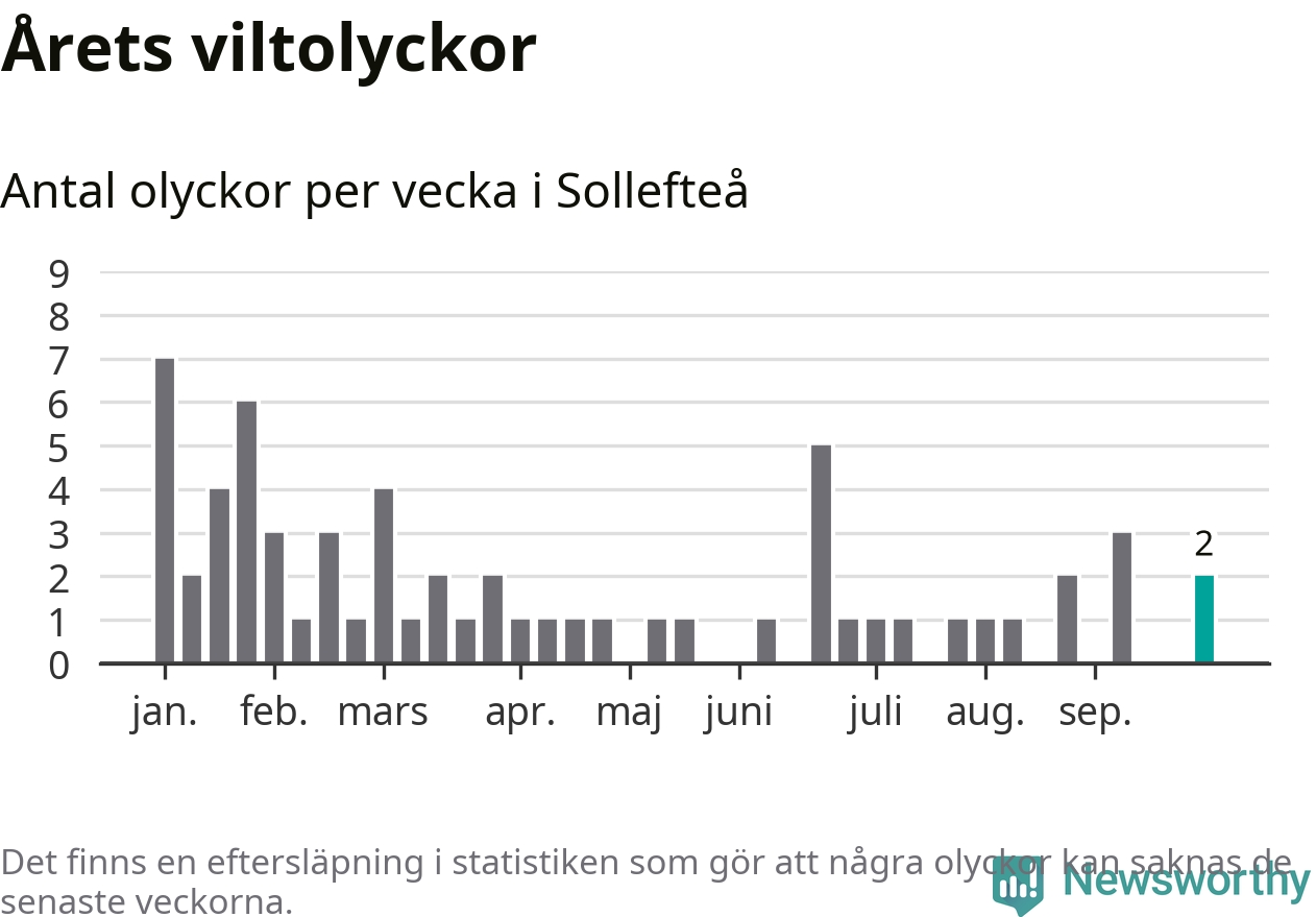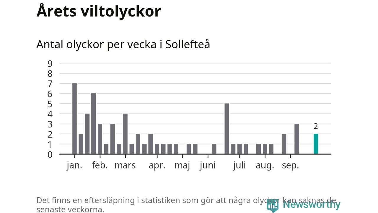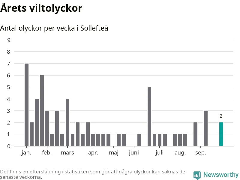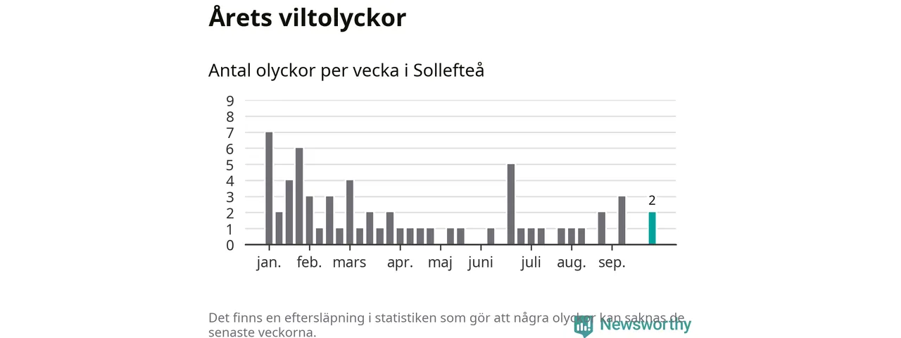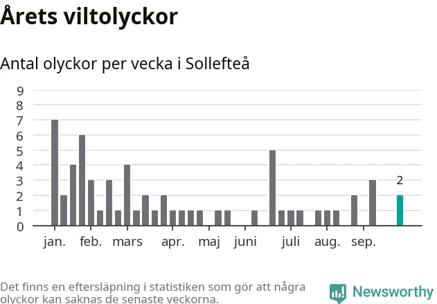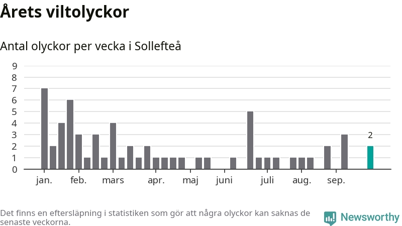 Hittills har två viltolyckor rapporterats in i Sollefteå kommun från vecka 40. Se listan här.