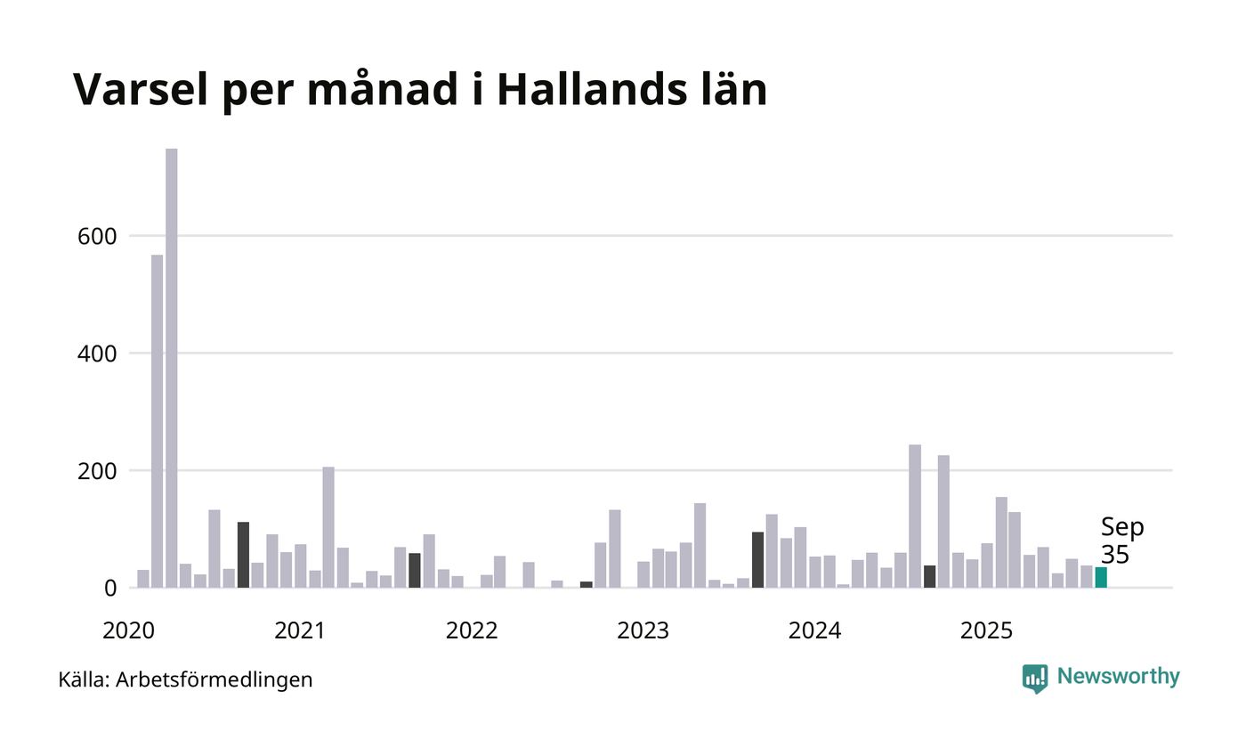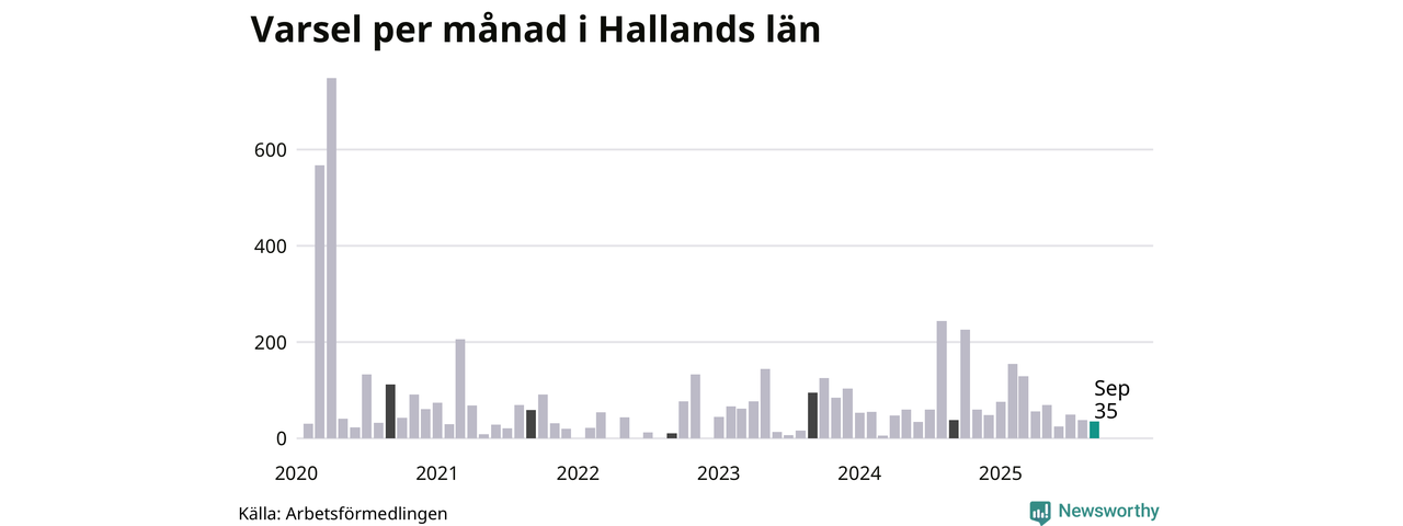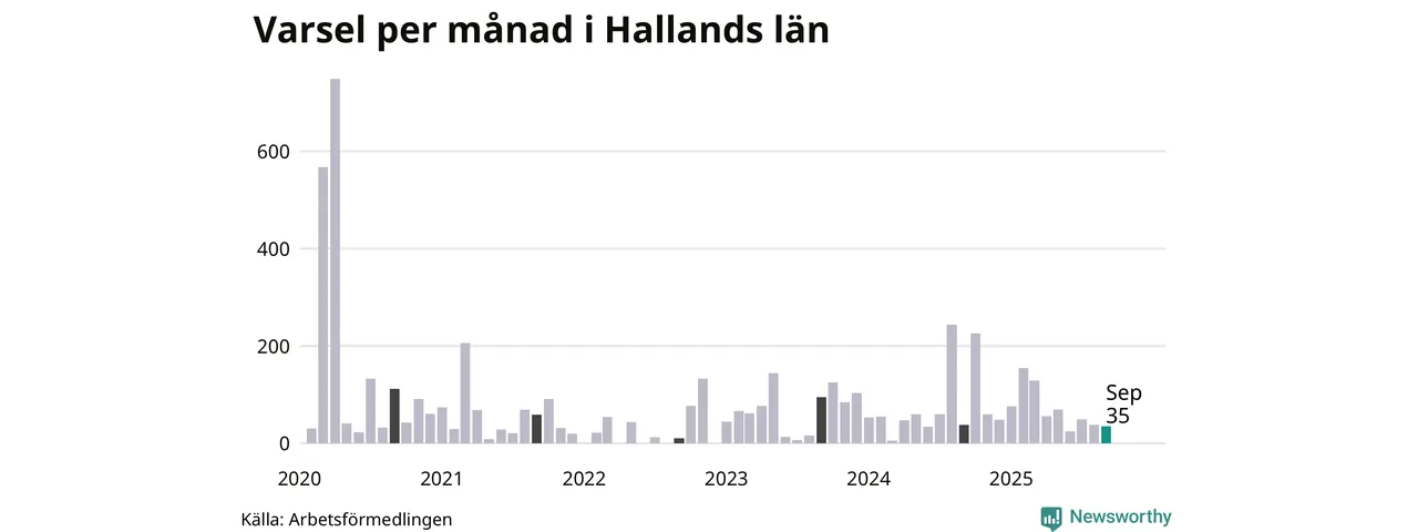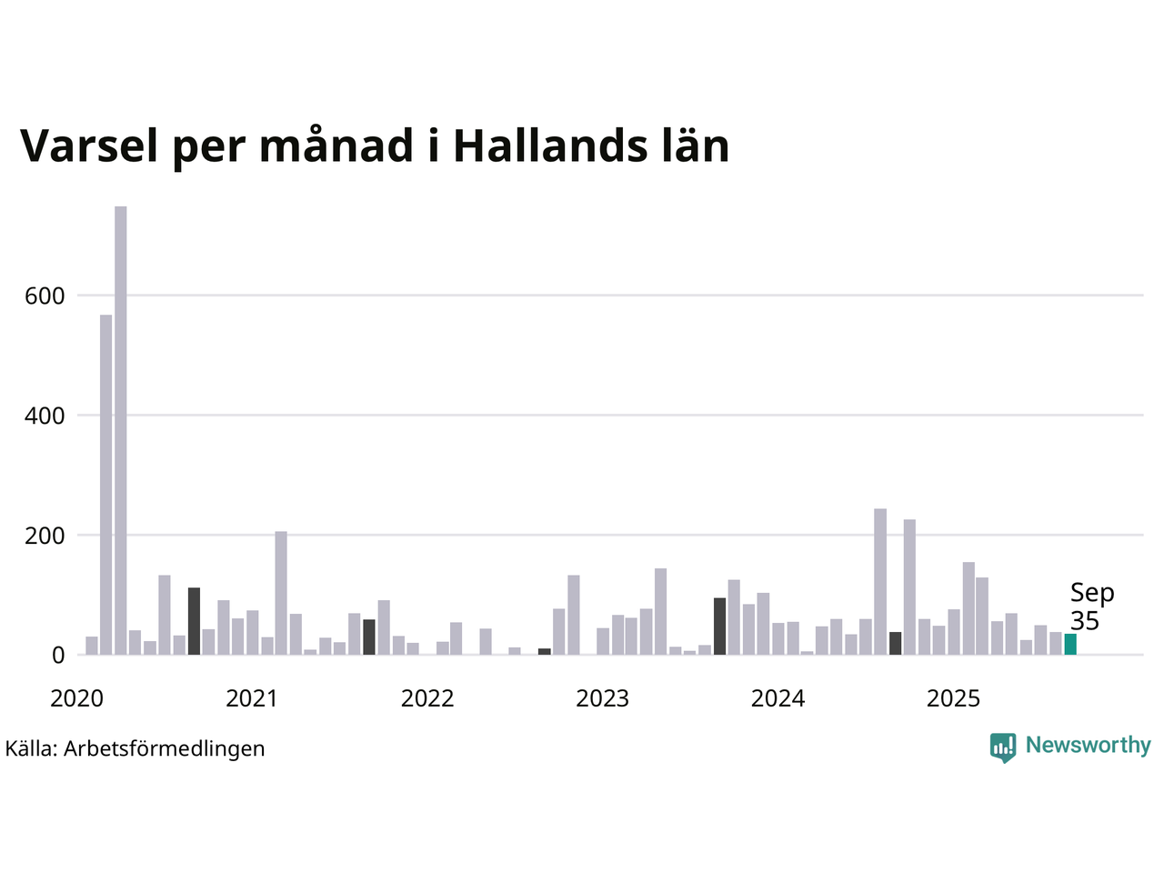 35 personer varslades om uppsägning i Halland under september 2025. Det är tre färre än i augusti. För ett år sedan var antalet varsel 38 i länet. Sett över de tre senaste månaderna har totalt 122 varsel rapporterats i Halland, vilket är 220 färre än motsvarande period 2024. I början av pandemin, i april 2020, varslades som mest 748 personer under en månad i Halland.
