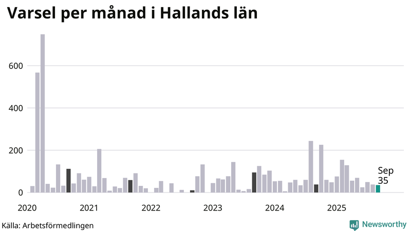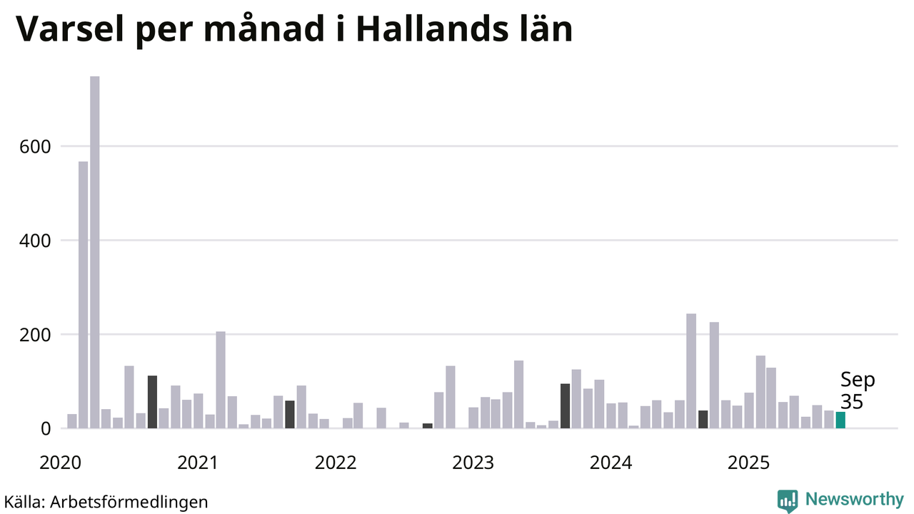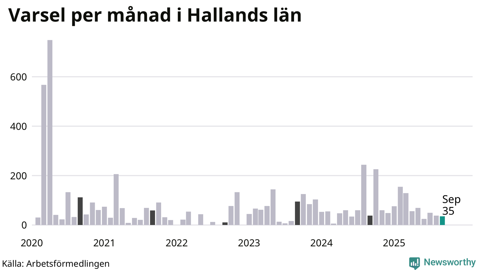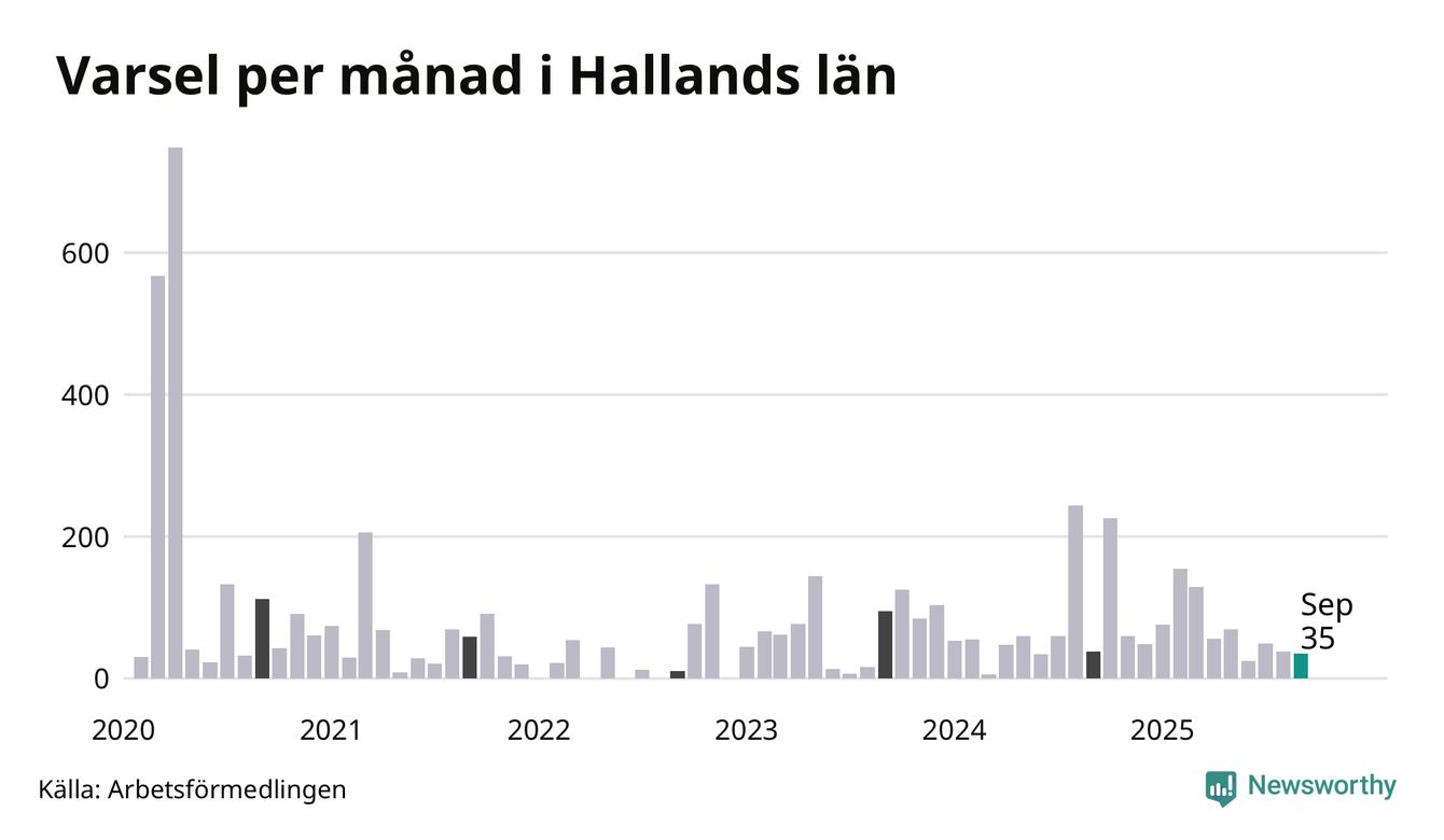 35 personer varslades om uppsägning i Halland under september 2025. Det är tre färre än i augusti. För ett år sedan var antalet varsel 38 i länet. Sett över de tre senaste månaderna har totalt 122 varsel rapporterats i Halland, vilket är 220 färre än motsvarande period 2024. I början av pandemin, i april 2020, varslades som mest 748 personer under en månad i Halland.