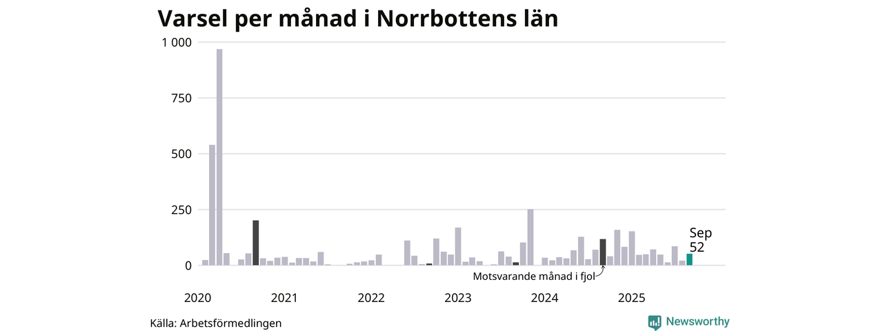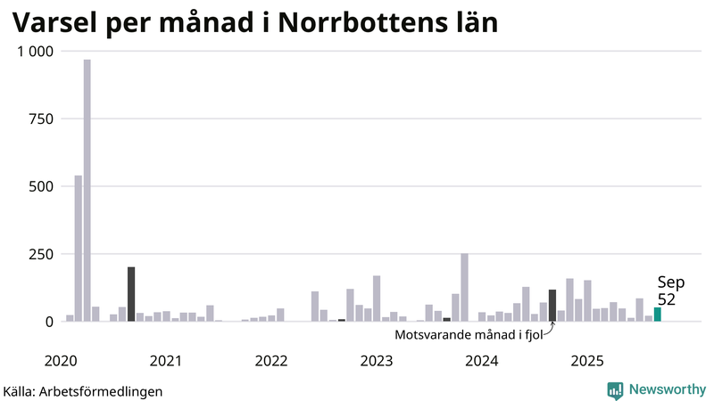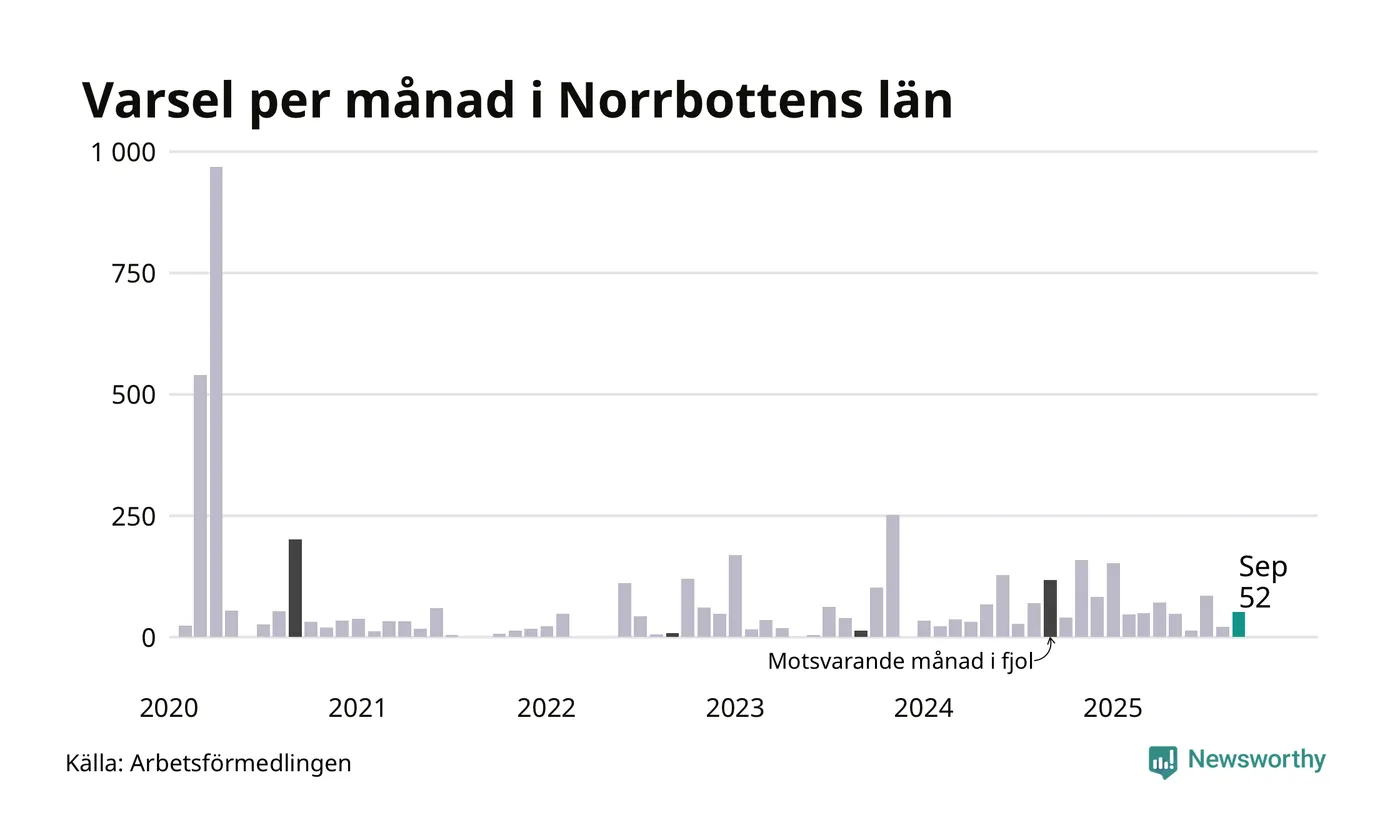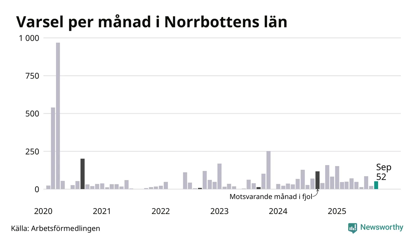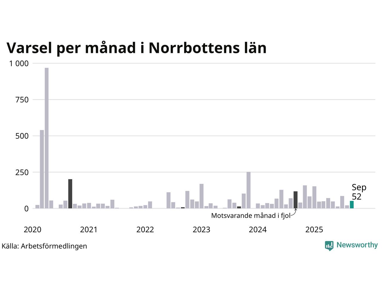 52 personer varslades om uppsägning i Norrbotten under september 2025. Det är 31 fler än i augusti. För ett år sedan var antalet varsel 118 i länet. Sett över de tre senaste månaderna har totalt 159 varsel rapporterats i Norrbotten, vilket är 56 färre än motsvarande period 2024. I början av pandemin, i april 2020, varslades som mest 968 personer under en månad i Norrbotten.