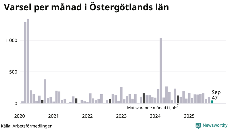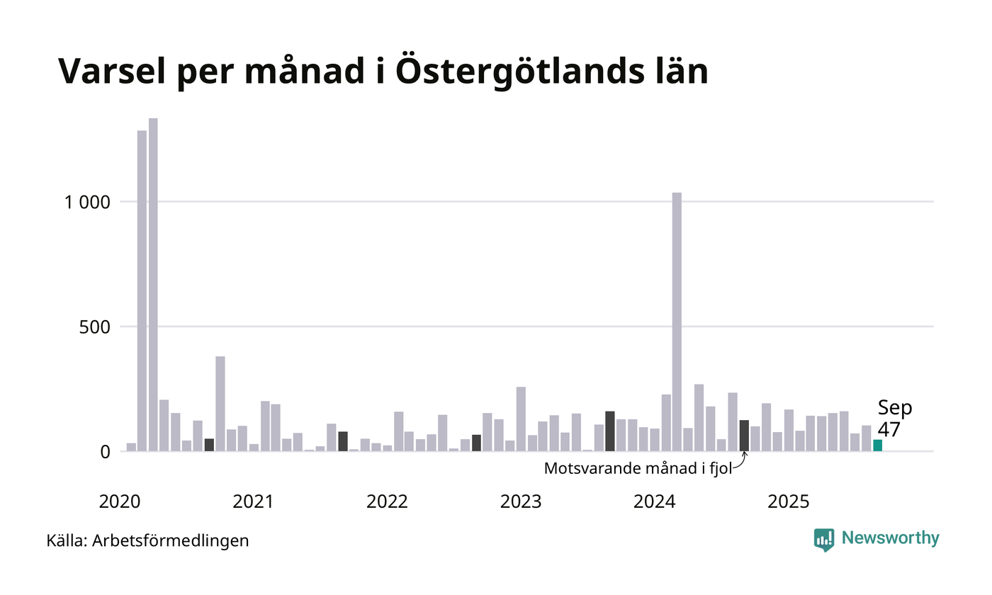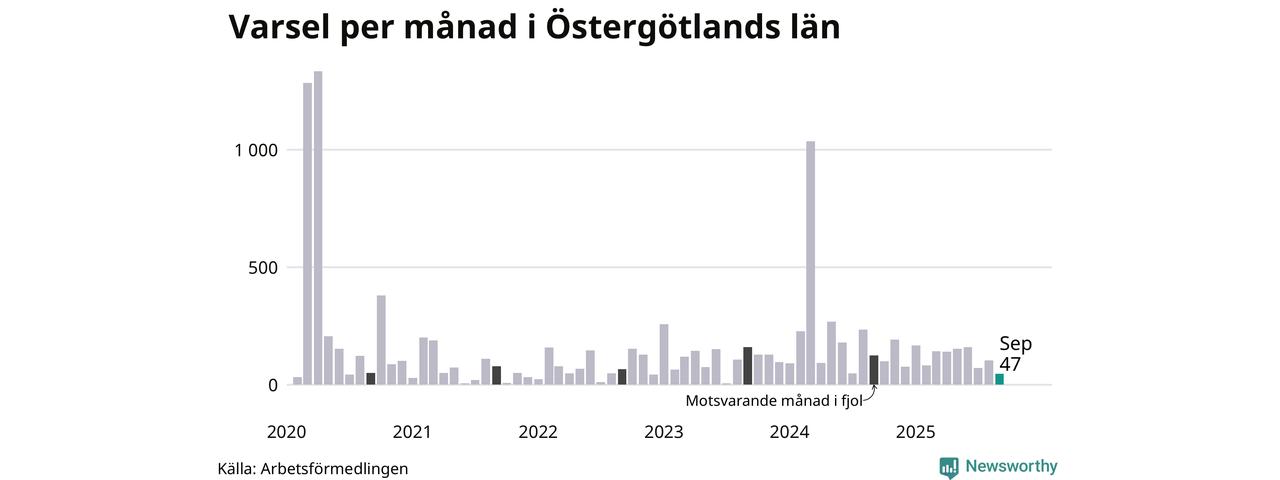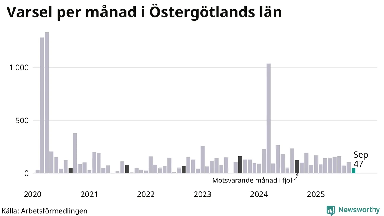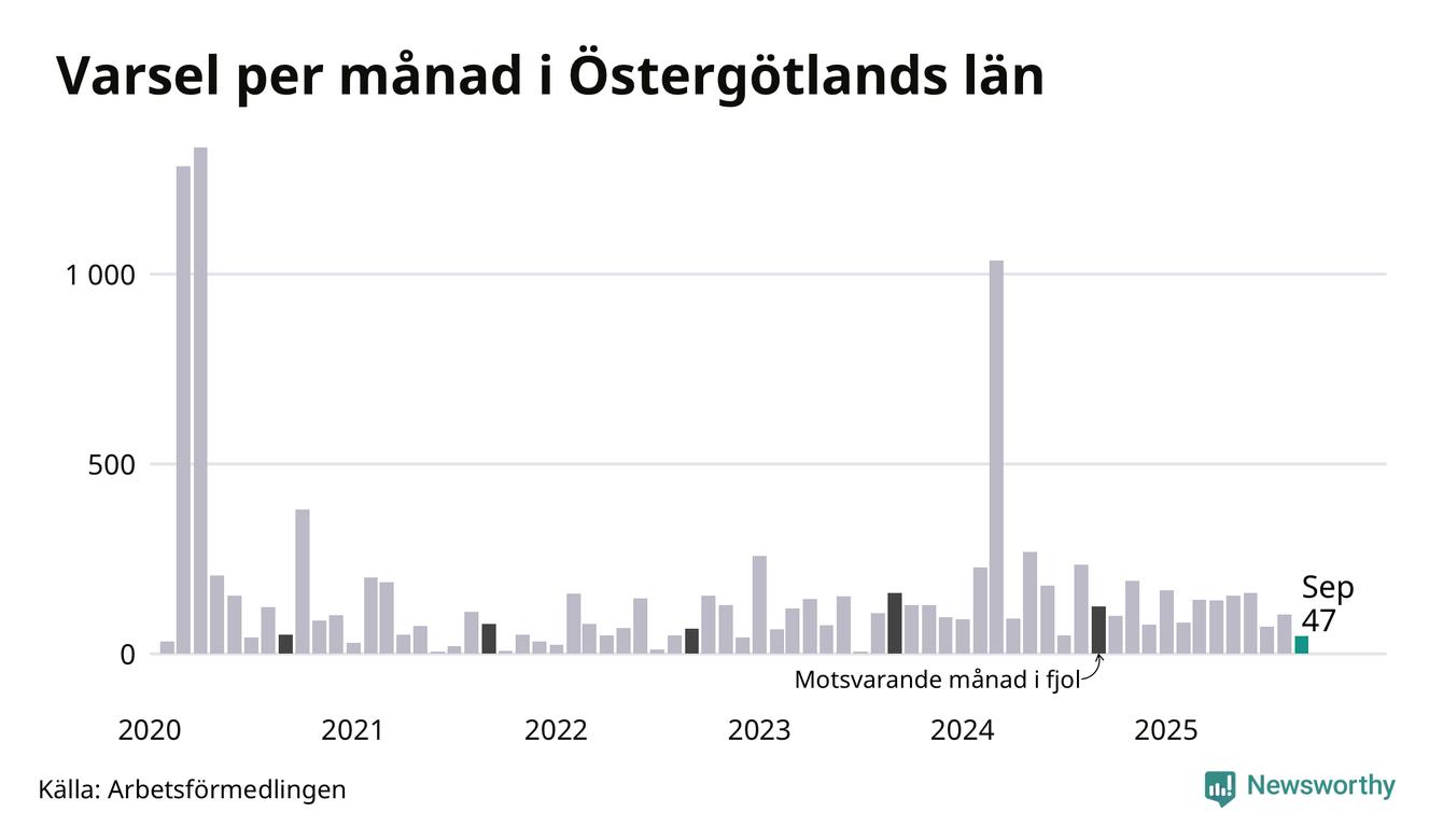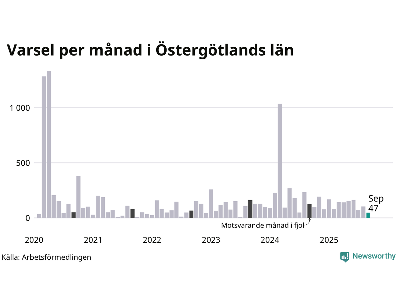 47 personer varslades om uppsägning i Östergötland under september 2025. Det är 56 färre än i augusti och den lägsta siffran sedan juli 2023. Då lades sex varsel i Östergötland. Sett över de tre senaste månaderna har totalt 221 varsel rapporterats i Östergötland, vilket är 187 färre än motsvarande period 2024. I början av pandemin, i april 2020, varslades som mest 1 333 personer under en månad i Östergötland.