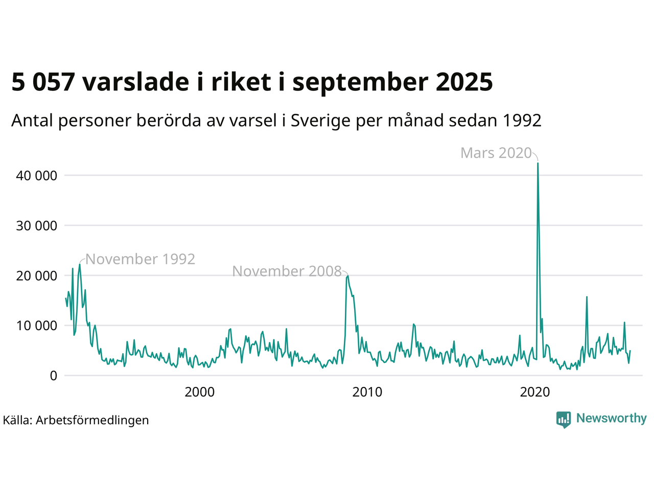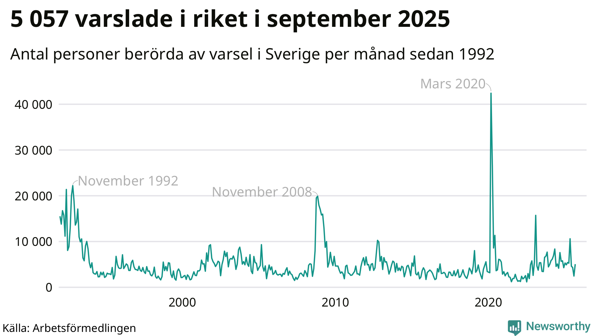 Rapporteringen av länstillhörighet har förändrats och historiska siffror är inte helt jämförbara på länsnivå, men i hela landet finns några tydliga toppar under de tre senaste decennierna: Krisen i början av 1990-talet, finanskrisen i slutet av 00-talet och nu senast corona-våren 2020. I Skåne lades – i absoluta tal – flest varsel i juni 1992, omkring 2 800, jämfört med omkring 2 300 i november 2008 och omkring 2 400 i mars 2020.
