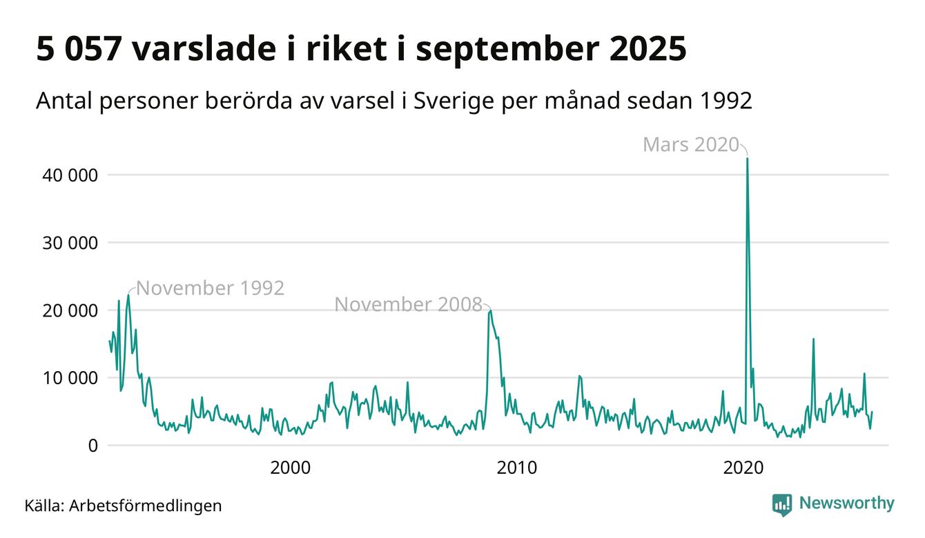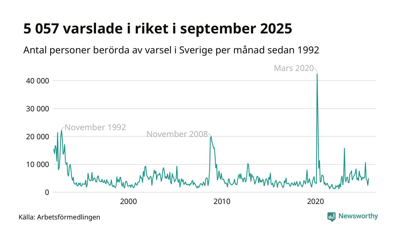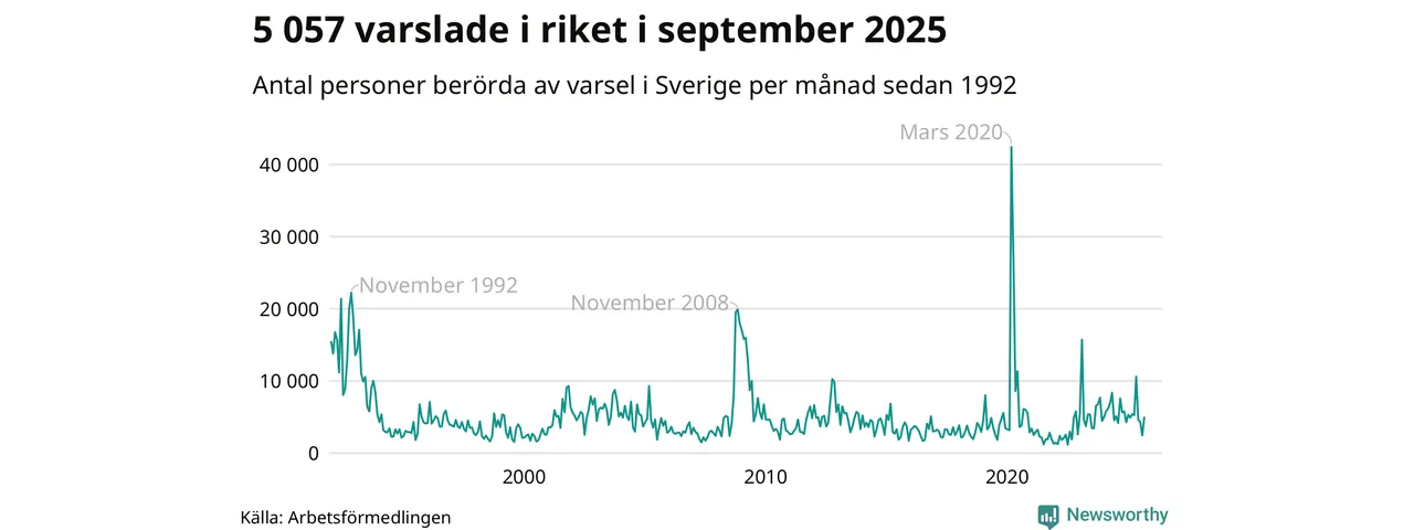 I hela riket varslades 5 057 personer under september 2025, vilket är 2 600 fler än i augusti men omkring 2 500 färre än i september 2024. Under de tre senaste månaderna har totalt omkring 11 800 varslats om uppsägning i Sverige. Det är omkring 5 000 fler än motsvarande period i fjol.