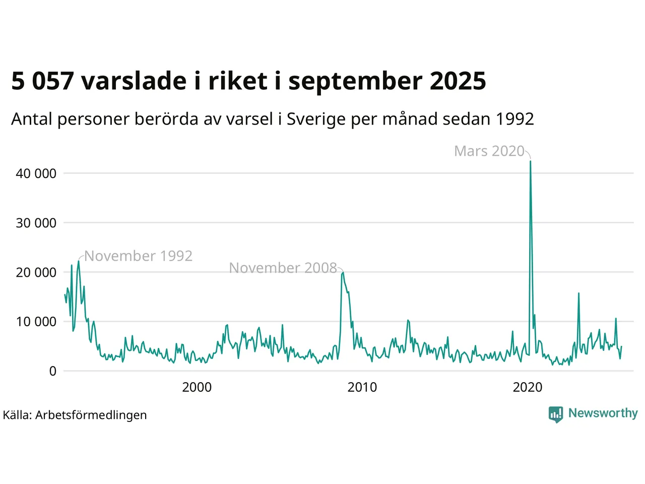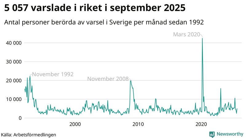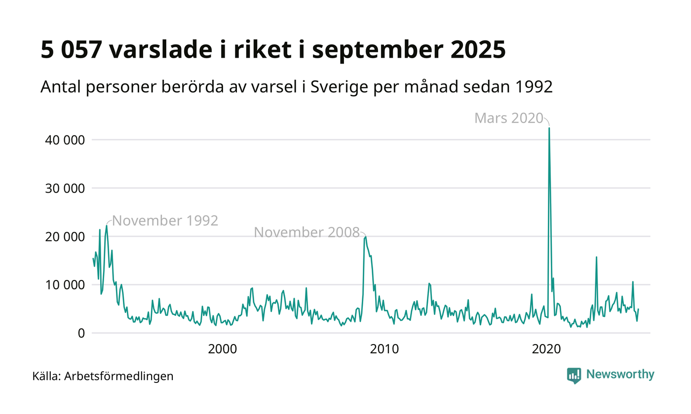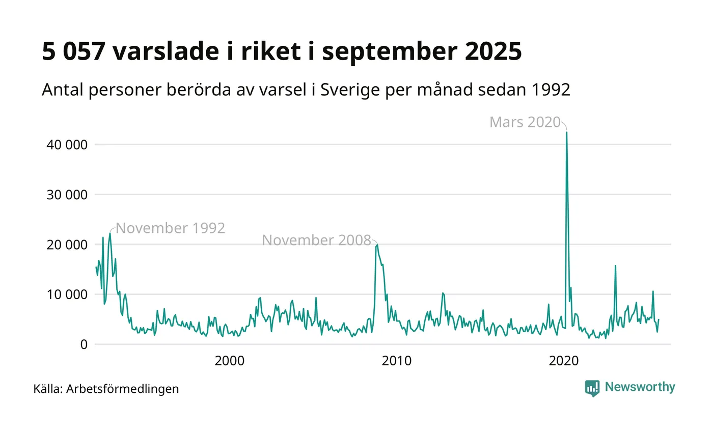 I hela riket varslades 5 057 personer under september 2025, vilket är 2 600 fler än i augusti men omkring 2 500 färre än i september 2024. Under de tre senaste månaderna har totalt omkring 11 800 varslats om uppsägning i Sverige. Det är omkring 5 000 fler än motsvarande period i fjol.
