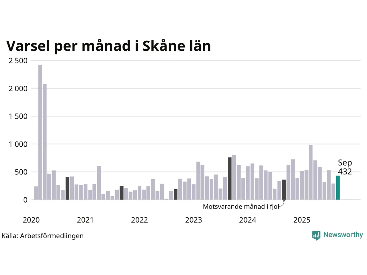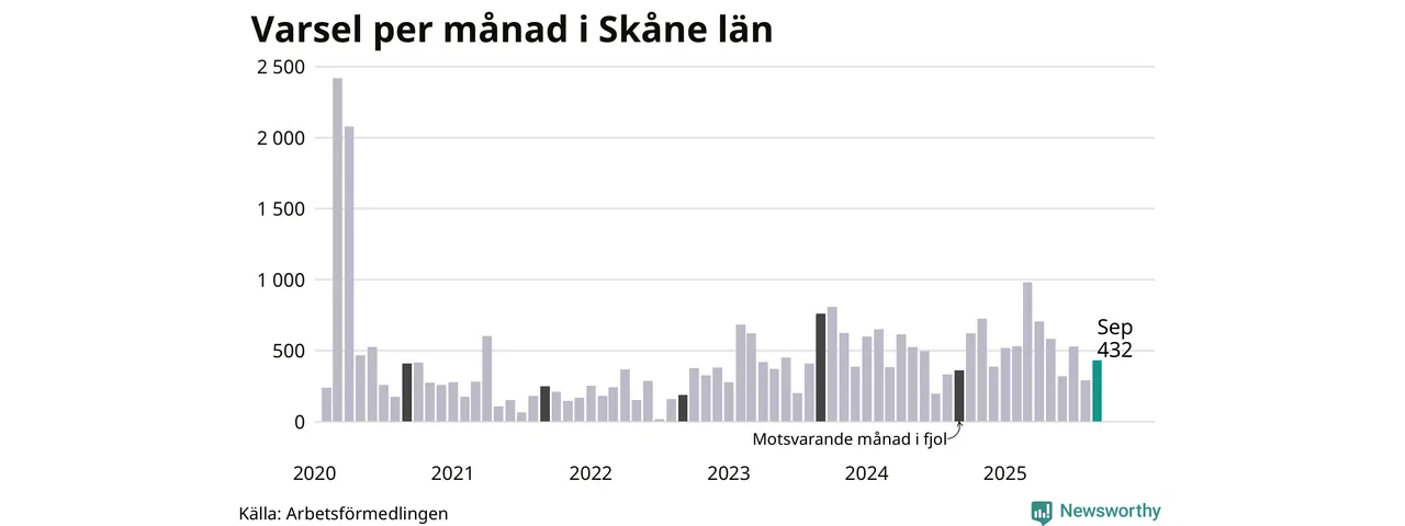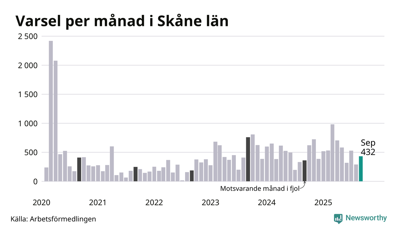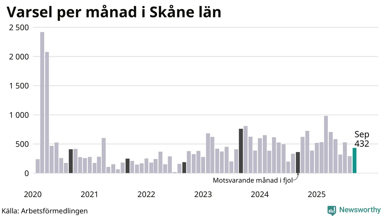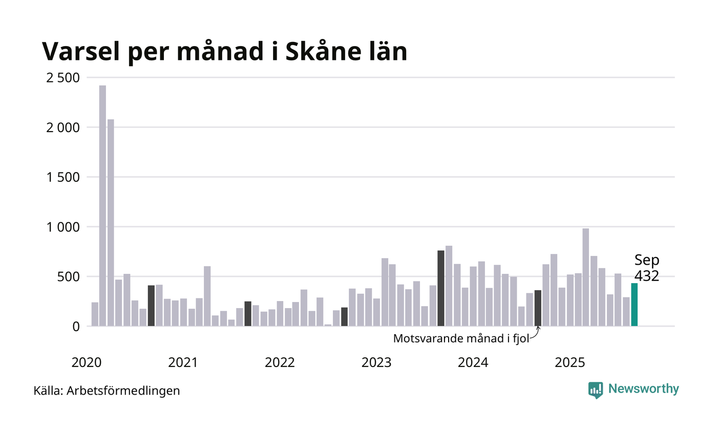 432 personer varslades om uppsägning i Skåne under september 2025. Det är 141 fler än i augusti. För ett år sedan var antalet varsel 362 i länet. Sett över de tre senaste månaderna har totalt 1 251 varsel rapporterats i Skåne, vilket är 356 fler än motsvarande period 2024. I början av pandemin, i mars 2020, varslades som mest 2 418 personer under en månad i Skåne.