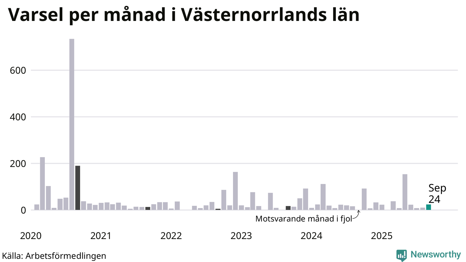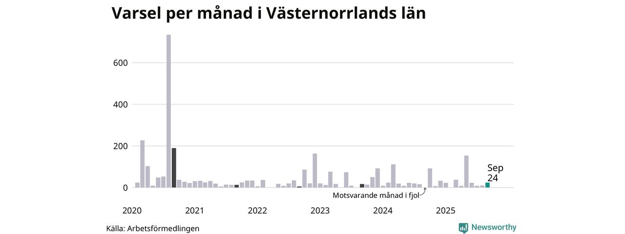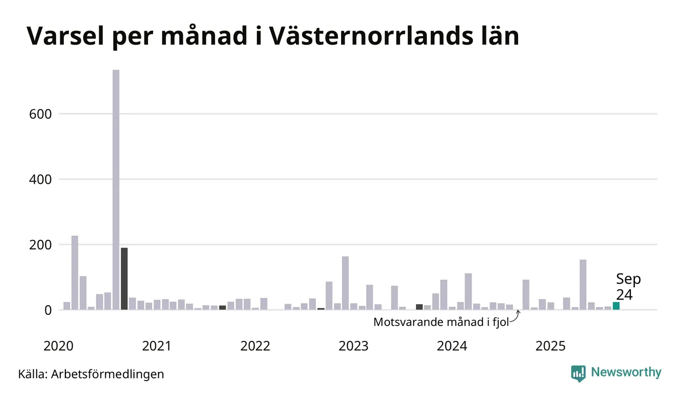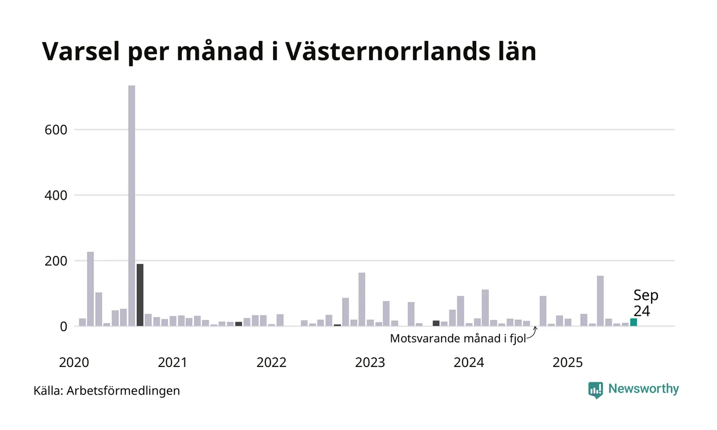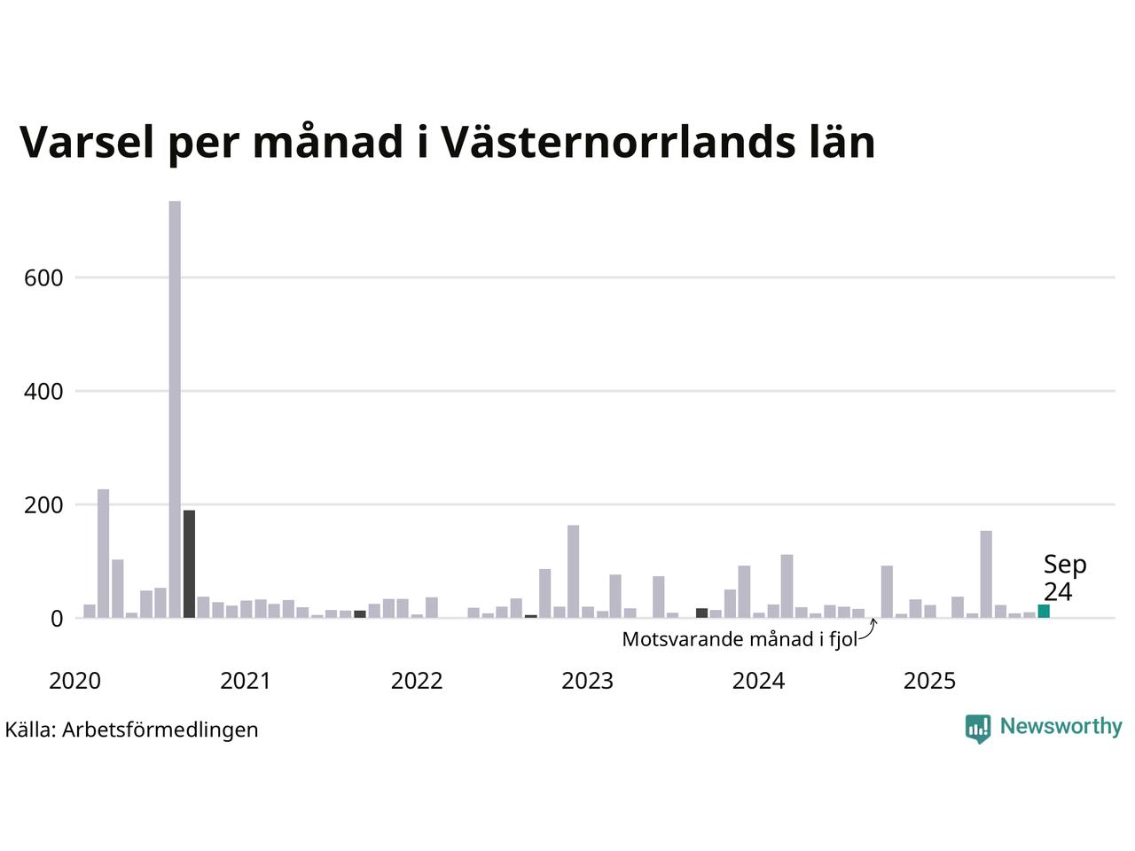 24 personer varslades om uppsägning i Västernorrland under september 2025. Det är 14 fler än i augusti. För ett år sedan var antalet varsel noll i länet. Sett över de tre senaste månaderna har totalt 42 varsel rapporterats i Västernorrland, vilket är sex fler än motsvarande period 2024. I början av pandemin, i augusti 2020, varslades som mest 734 personer under en månad i Västernorrland.