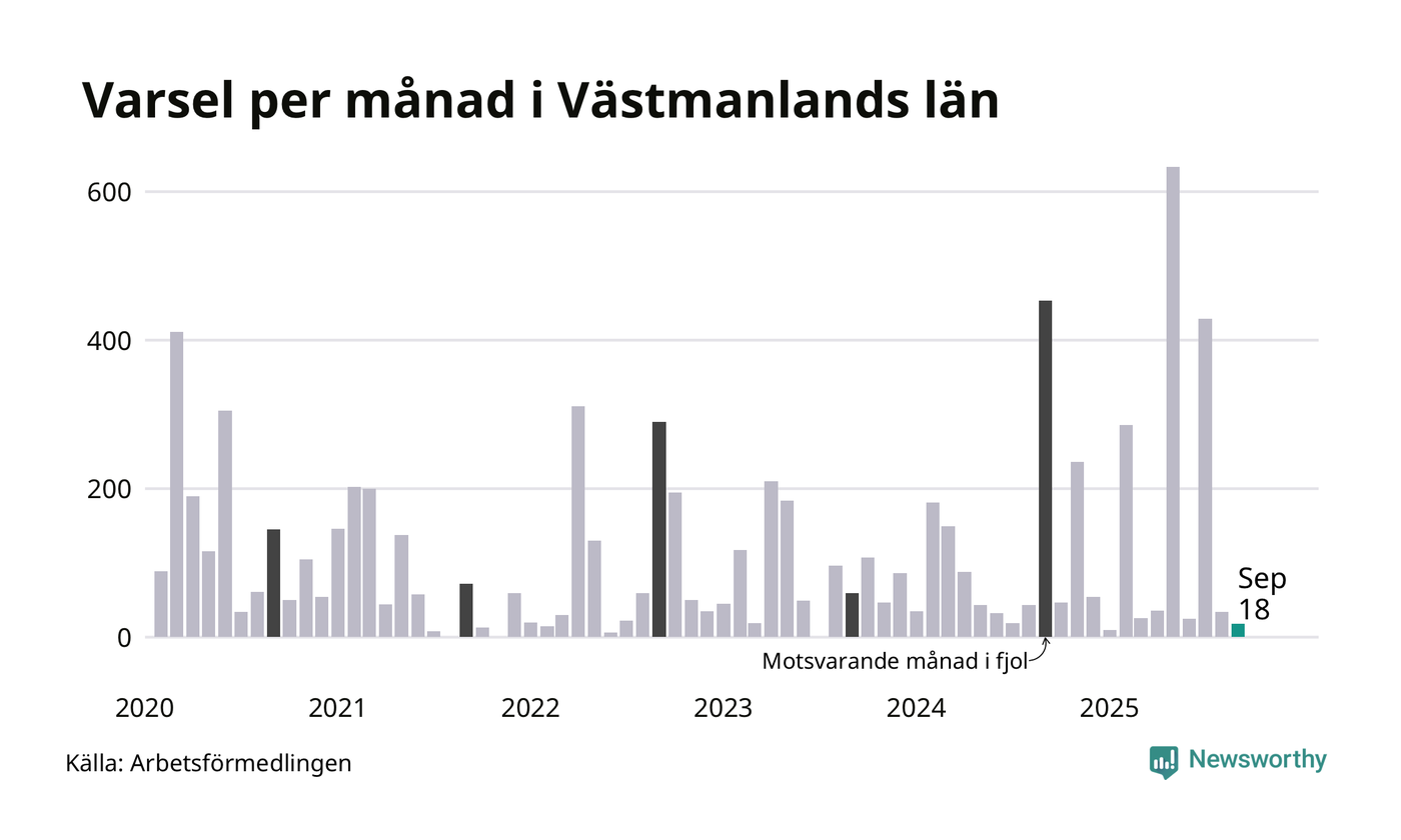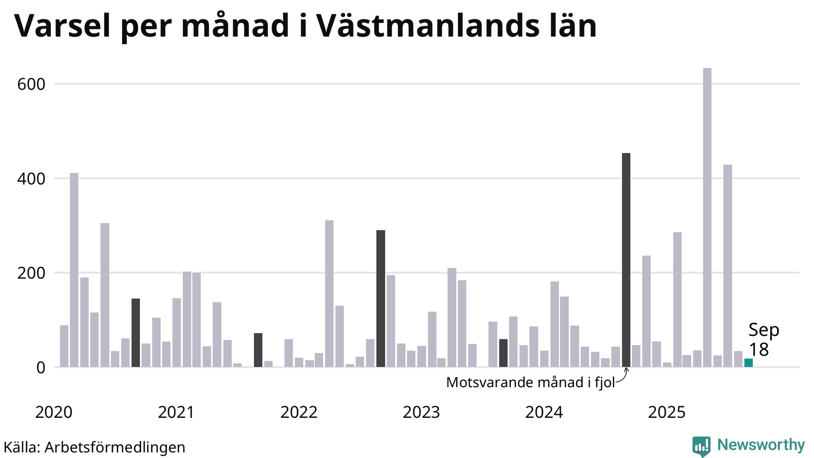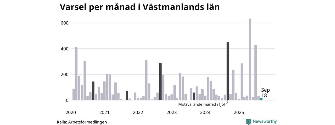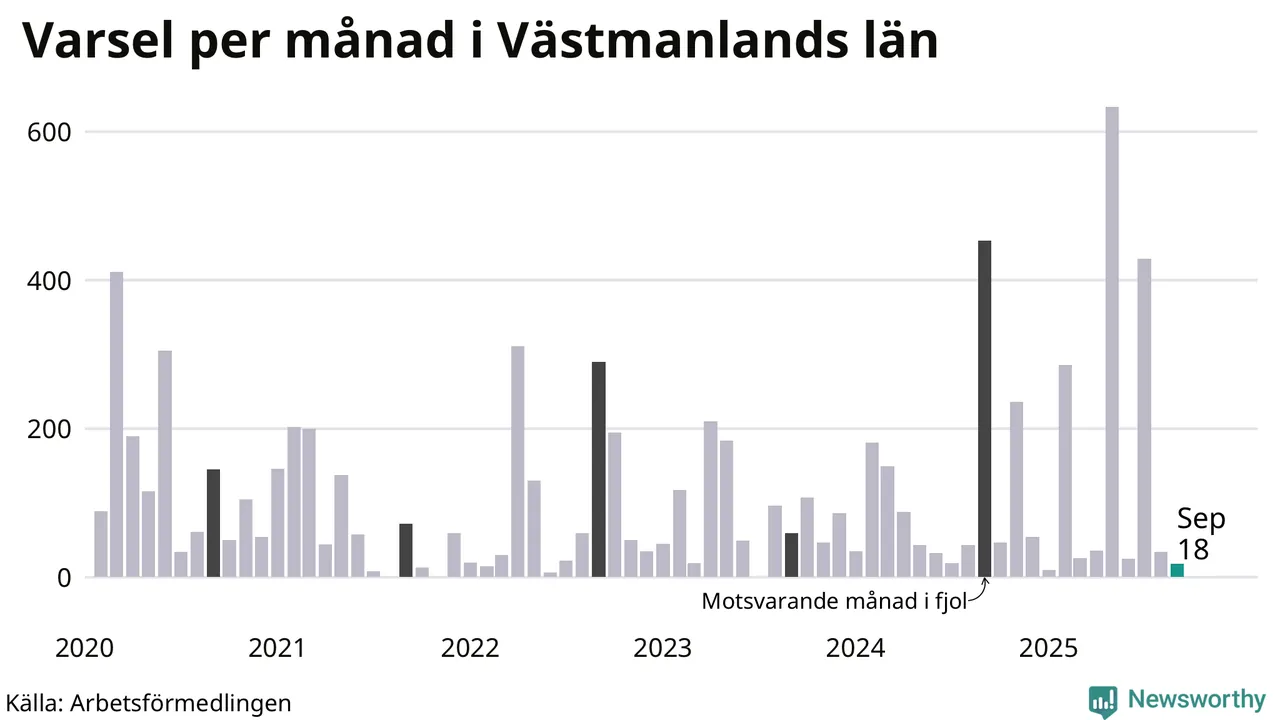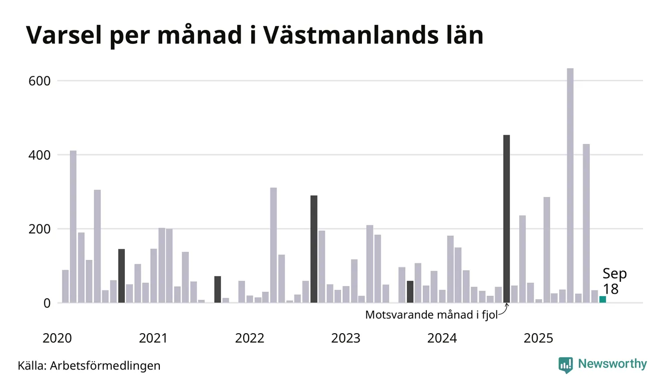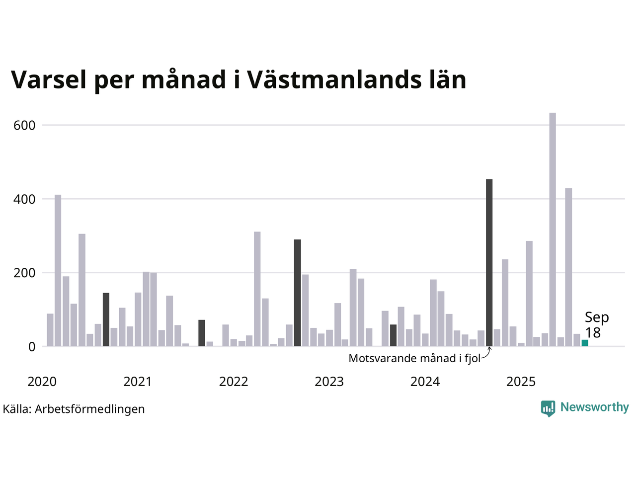 18 personer varslades om uppsägning i Västmanland under september 2025. Det är 16 färre än i augusti. För ett år sedan var antalet varsel 453 i länet. Sett över de tre senaste månaderna har totalt 481 varsel rapporterats i Västmanland, vilket är 34 färre än motsvarande period 2024. I början av pandemin, i mars 2020, varslades som mest 411 personer under en månad i Västmanland.