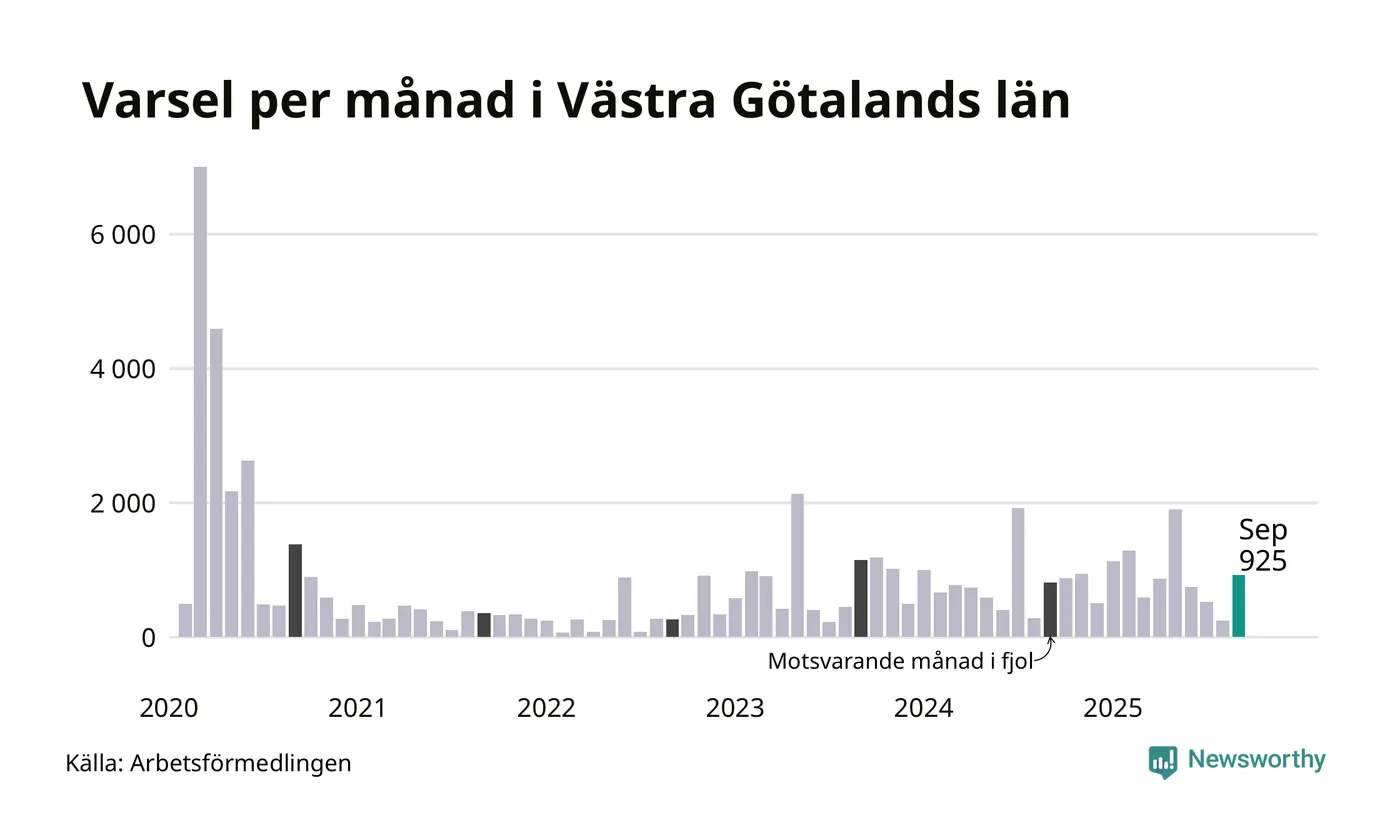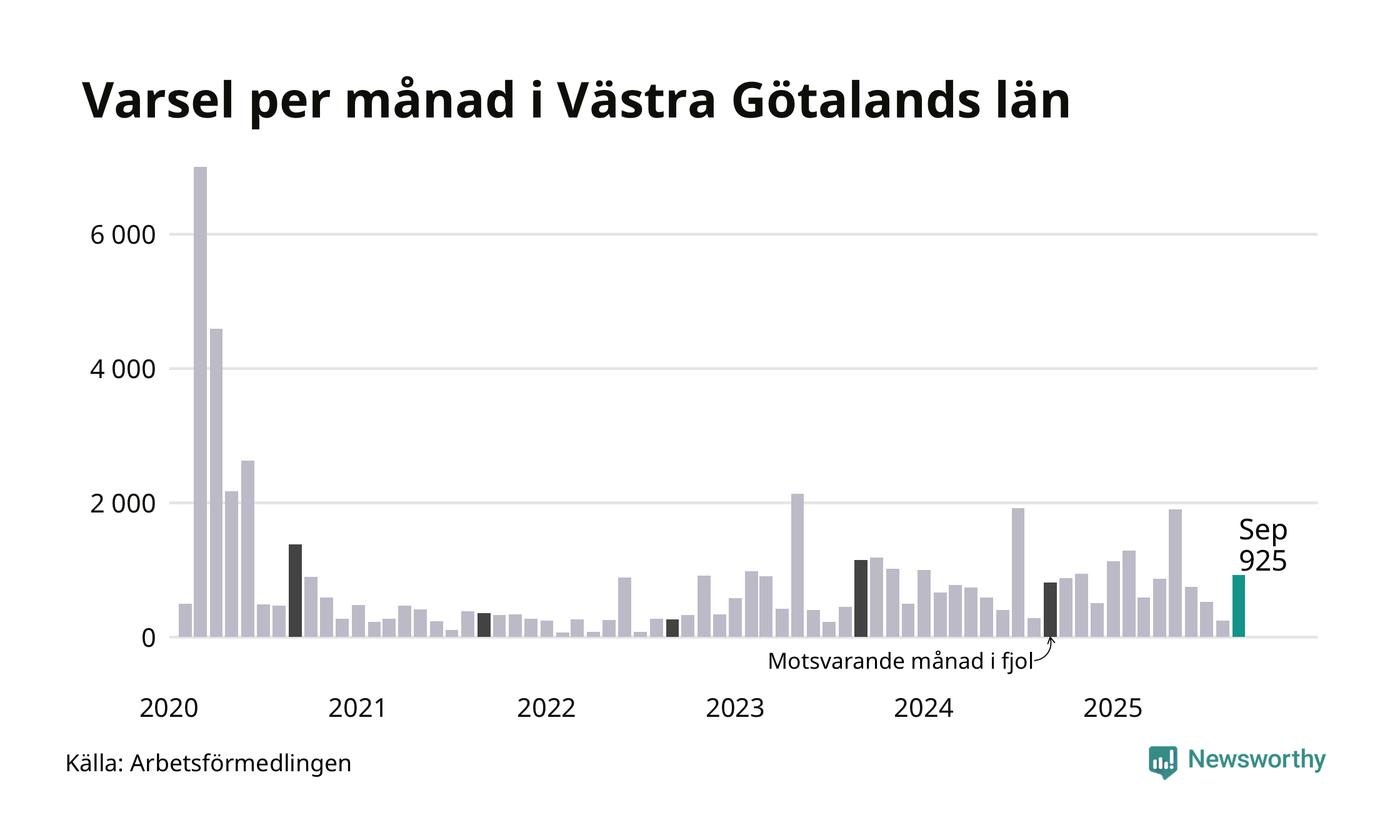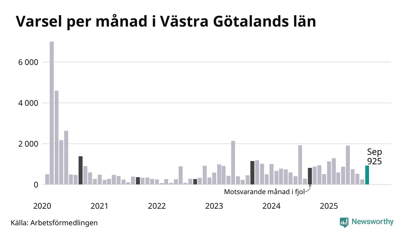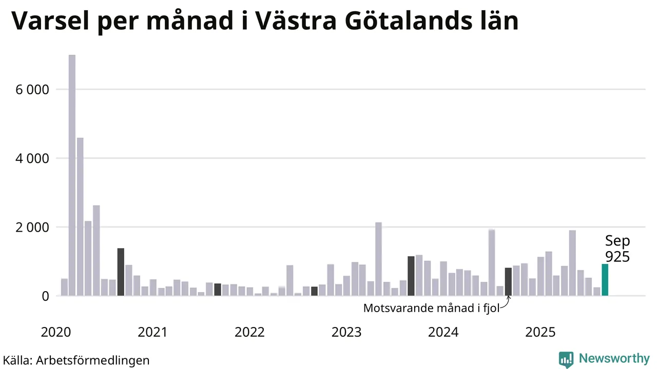925 personer varslades om uppsägning i Västra Götaland under september 2025. Det är 682 fler än i augusti. För ett år sedan var antalet varsel 817 i länet. Sett över de tre senaste månaderna har totalt 1 697 varsel rapporterats i Västra Götaland, vilket är 1 323 färre än motsvarande period 2024. I början av pandemin, i mars 2020, varslades som mest 6 999 personer under en månad i Västra Götaland.
