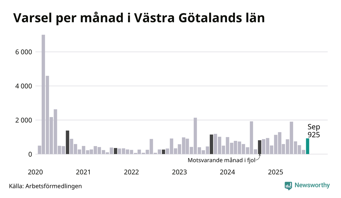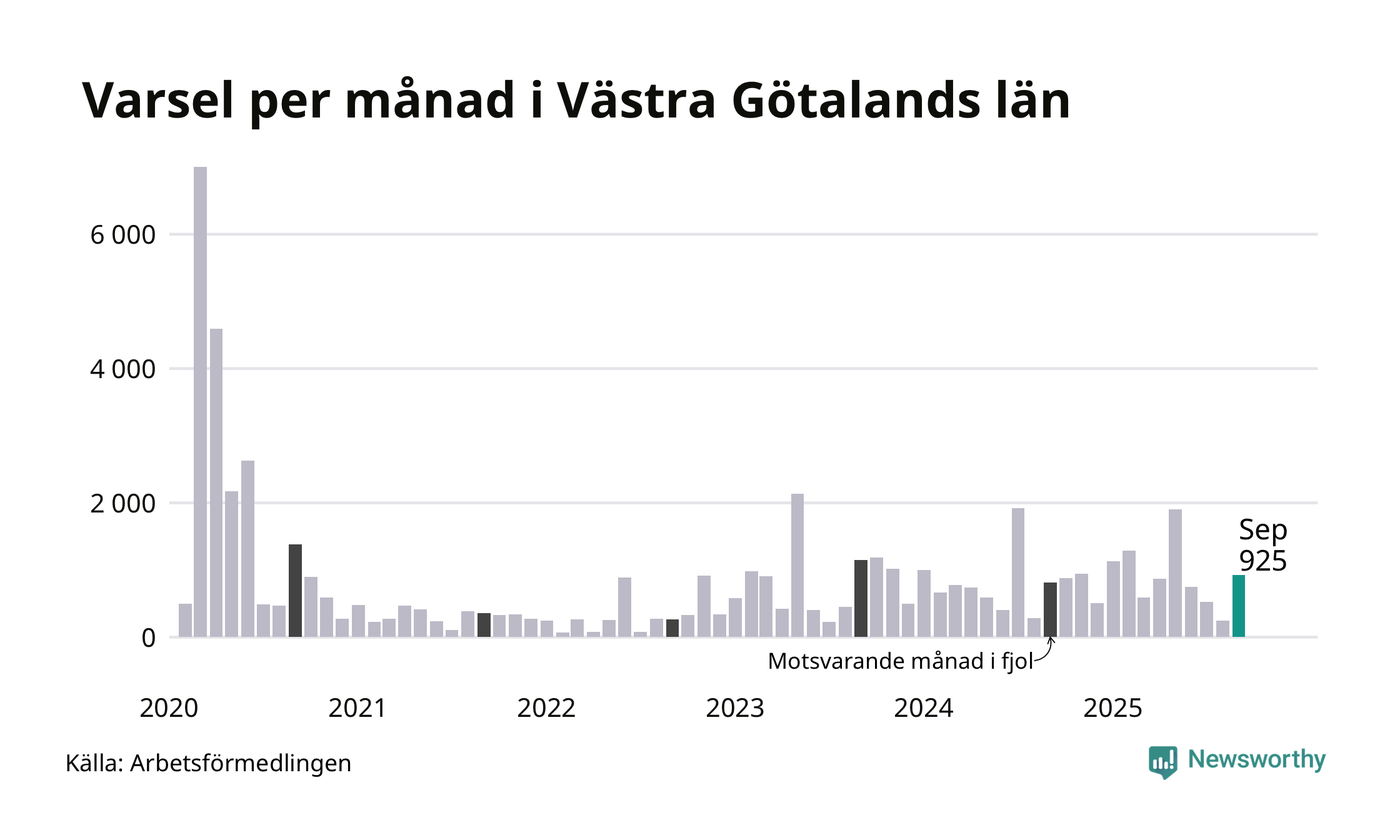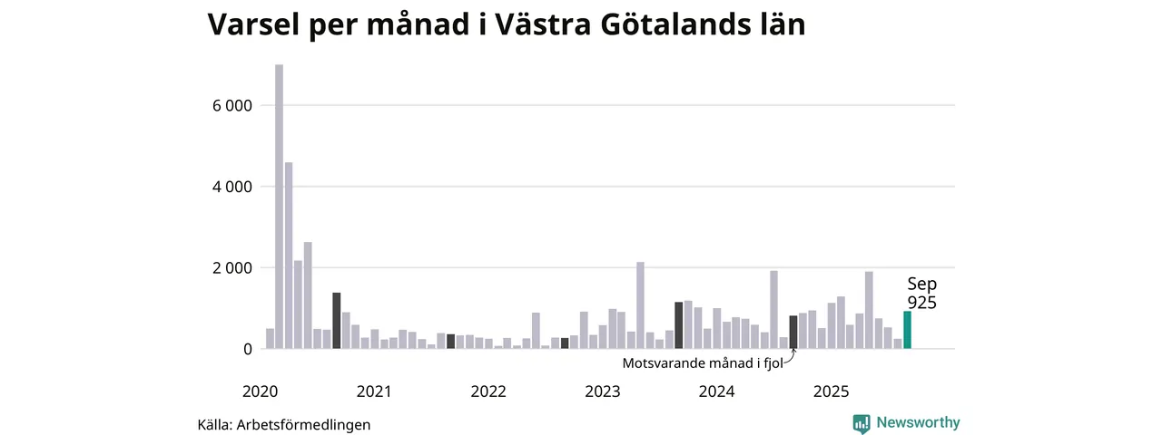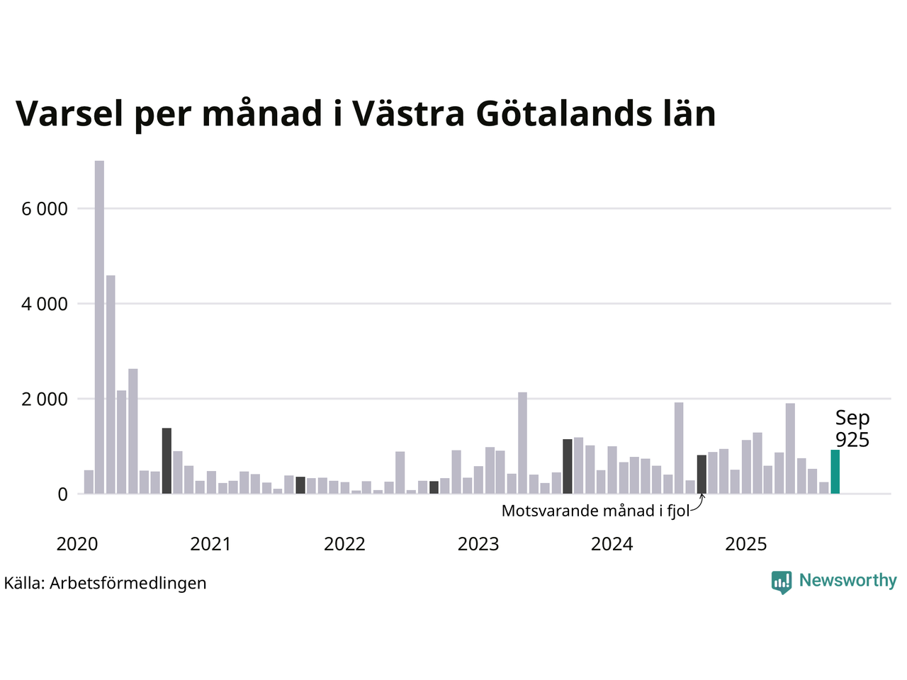 925 personer varslades om uppsägning i Västra Götaland under september 2025. Det är 682 fler än i augusti. För ett år sedan var antalet varsel 817 i länet. Sett över de tre senaste månaderna har totalt 1 697 varsel rapporterats i Västra Götaland, vilket är 1 323 färre än motsvarande period 2024. I början av pandemin, i mars 2020, varslades som mest 6 999 personer under en månad i Västra Götaland.
