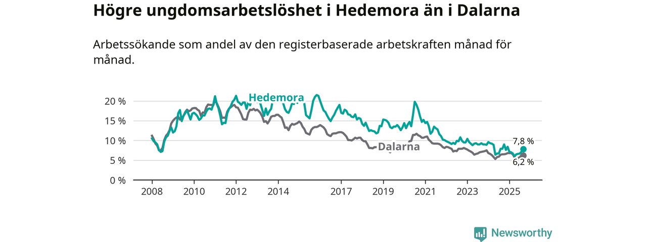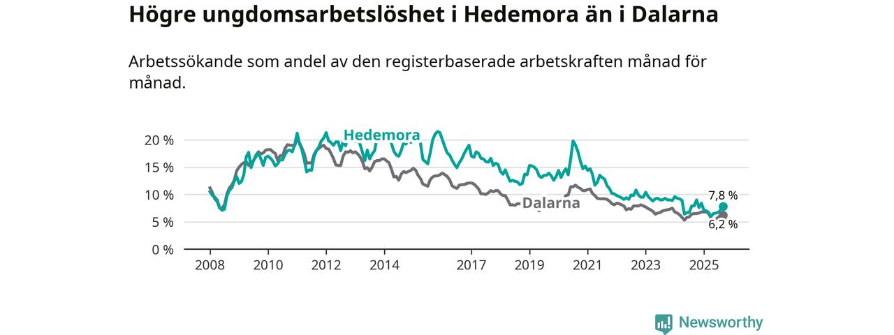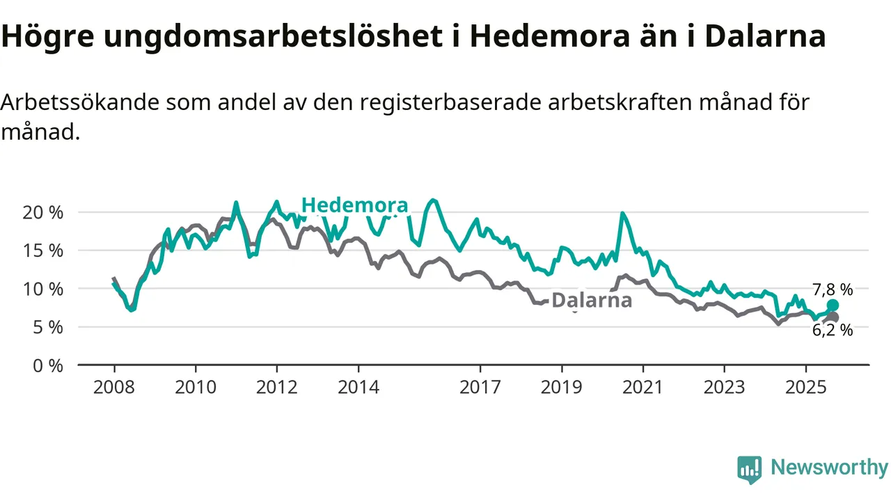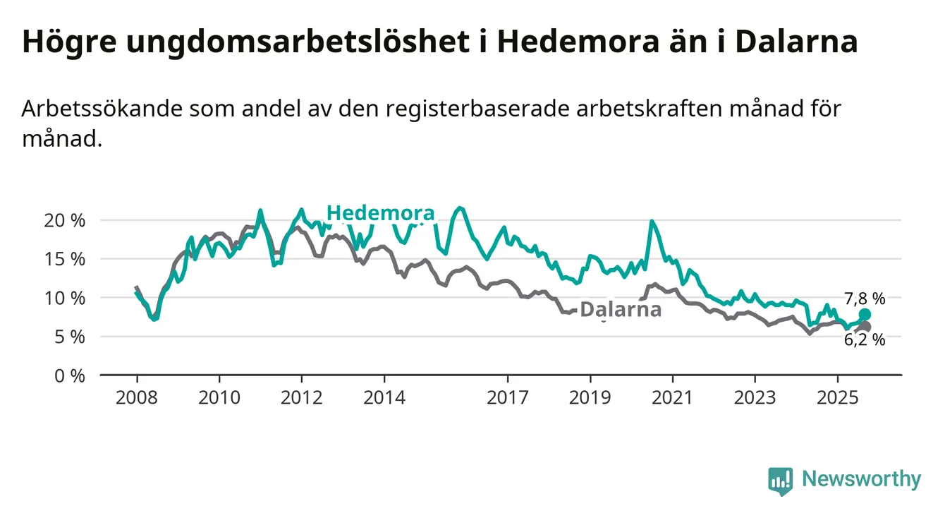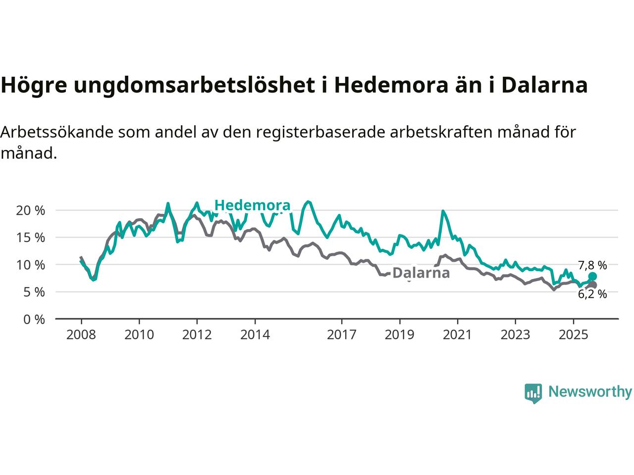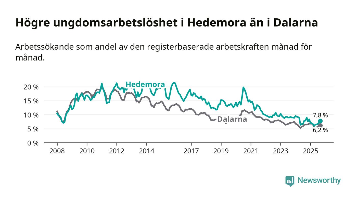 Precis som den totala arbetslösheten ligger ungdomsarbetslösheten i Hedemora högre än i Dalarna som helhet. Skillnaden mellan kommunen och länet är 1,6 procentenheter.