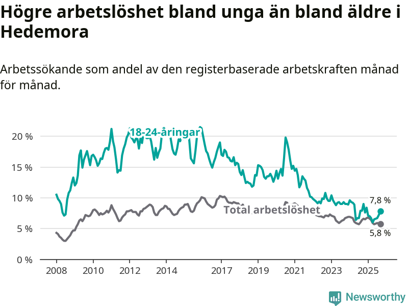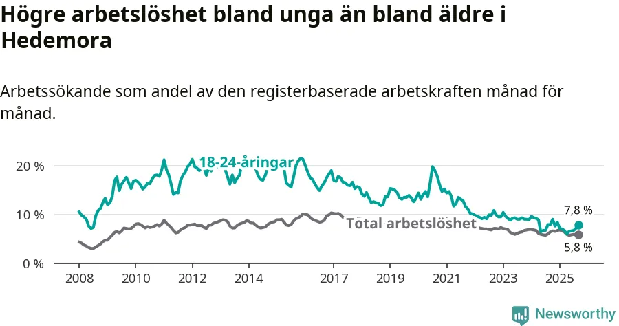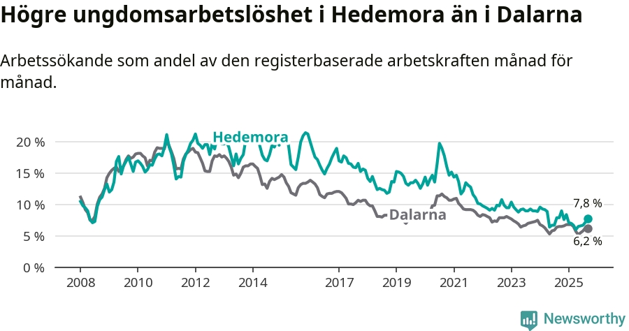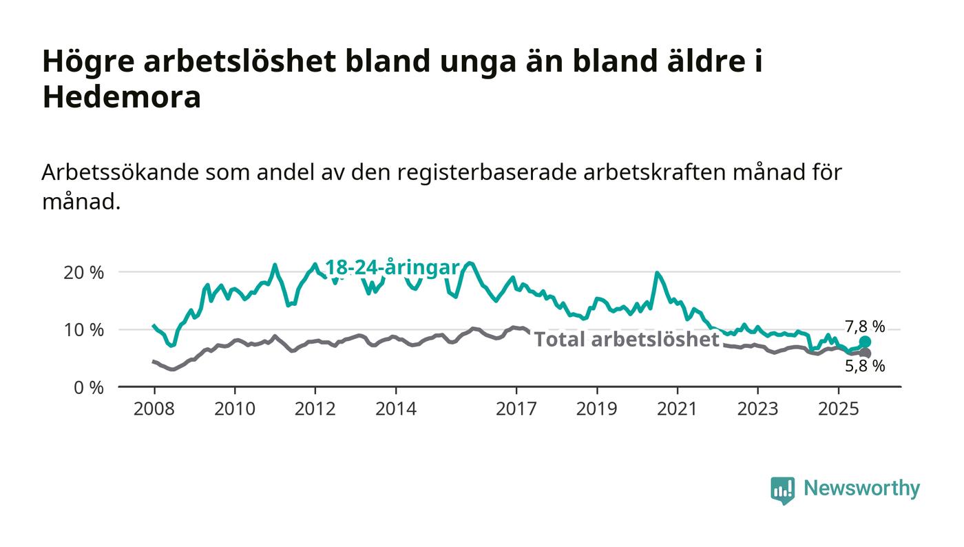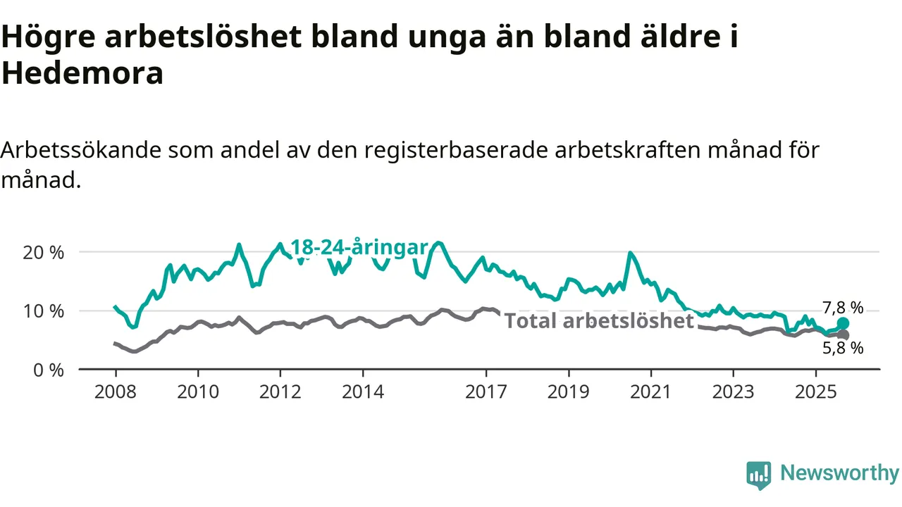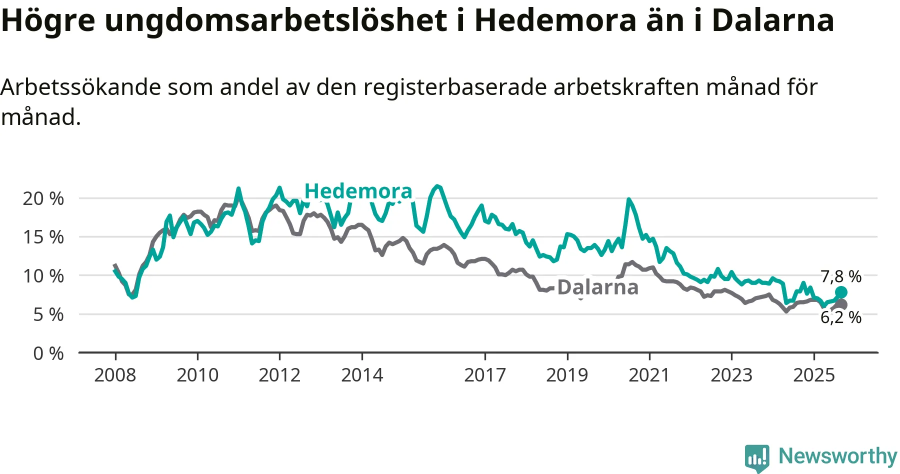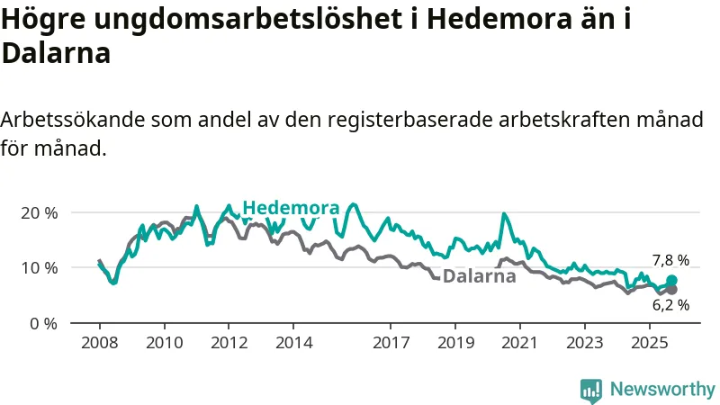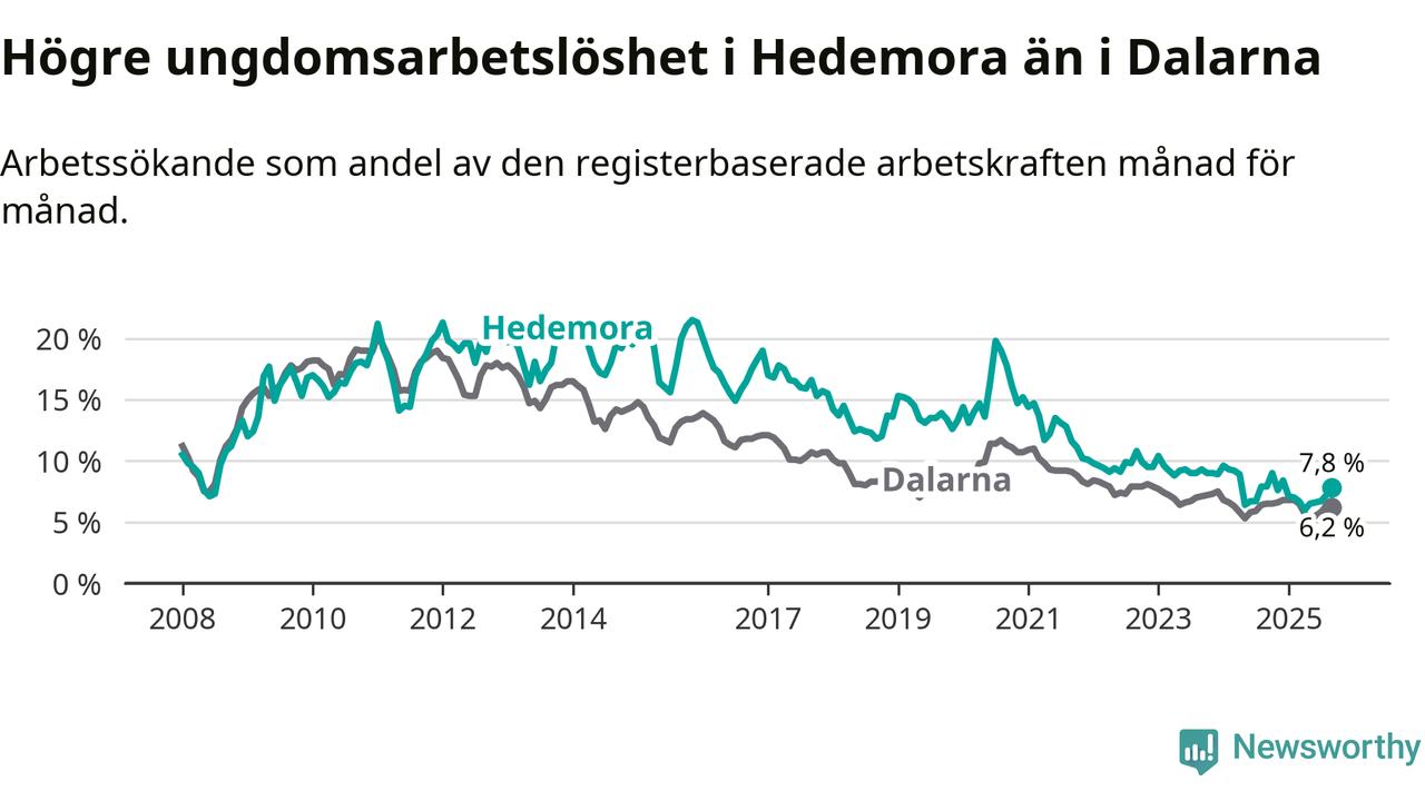 Precis som den totala arbetslösheten ligger ungdomsarbetslösheten i Hedemora högre än i Dalarna som helhet. Skillnaden mellan kommunen och länet är 1,6 procentenheter.
