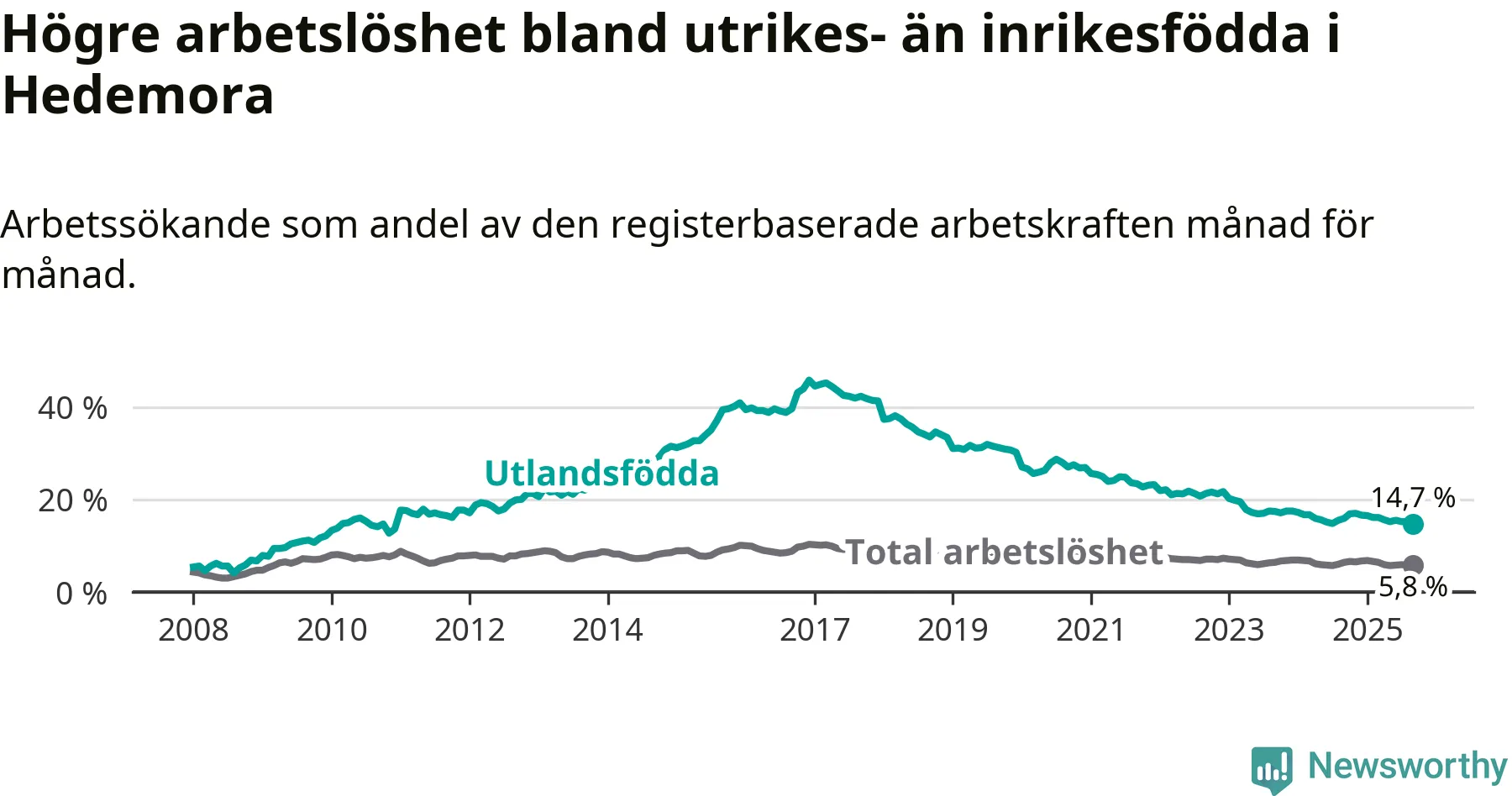 Skillnaden i arbetslöshet mellan utrikesfödda och hela befolkningen är 8,9 procentenheter i Hedemora. Det är en mindre skillnad än för ett år sedan (−0,6 procentenheter).