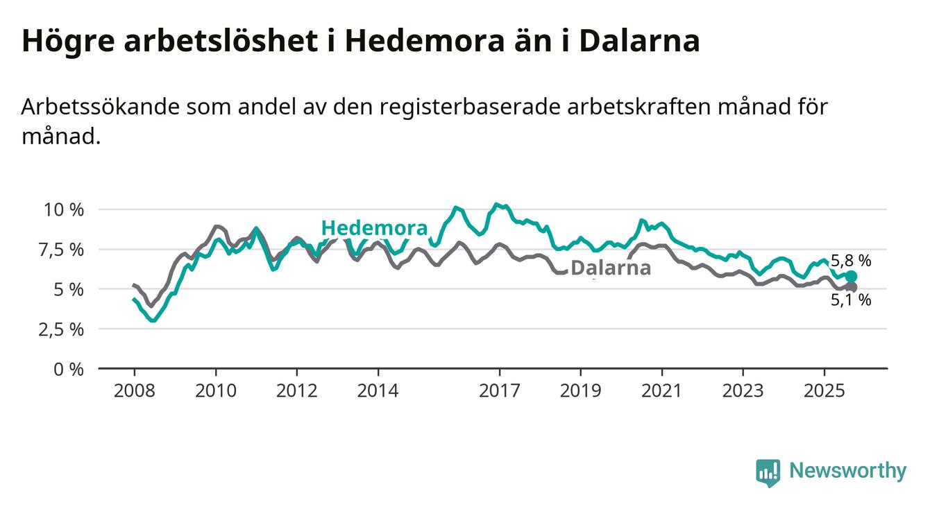 Under september månad rapporterade Hedemora kommun en total arbetslöshet på 5,8 procent. Det är en minskning jämfört med samma tidpunkt i fjol (−0,6 procentenheter). Även i Dalarnas län sjunker arbetslösheten .