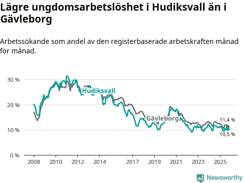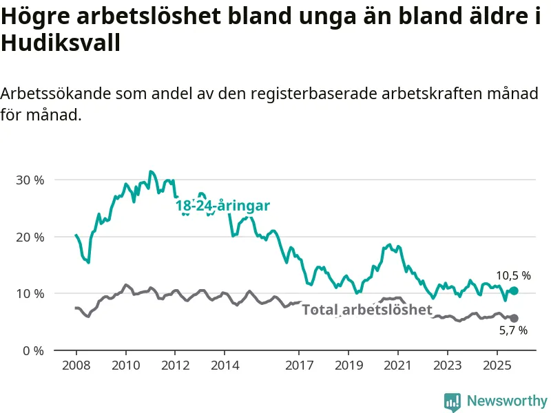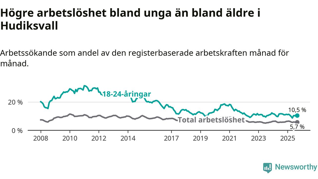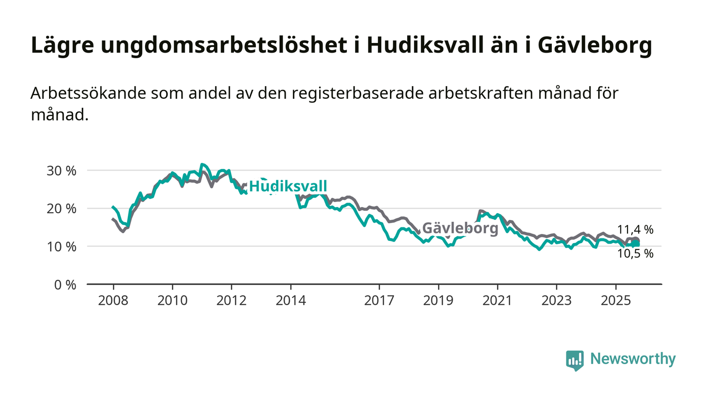 I och med den senaste månadens nedgång har de ungas arbetslöshet i Hudiksvall sjunkit elva månader i följd (ner från 11,0 procent i oktober 2024 till 10,5 procent nu).