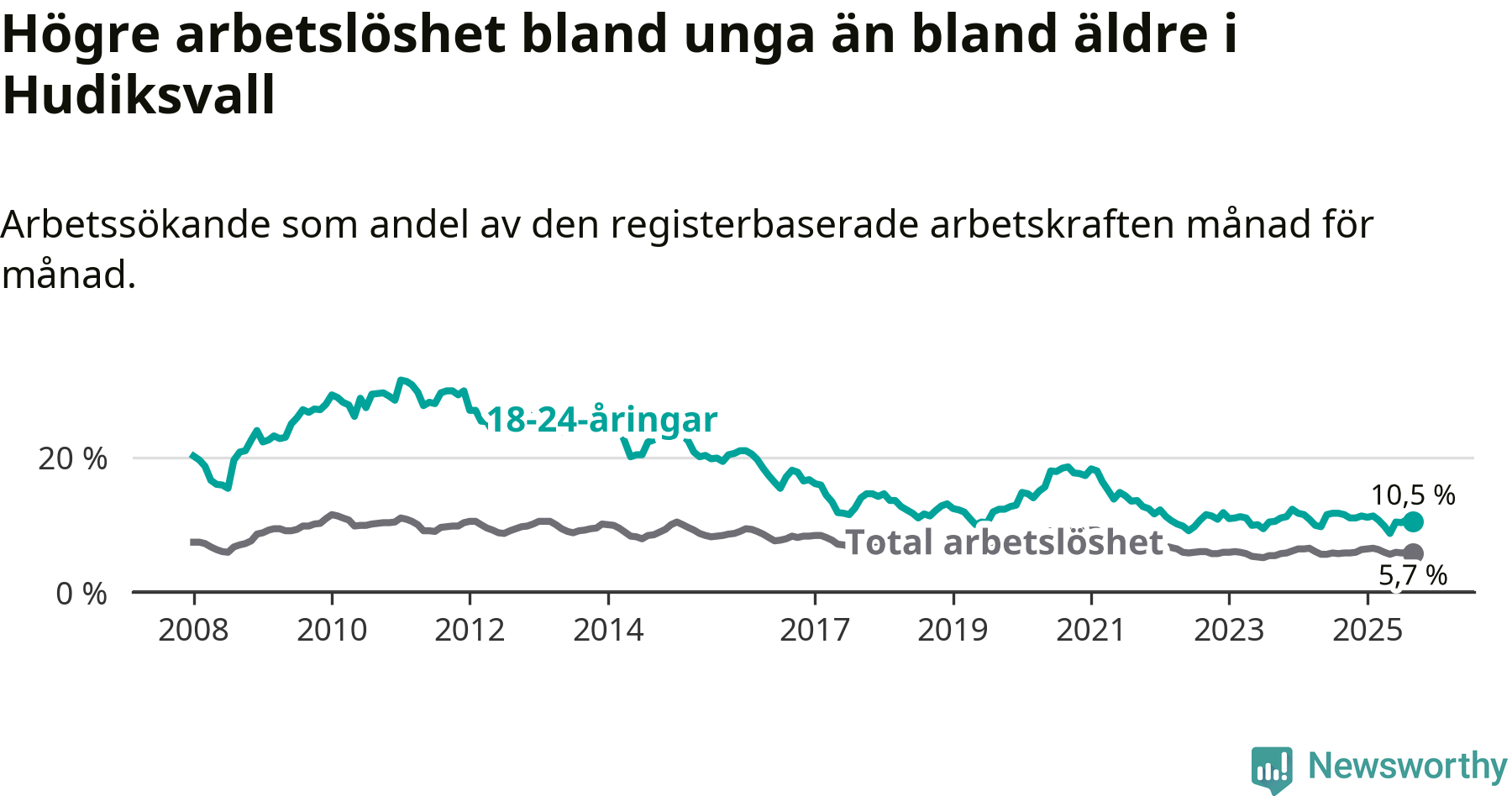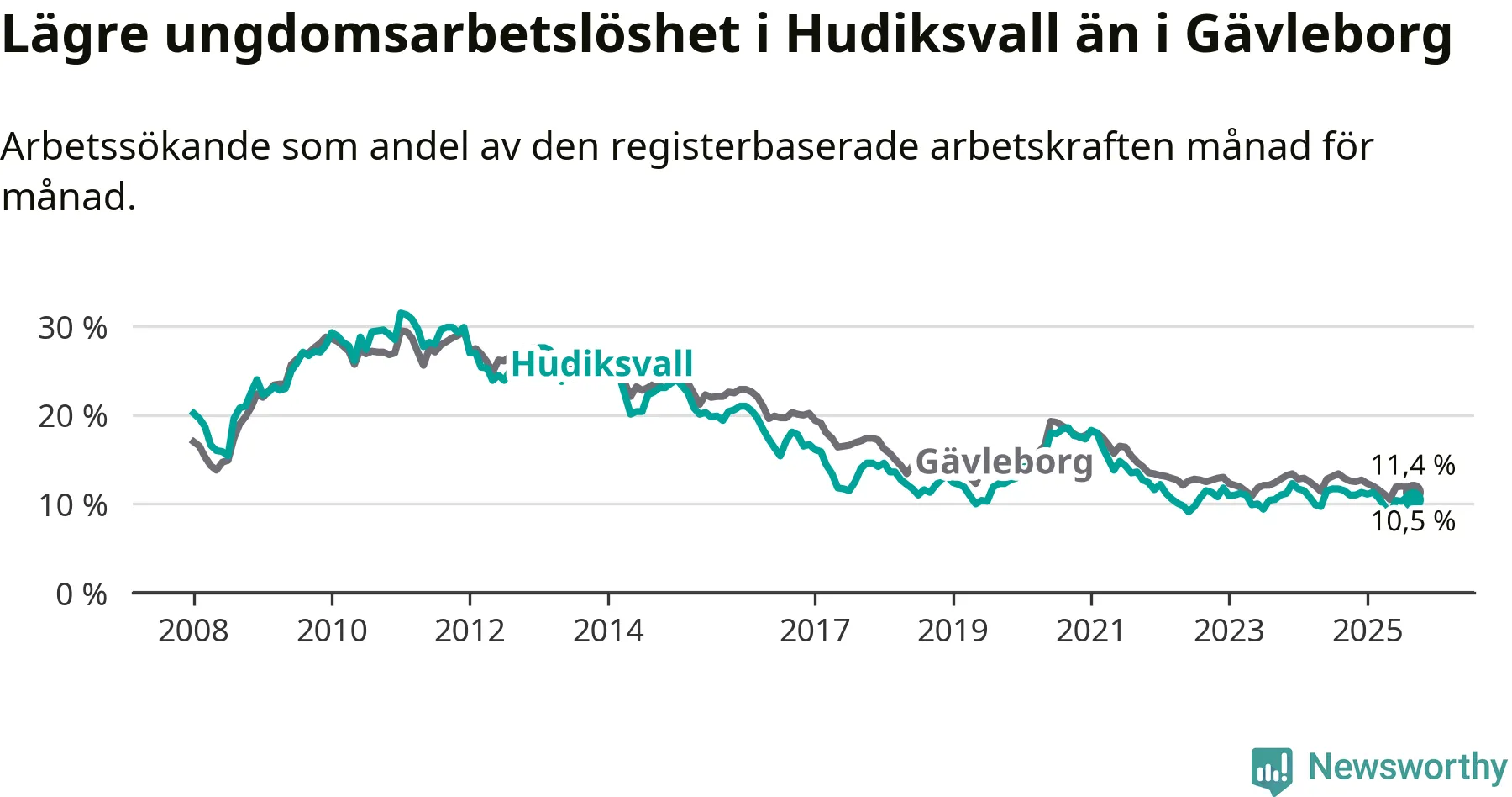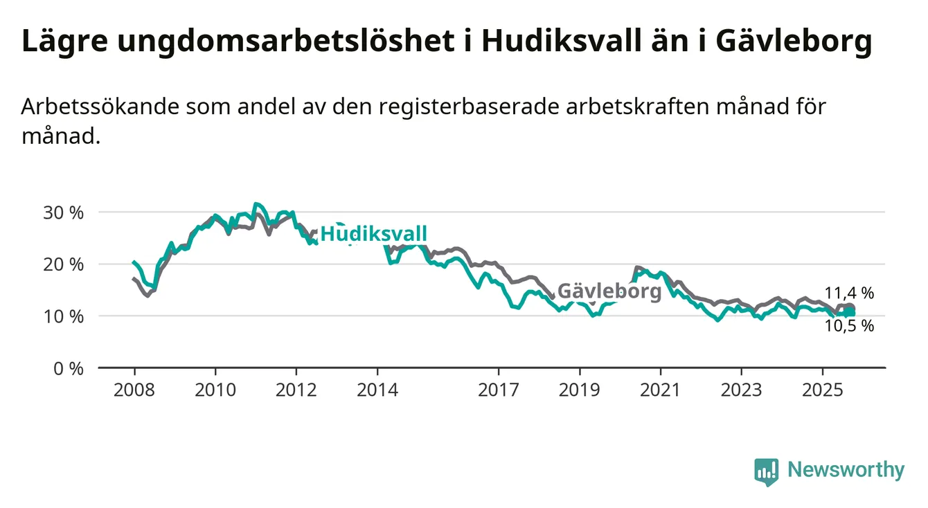I och med den senaste månadens nedgång har de ungas arbetslöshet i Hudiksvall sjunkit elva månader i följd (ner från 11,0 procent i oktober 2024 till 10,5 procent nu).