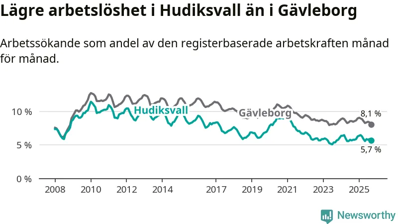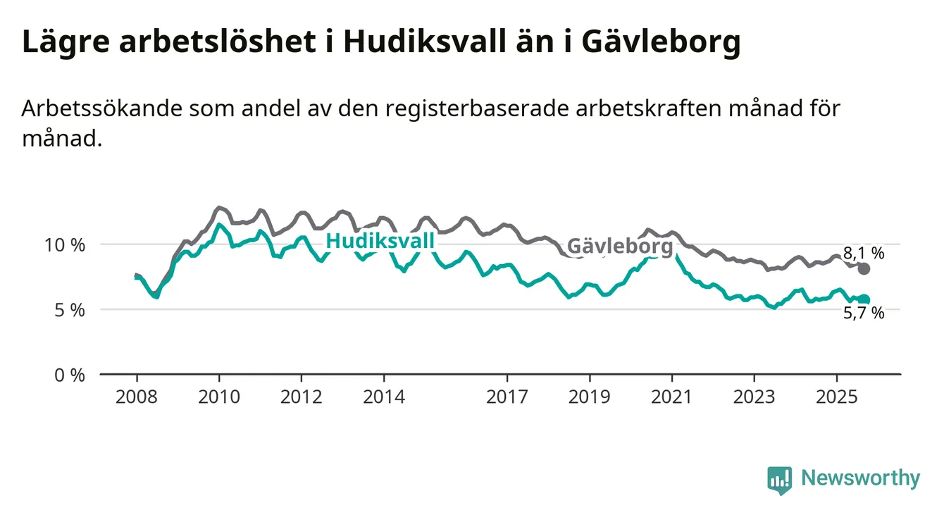Hudiksvall hade redan tidigare lägre arbetslöshet än snittet i hela Gävleborgs län och nu växer klyftan (5,7 procent i kommunen, jämfört med 8,1 procent i hela länet). Hudiksvall har därmed även den lägsta arbetslöshetsnivån i länet. Söderhamn har den högsta (9,5 procent).