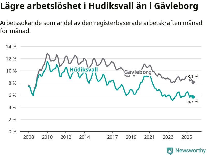 Under september månad rapporterade Hudiksvalls kommun en total arbetslöshet på 5,7 procent. Det är en minskning jämfört med samma tidpunkt i fjol (−0,1 procentenheter). Även i Gävleborgs län sjunker arbetslösheten .