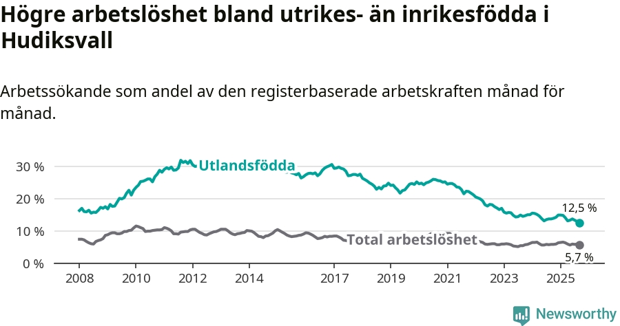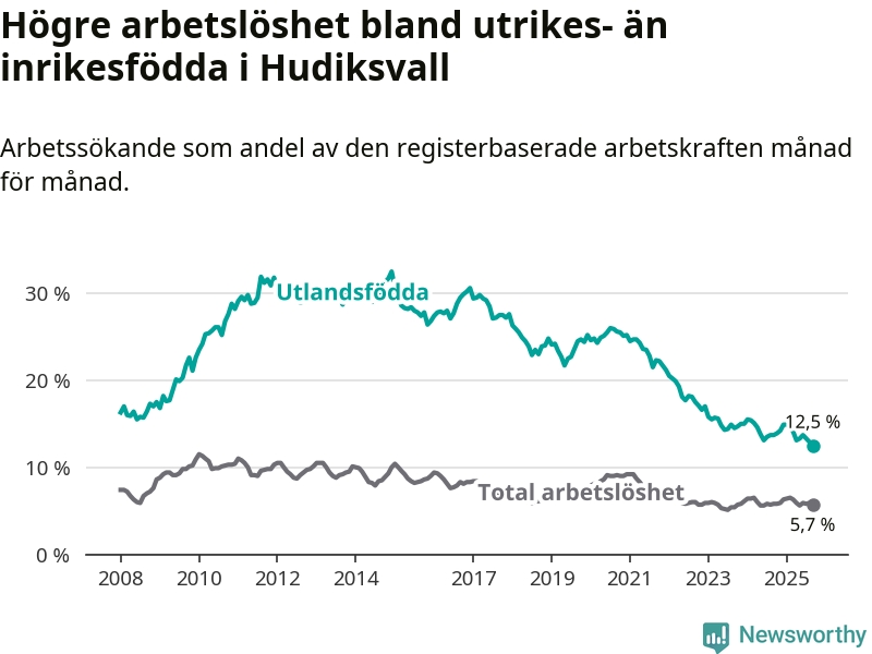 Arbetslösheten bland utlandsfödda var 12,5 procent i Hudiksvall under september månad, motsvarande 287 av 2 296 personer. Det är 1,2 procentenheter färre än vid samma tidpunkt i fjol (−27 om man räknar personer). Den nuvarande arbetslöshetsnivån är den lägsta sedan januari 2008.