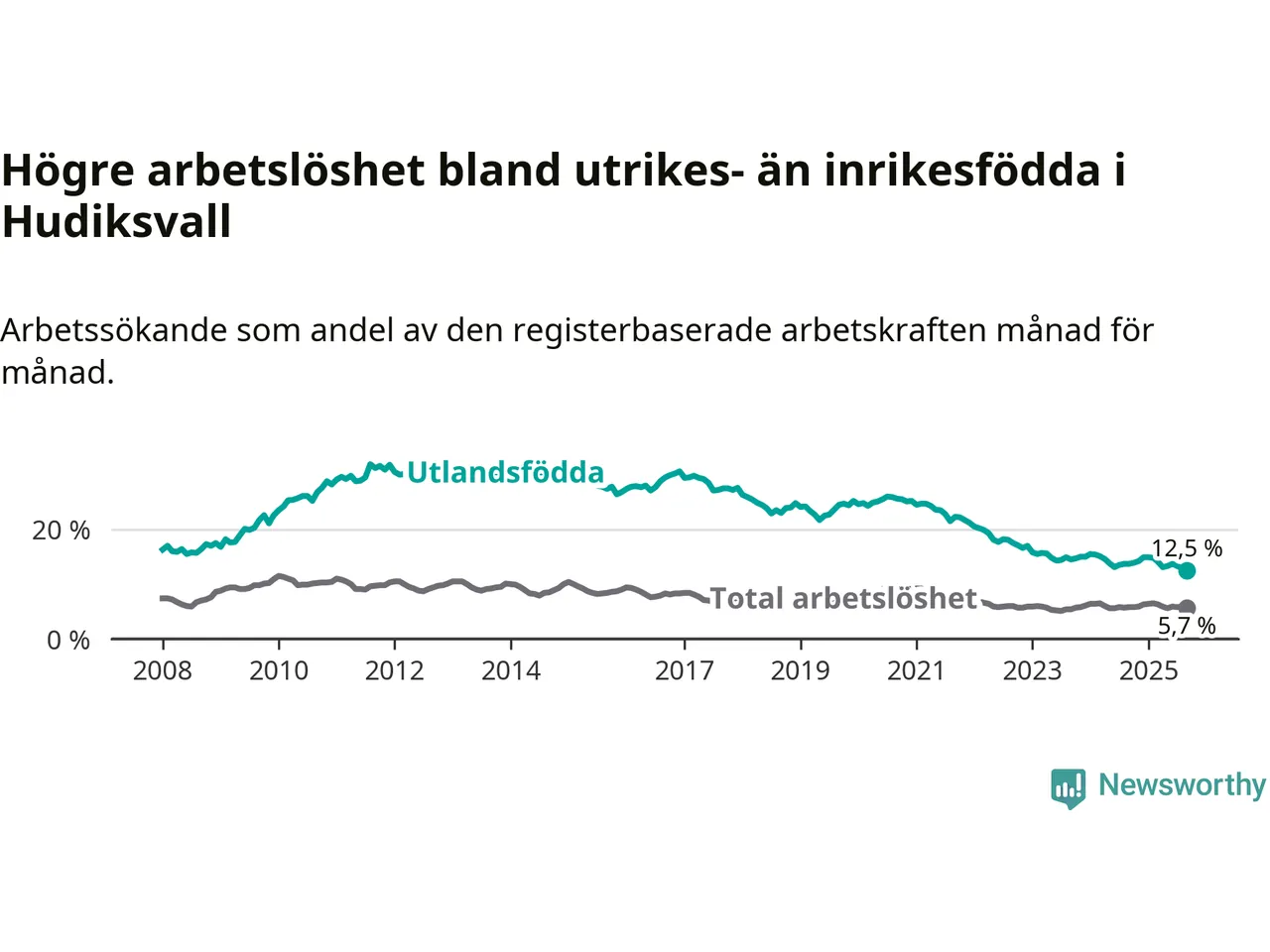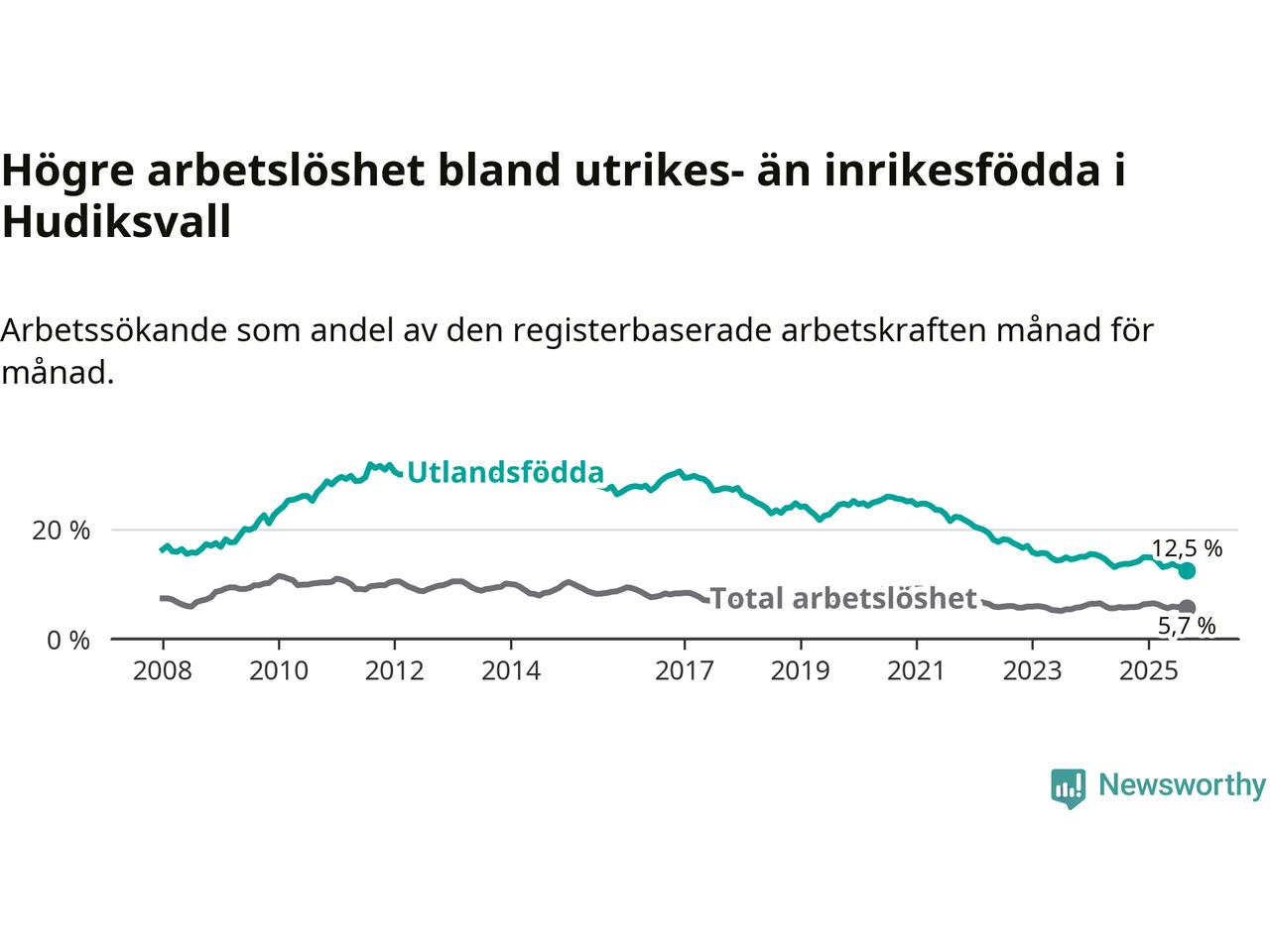 Skillnaden i arbetslöshet mellan utrikesfödda och hela befolkningen är 6,8 procentenheter i Hudiksvall. Det är en mindre skillnad än för ett år sedan (−1,1 procentenheter).