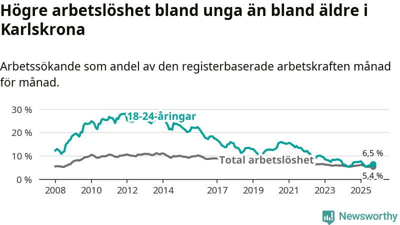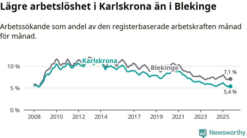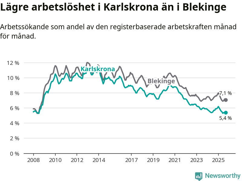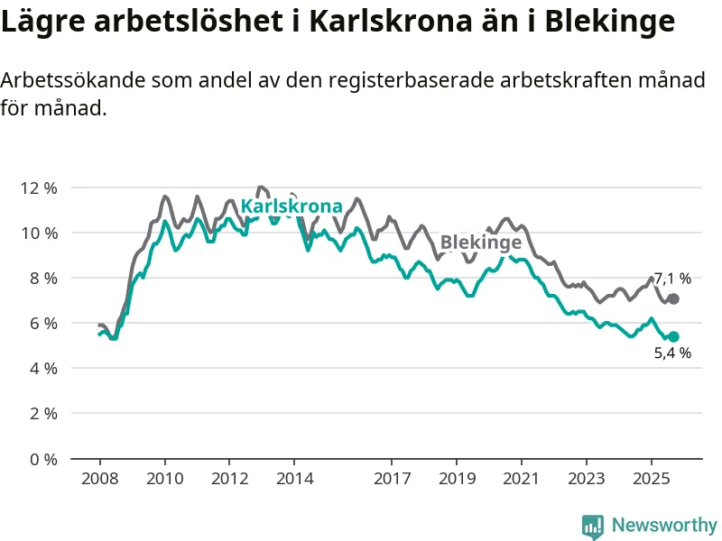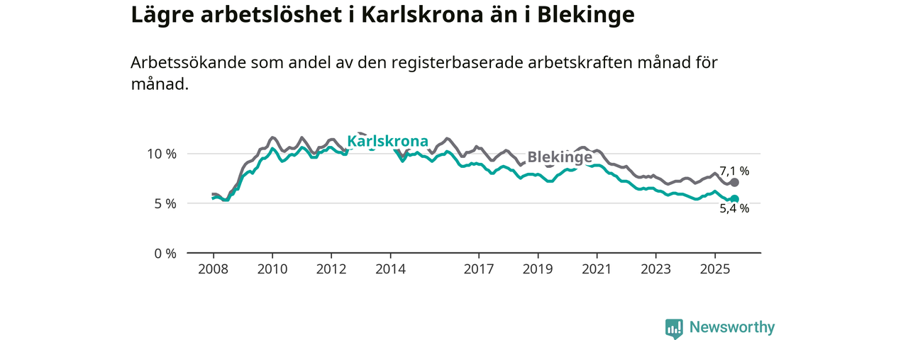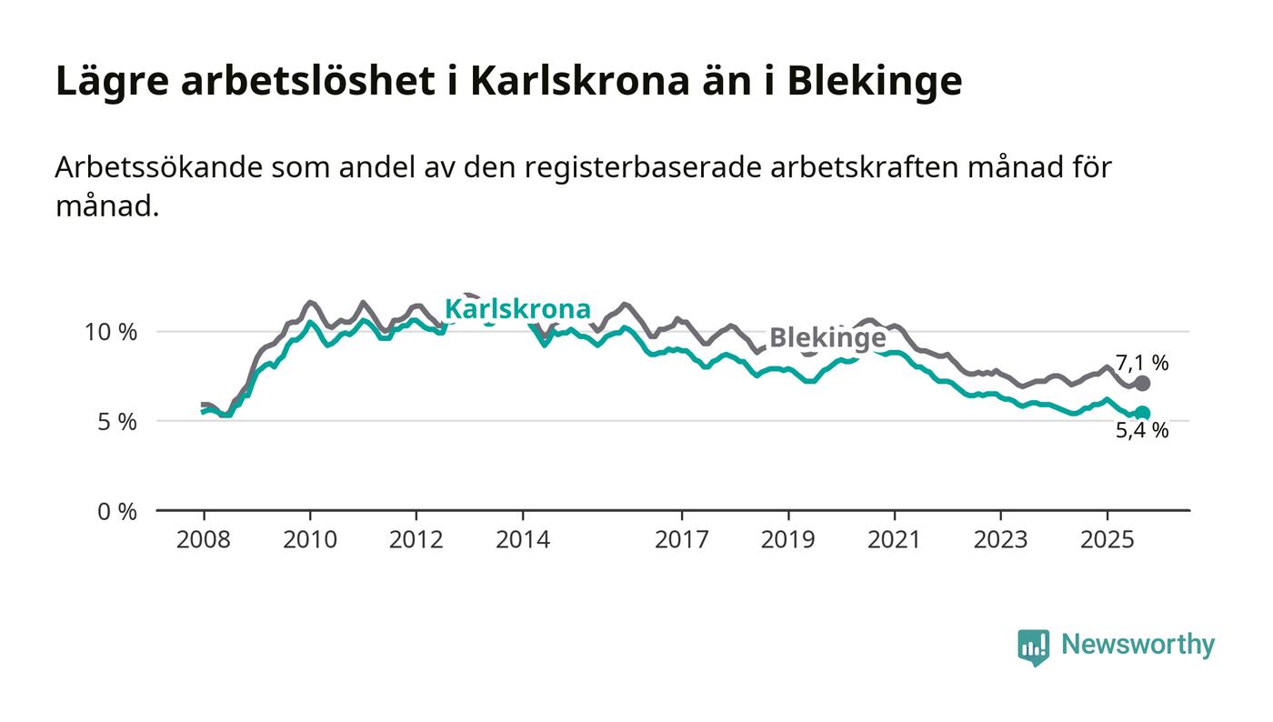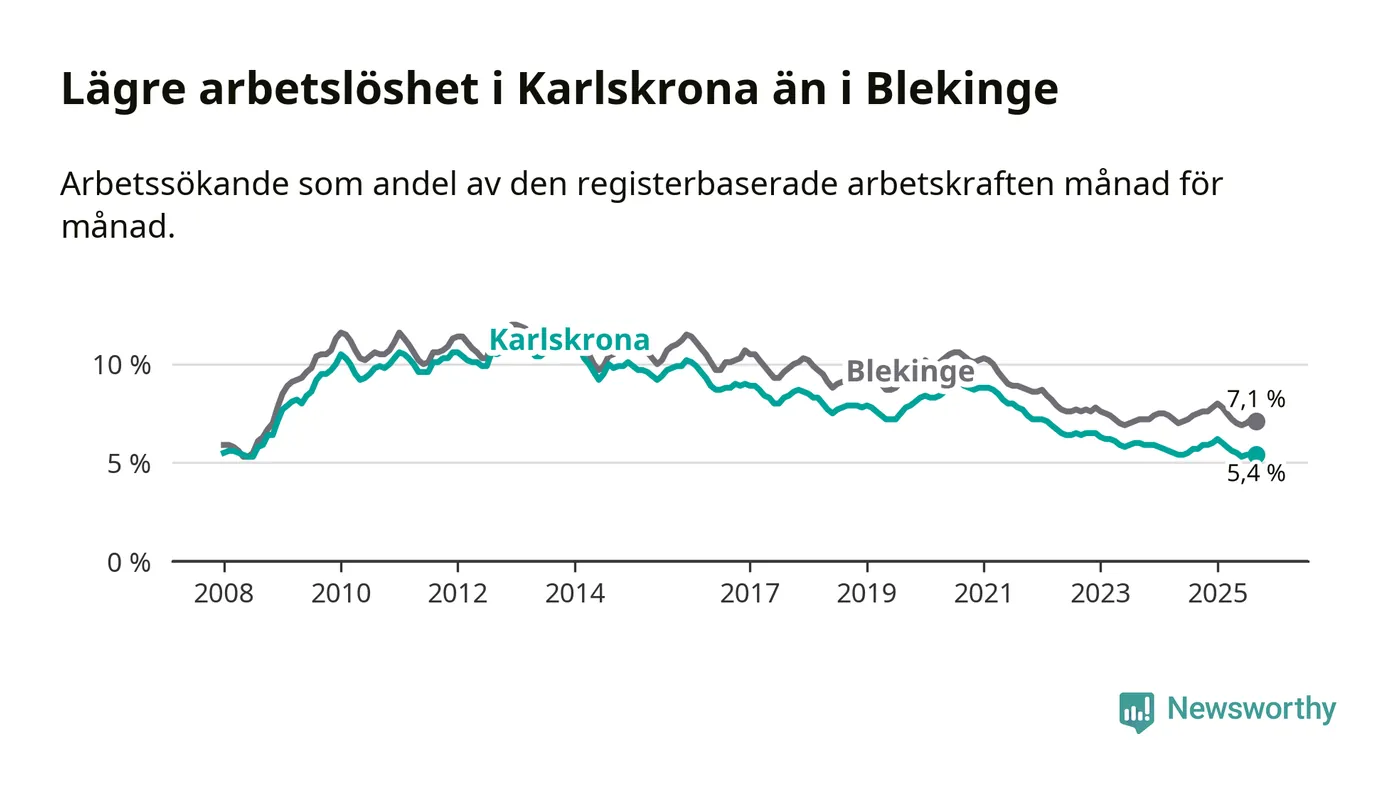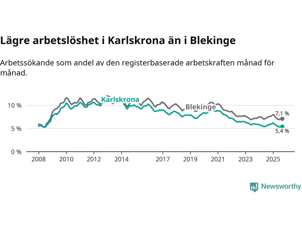 Under september månad rapporterade Karlskrona kommun en total arbetslöshet på 5,4 procent. Det är en minskning jämfört med samma tidpunkt i fjol (−0,3 procentenheter). Även i Blekinge län sjunker arbetslösheten .