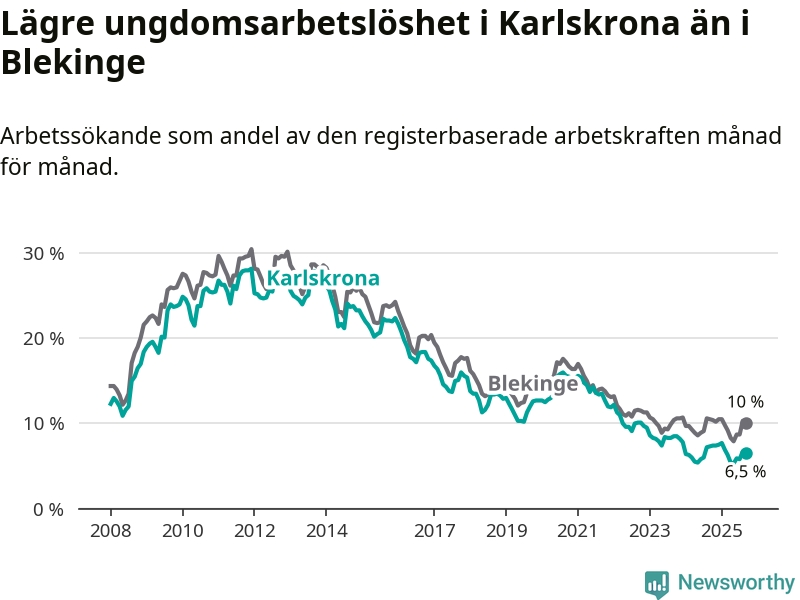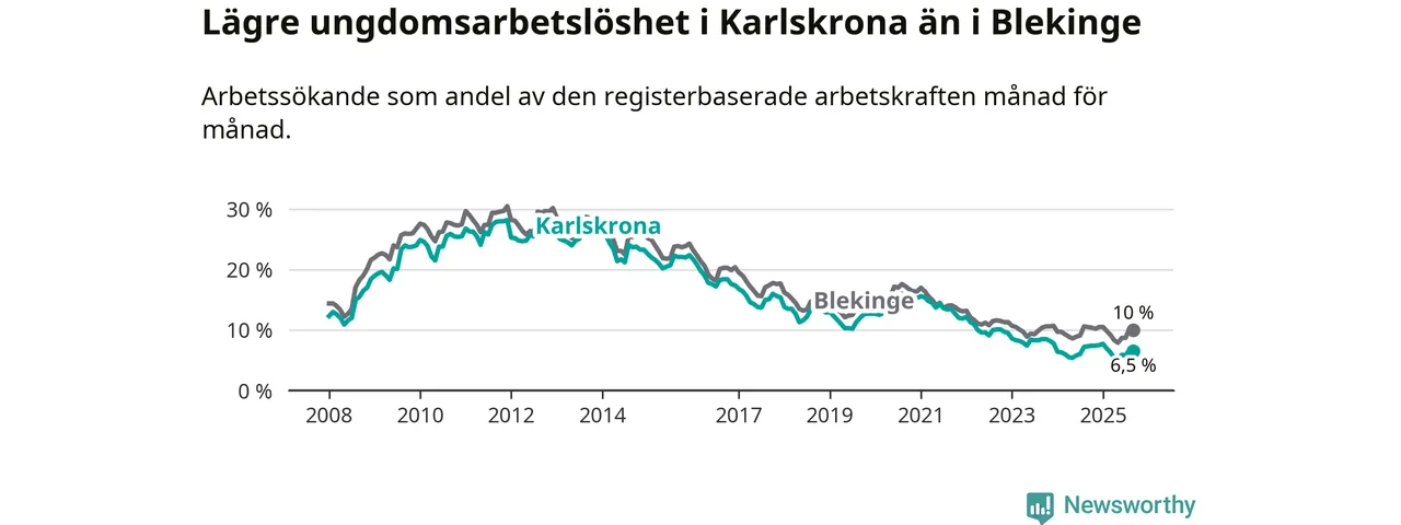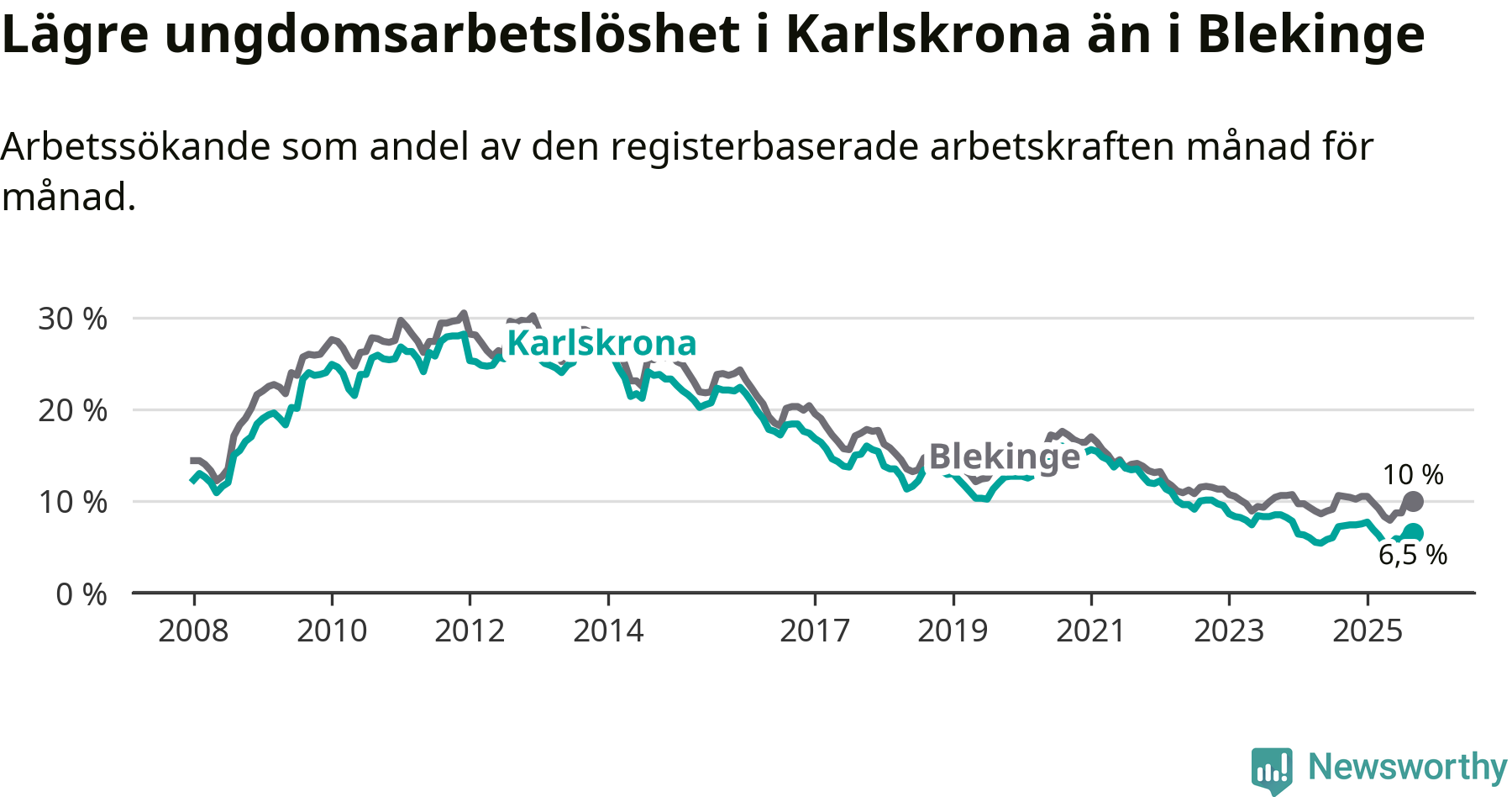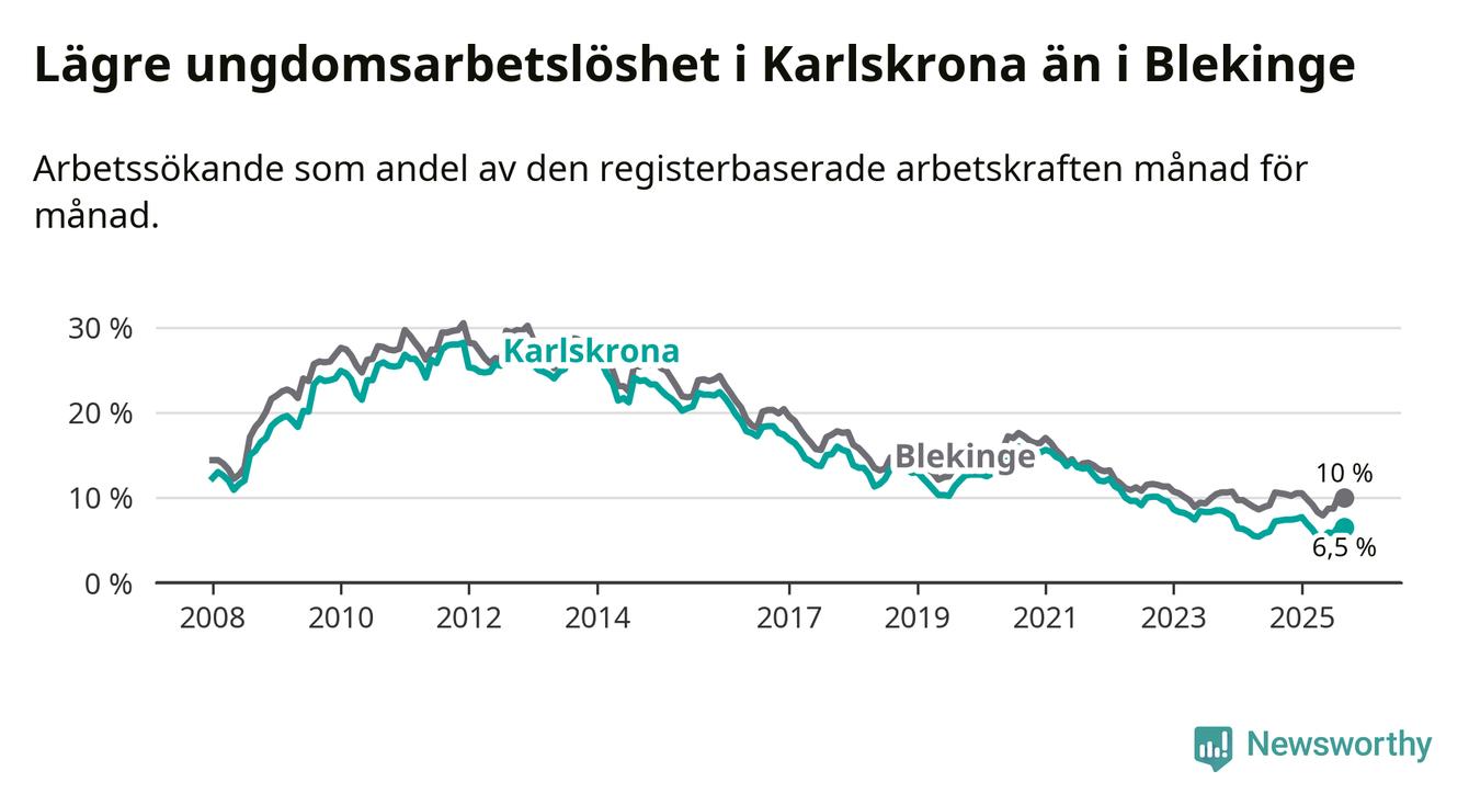 Precis som den totala arbetslösheten ligger ungdomsarbetslösheten i Karlskrona lägre än i Blekinge som helhet. Skillnaden mellan kommunen och länet är 3,5 procentenheter.
