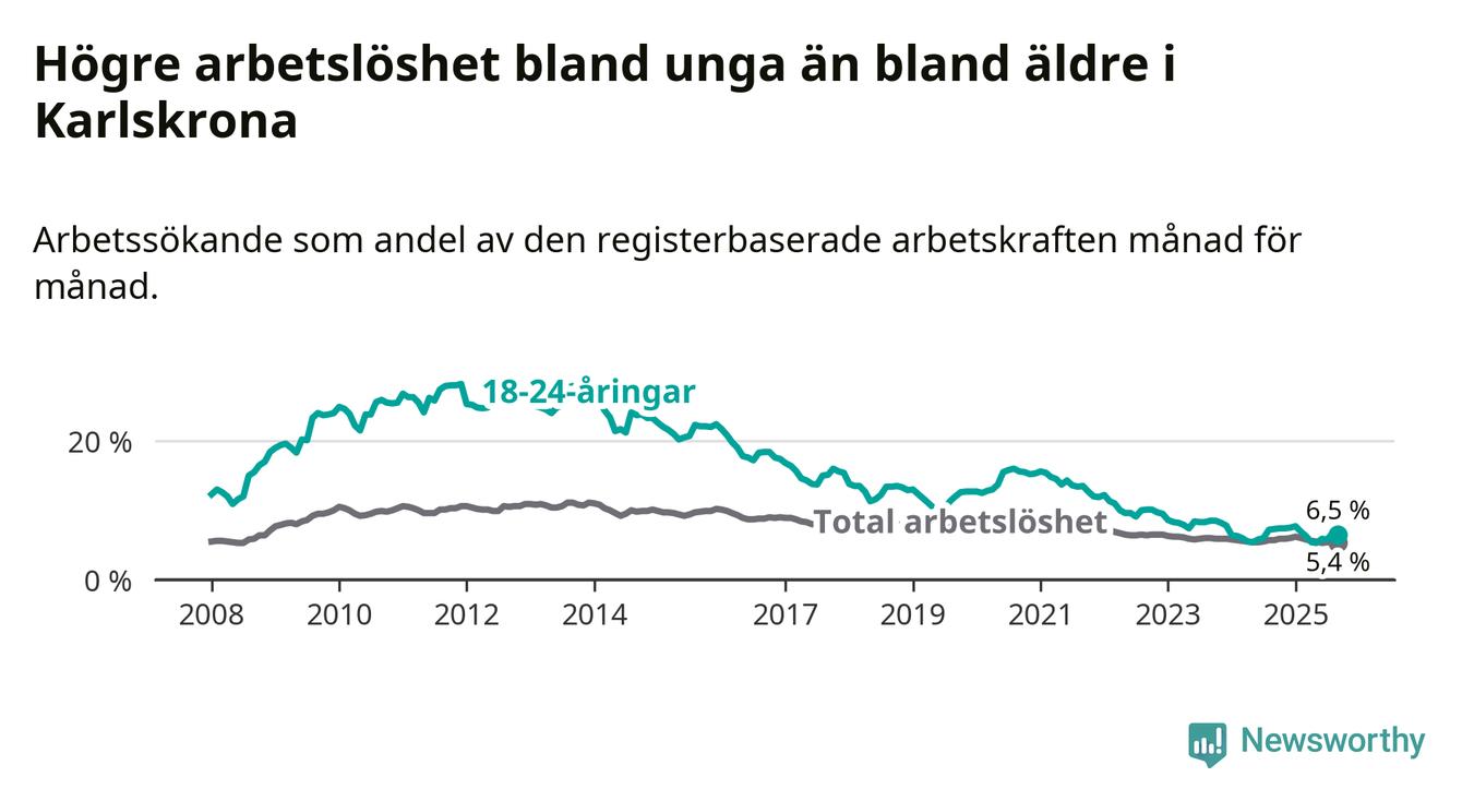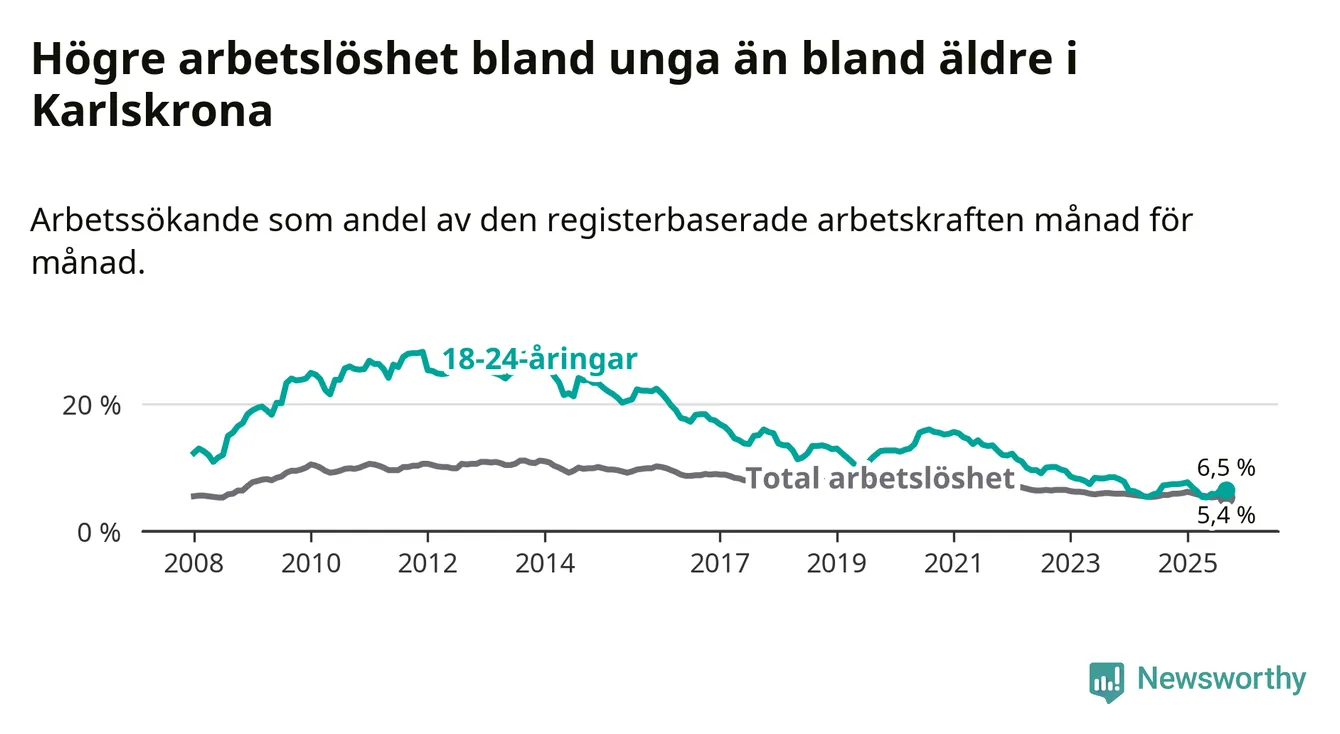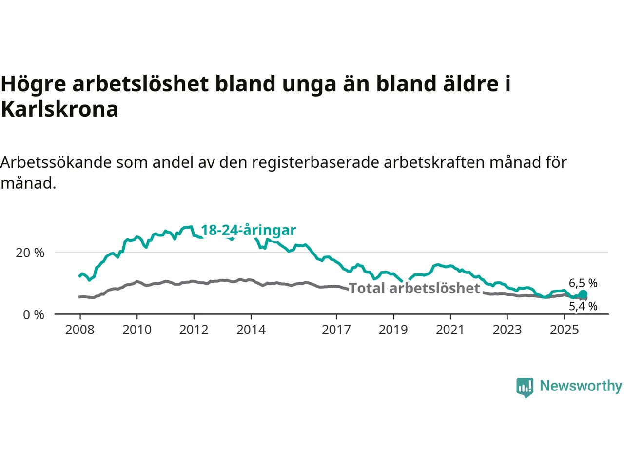 Precis som den totala arbetslösheten ligger ungdomsarbetslösheten i Karlskrona lägre än i Blekinge som helhet. Skillnaden mellan kommunen och länet är 3,5 procentenheter.