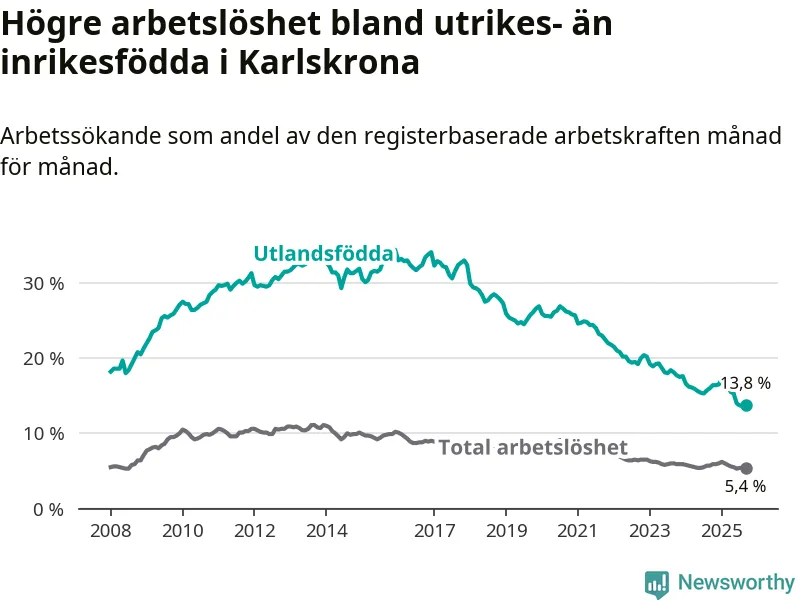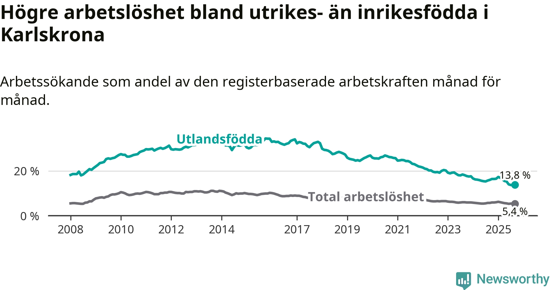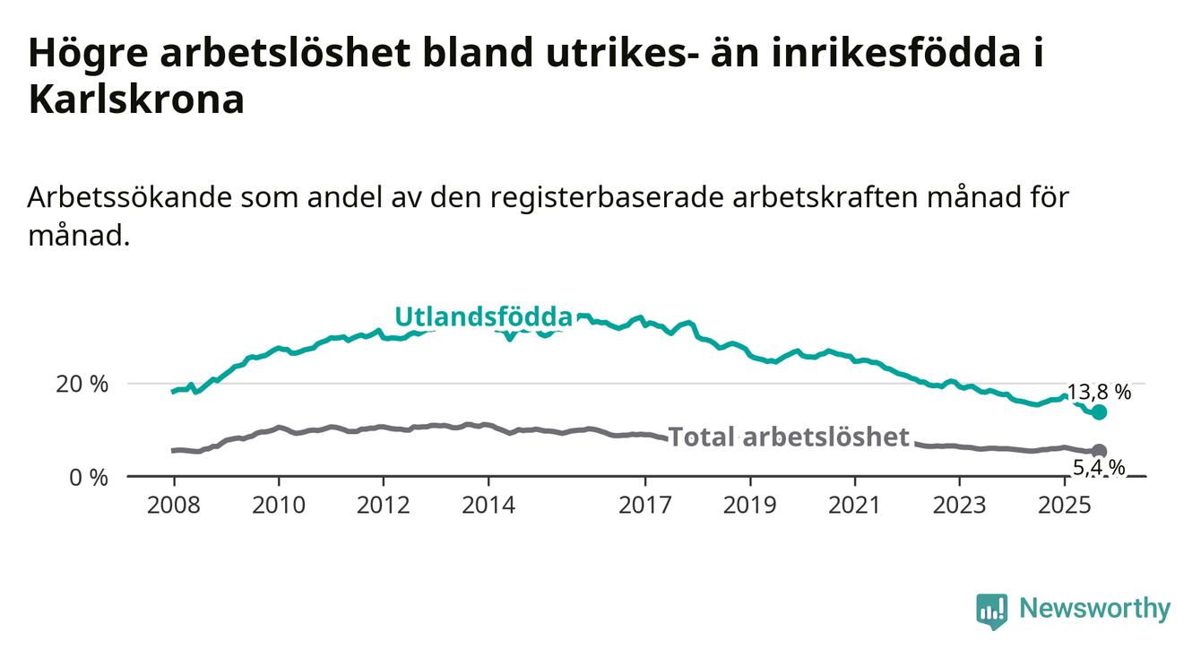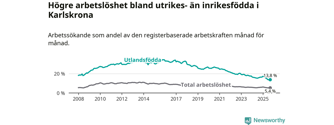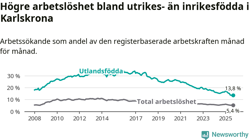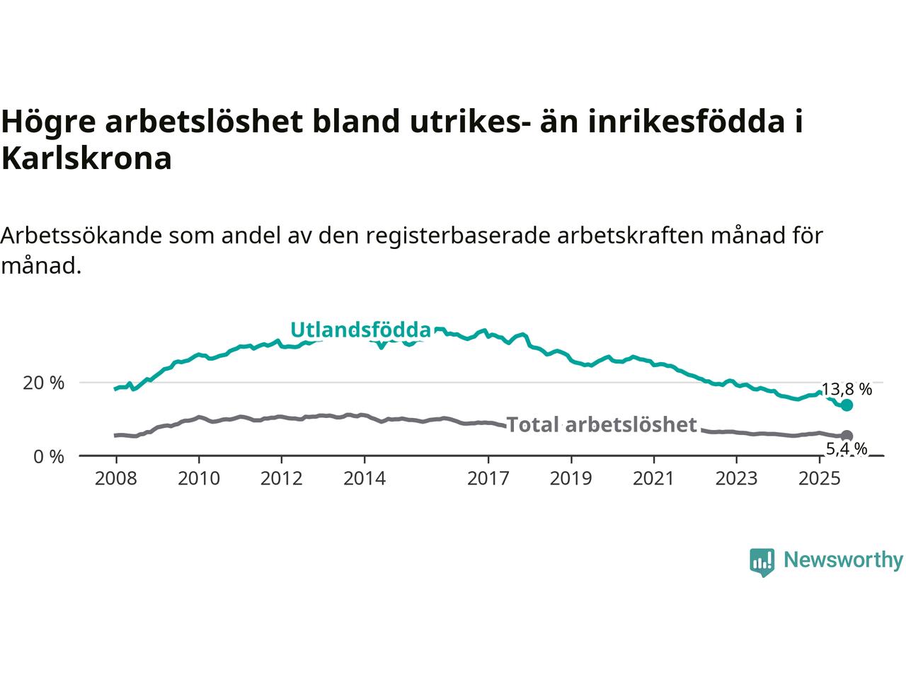 Arbetslösheten bland utlandsfödda var 13,8 procent i Karlskrona under september månad, motsvarande 730 av 5 290 personer. Det är 2,2 procentenheter färre än vid samma tidpunkt i fjol (−111 om man räknar personer). Därmed är de utlandsföddas arbetslöshet lägre än vid samma tidpunkt i fjol för sjätte månaden i följd. Sedan mars har arbetslösheten bland utlandsfödda minskat från 16,3 till 13,8 procent.
