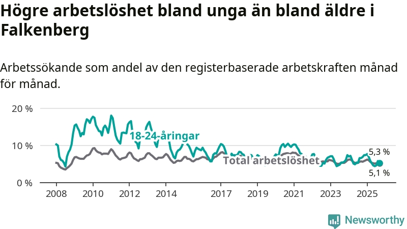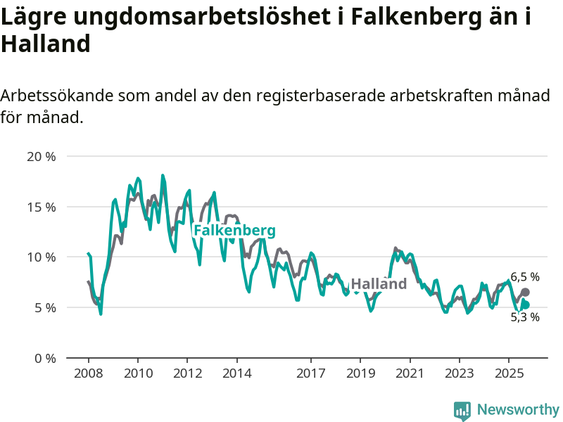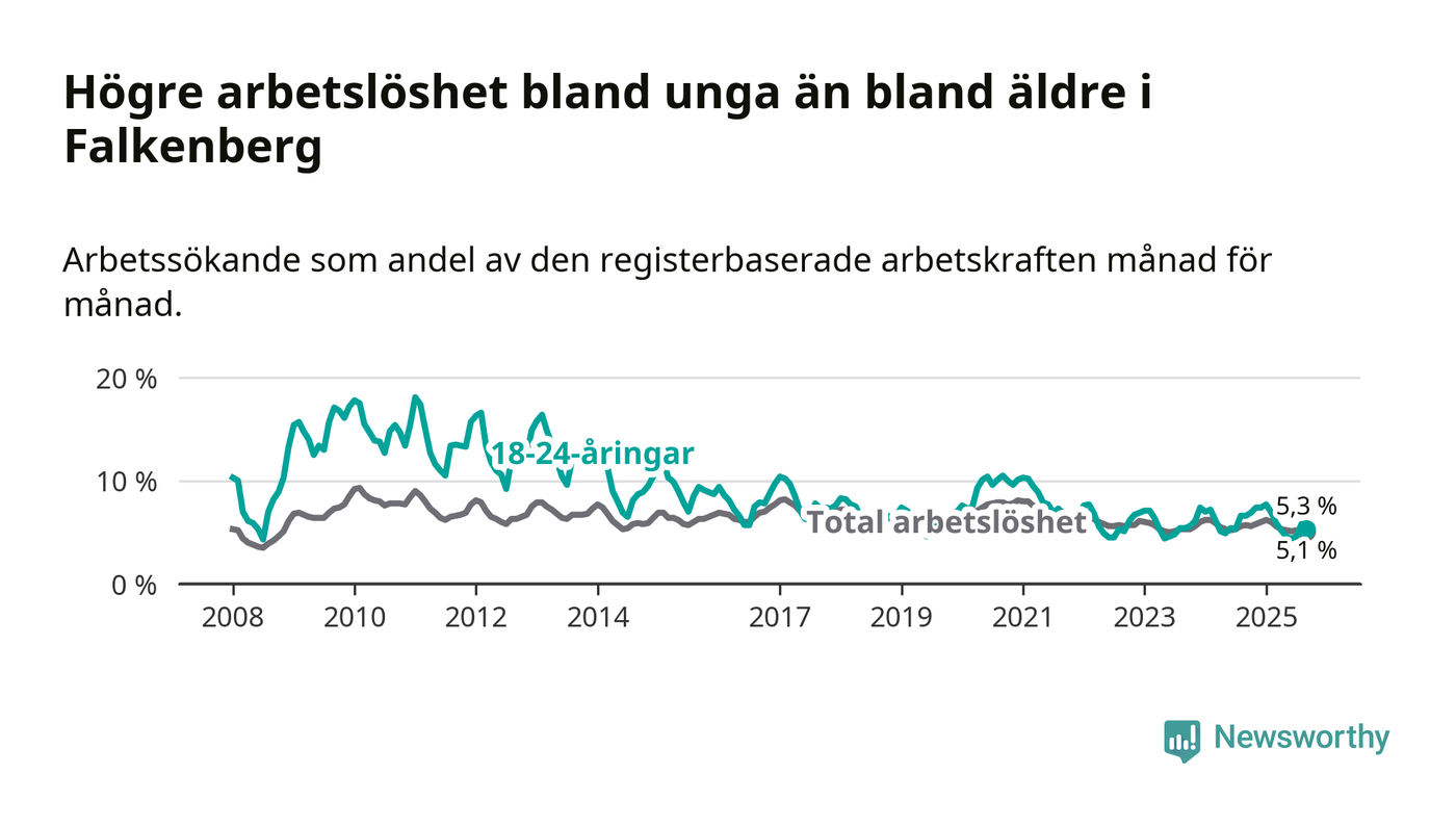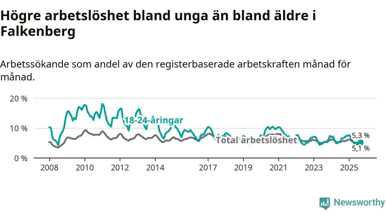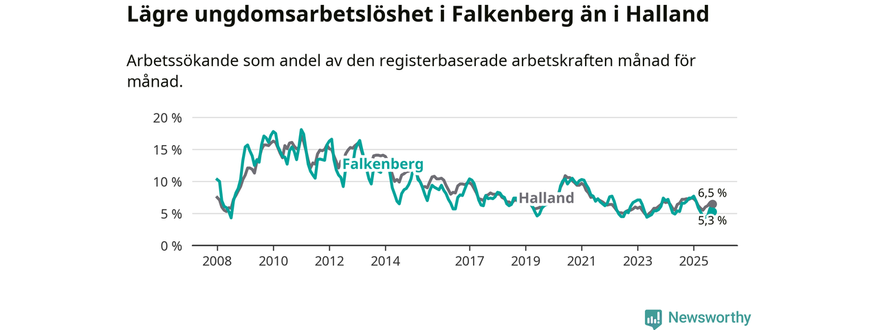 Graf: Arbetslöshet bland unga i Falkenbergs kommun och Hallands län