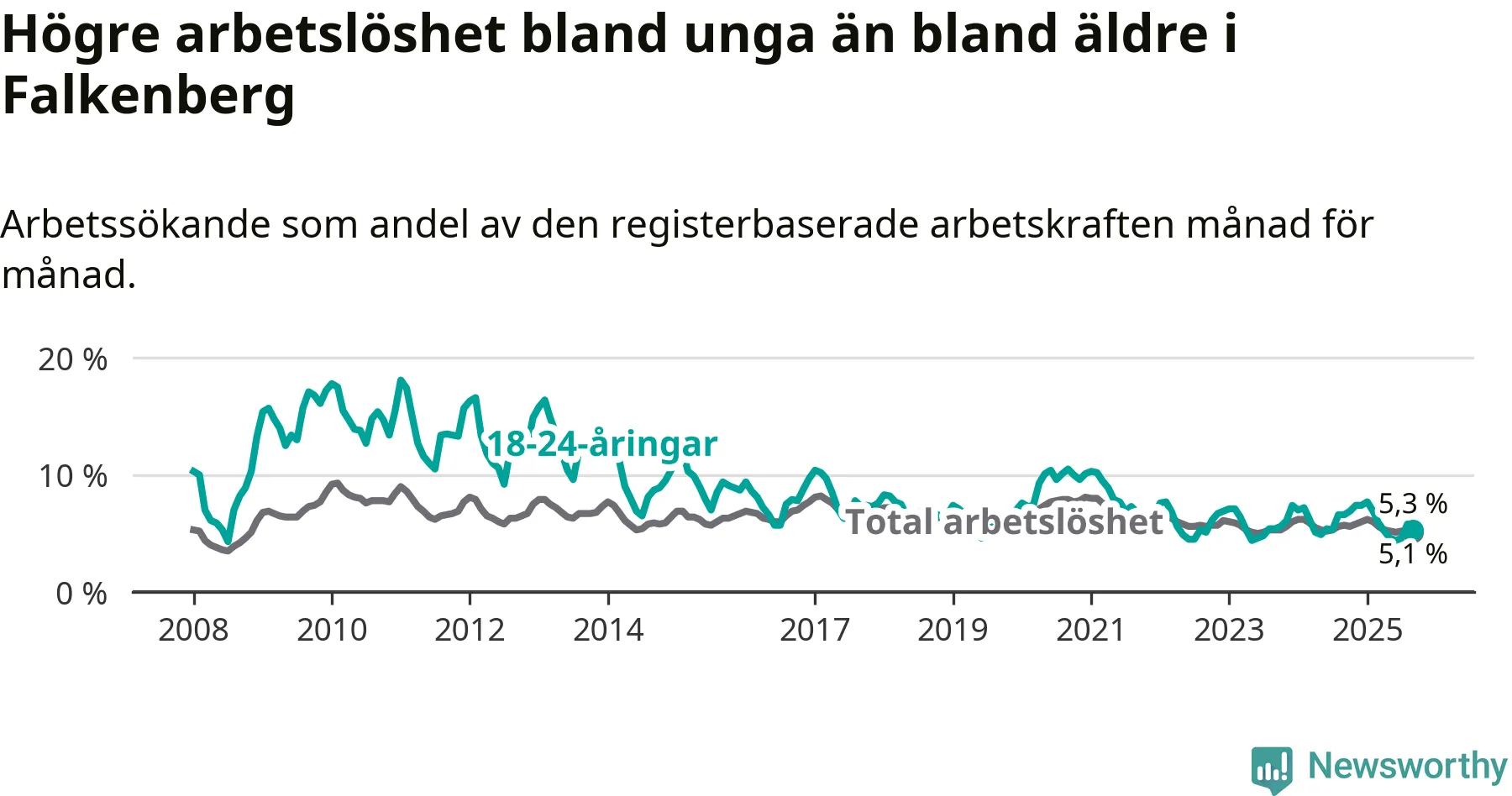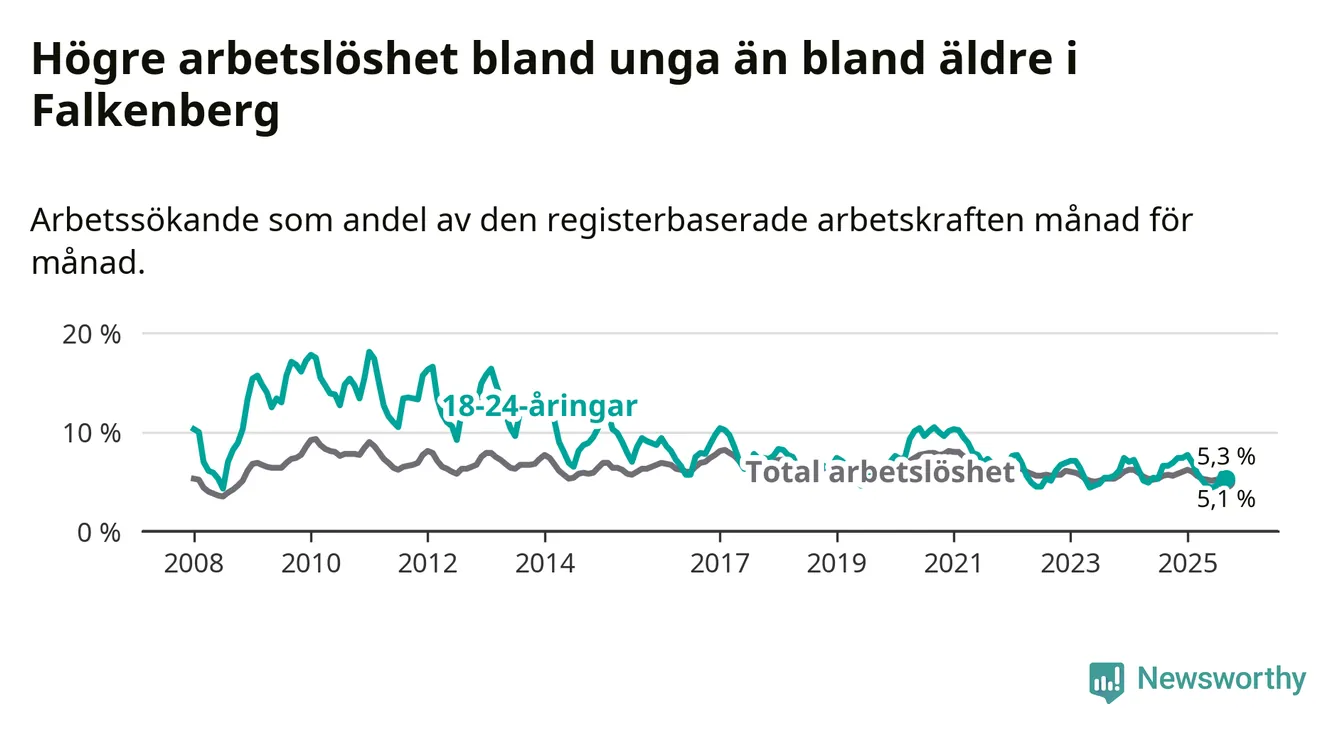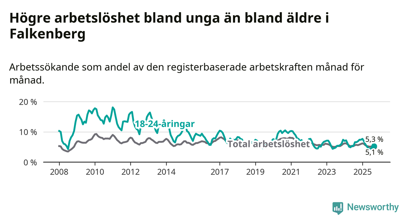 Graf: Arbetslöshet bland unga i Falkenbergs kommun och Hallands län
