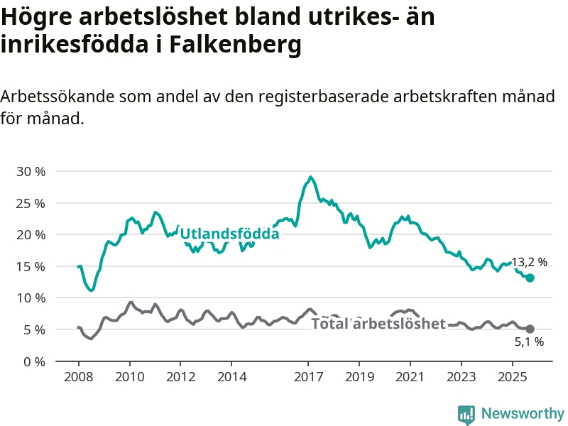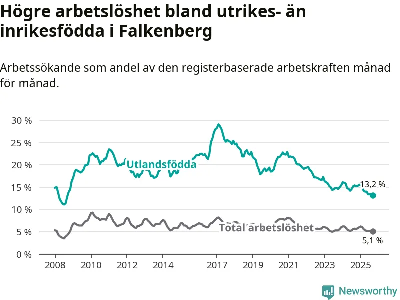 Arbetslösheten bland utlandsfödda var 13,2 procent i Falkenberg under september månad, motsvarande 578 av 4 379 personer. Det är 2,2 procentenheter färre än vid samma tidpunkt i fjol (−92 om man räknar personer). Därmed är de utlandsföddas arbetslöshet lägre än vid samma tidpunkt i fjol för nionde månaden i följd. Sedan december 2024 har arbetslösheten bland utlandsfödda minskat från 15,5 till 13,2 procent. Den nuvarande arbetslöshetsnivån är den lägsta sedan september 2008.