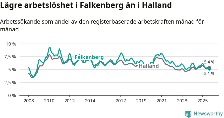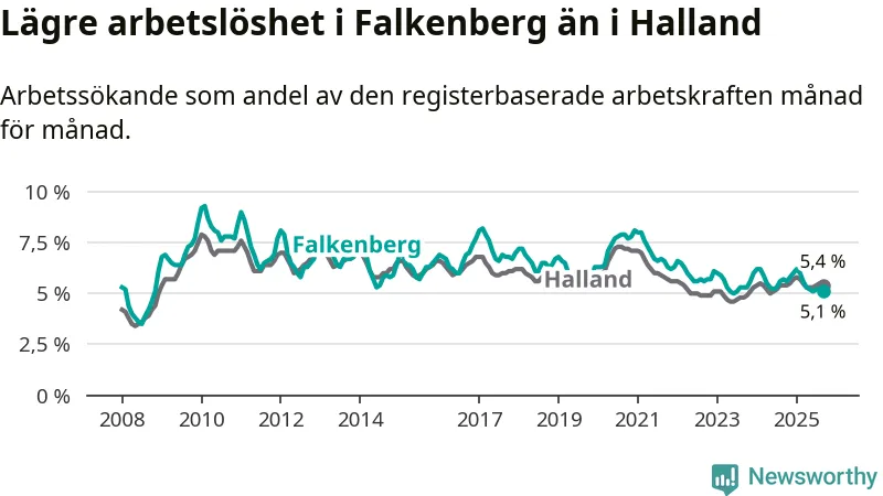 Under september månad rapporterade Falkenbergs kommun en total arbetslöshet på 5,1 procent. Det är en minskning jämfört med samma tidpunkt i fjol (−0,6 procentenheter). I Hallands län däremot står arbetslösheten stilla.